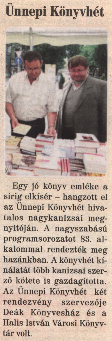 Nyilvános 1966 | 5115 | Nagykanizsai Maraton 2012. június 15. 23. szám 1. oldal - Ünnepi Könyvhét | Ünnepi Könyvhét Egy jó könyv emléke a sírig elkísér - hangzott el az Ünnepi Könyvhét hivatalos nagykanizsai megnyitóján. A nagyszabású programsorozatot 83. alkalommal rendezték meg hazánkban. A könyvhét kínálatát több kanizsai szerző kötete is gazdagította. Az Ünnepi Könyvhét két rendezvény szervezője Deák Könyvesház és a Halis István Városi Könyvtár volt. |