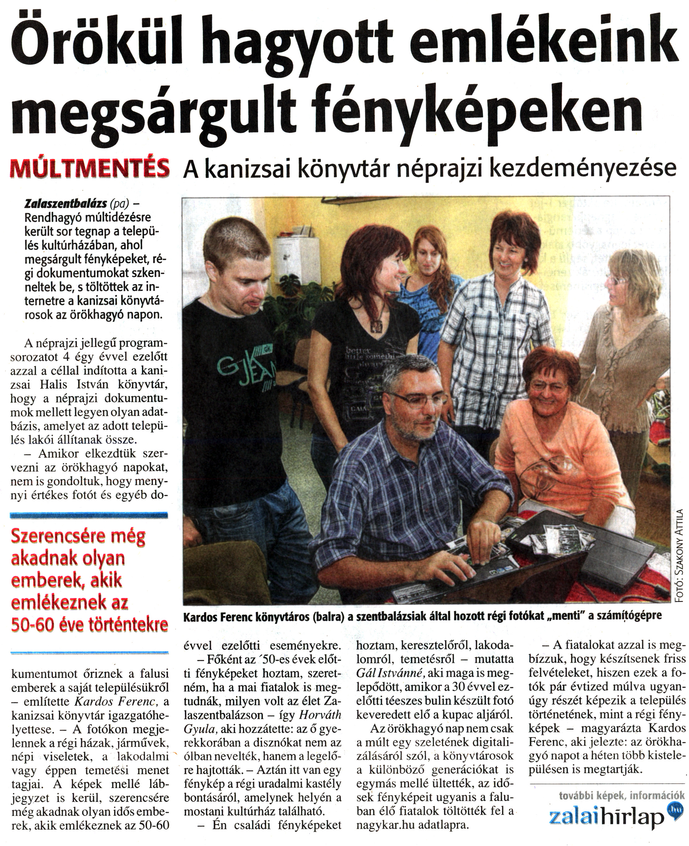 Nyilvános 1832 | 4141 | Zalai Hírlap 2012. október 2. 231. szám 4. oldal - Örökül hagyott emlékeink megsárgult fényképeken | Örökül hagyott emlékeink megsárgult fényképeken MÚLTMENTÉS A kanizsai könyvtár néprajzi kezdeményezése Kardos Ferenc könyvtáros (balra) a szentbalázsiak által hozott régi fotókat „menti" a számítógépre Zalaszentbalázs (pa) - Rendhagyó múltidézésre került sor tegnap a település kultúrházában, ahol megsárgult fényképeket, régi dokumentumokat szkenneltek be, s töltöttek az internetre a kanizsai könyvtárosok az örökhagyó napon. A néprajzi jellegű programsorozatot 4 égy évvel ezelőtt azzal a céllal indította a kanizsai Halis István könyvtár, hogy a néprajzi dokumentumok mellett legyen olyan adatbázis, amelyet az adott település lakói állítanak össze. - Amikor elkezdtük szervezni az örökhagyó napokat, nem is gondoltuk, hogy menynyi értékes fotót és egyéb dokumentumot őriznek a falusi emberek a saját településükről - említette Kardos Ferenc, a kanizsai könyvtár igazgatóhelyettese. - A fotókon megjelennek a régi házak, járművek, népi viseletek, a lakodalmi vagy éppen temetési menet tagjai. A képek mellé lábjegyzet is kerül, szerencsére még akadnak olyan idős emberek, akik emlékeznek az 50-60 évvel ezelőtti eseményekre. - Főként az \'50-es évek előtti fényképeket hoztam, szeretném, ha a mai fiatalok is megtudnák, milyen volt az élet Zalaszentbalázson - így Horváth Gyula, aki hozzátette: az ő gyerekkorában a disznókat nem az ólban nevelték, hanem a legelőre hajtották. - Aztán itt van egy fénykép a régi uradalmi kastély bontásáról, amelynek helyén a mostani kultúrház található. - Én családi fényképeket hoztam, keresztelőről, lakodalomról, temetésről - mutatta Gál Istvánné, aki maga is meglepődött, amikor a 30 évvel ezelőtti téeszes bulin készült fotó keveredett elő a kupac aljáról. Az örökhagyó nap nem csak a múlt egy szeletének digitalizálásáról szól, a könyvtárosok a különböző generációkat is egymás mellé ültették, az idősek fényképeit ugyanis a faluban élő fiatalok töltötték fel a nagykar.hu adatlapra. - A fiatalokat azzal is megbízzuk, hogy készítsenek friss felvételeket, hiszen ezek a fotók pár évtized múlva ugyanúgy részét képezik a település történetének, mint a régi fényképek - magyarázta Kardos Ferenc, aki jelezte: az örökhagyó napot a héten több kistelepülésen is megtartják. |