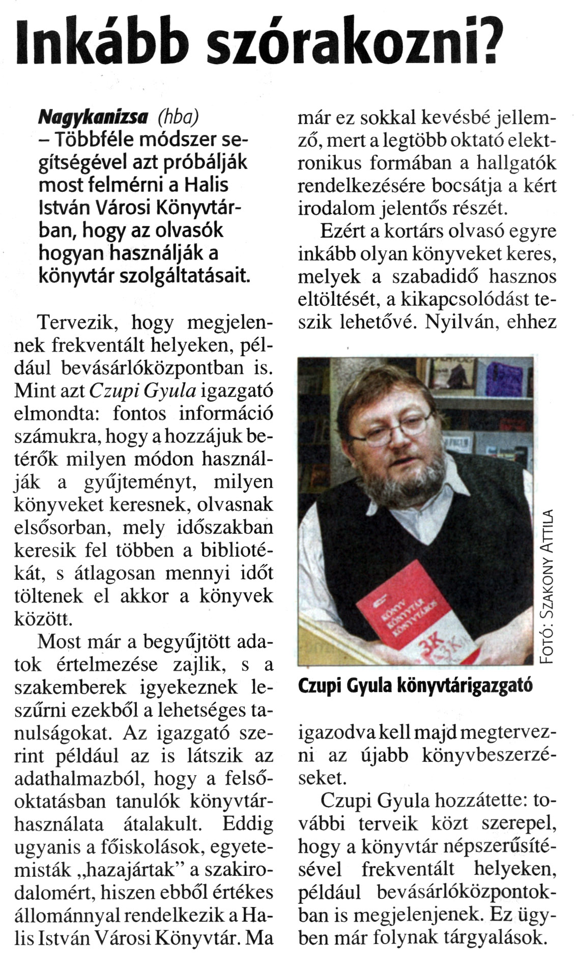 Nyilvános 1794 | 3921 | Zalai Hírlap 2013. január 14. 11. szám 3. oldal - Inkább szórakozni | Inkább szórakozni? Nagykanizsa (hba) - Többféle módszer segítségével azt próbálják most felmérni a Halis István Városi Könyvtárban, hogy az olvasók hogyan használják a könyvtár szolgáltatásait. Tervezik, hogy megjelennek frekventált helyeken, például bevásárlóközpontban is. Mint azt Czupi Gyula igazgató elmondta: fontos információ számukra, hogy a hozzájuk betérők milyen módon használják a gyűjteményt, milyen könyveket keresnek, olvasnak elsősorban, mely időszakban keresik fel többen a bibliotékát, s átlagosan mennyi időt töltenek el akkor a könyvek között. Most már a begyűjtött adatok értelmezése zajlik, s a szakemberek igyekeznek leszűrni ezekből a lehetséges tanulságokat. Az igazgató szerint például az is látszik az adathalmazból, hogy a felsőoktatásban tanulók könyvtárhasználata átalakult. Eddig ugyanis a főiskolások, egyetemisták „hazajártak" a szakirodalomért, hiszen ebből értékes állománnyal rendelkezik a Halis István Városi Könyvtár. Ma már ez sokkal kevésbé jellemző, mert a legtöbb oktató elektronikus formában a hallgatók rendelkezésére bocsátja a kért irodalom jelentős részét. Ezért a kortárs olvasó egyre inkább olyan könyveket keres, melyek a szabadidő hasznos eltöltését, a kikapcsolódást teszik lehetővé. Nyilván, ehhez igazodva kell majd megtervezni az újabb könyvbeszerzéseket. Czupi Gyula hozzátette: további terveik közt szerepel, hogy a könyvtár népszerűsítésével frekventált helyeken, például bevásárlóközpontokban is megjelenjenek. Ez ügyben már folynak tárgyalások. Czupi Gyula könyvtárigazgató Fotó: Szakony Attila |