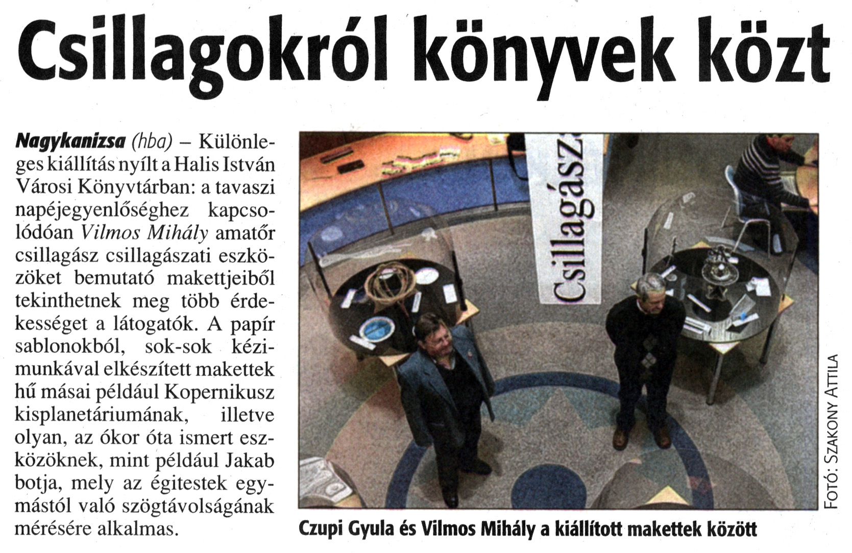 Nyilvános 1777 | 4268 | Zalai Hírlap 2013. március 18. 64. szám 12. oldal - Csillagokról könyvek közt | Csillagokról könyvek közt Nagykanizsa (hba) - Különleges kiállítás nyílt a Halis István Városi Könyvtárban: a tavaszi napéjegyenlőséghez kapcsolódóan Vilmos Mihály amatőr csillagász csillagászati eszközöket bemutató makettjeiből tekinthetnek meg több érdekességet a látogatók. A papír sablonokból, sok-sok kézimunkával elkészített makettek hű másai például Kopernikusz kisplanetáriumának, illetve olyan, az ókor óta ismert eszközöknek, mint például Jakab botja, mely az égitestek egymástól való szögtávolságának mérésére alkalmas. Czupi Gyula és Vilmos Mihály a kiállított makettek között Fotó: Szakony Attila |