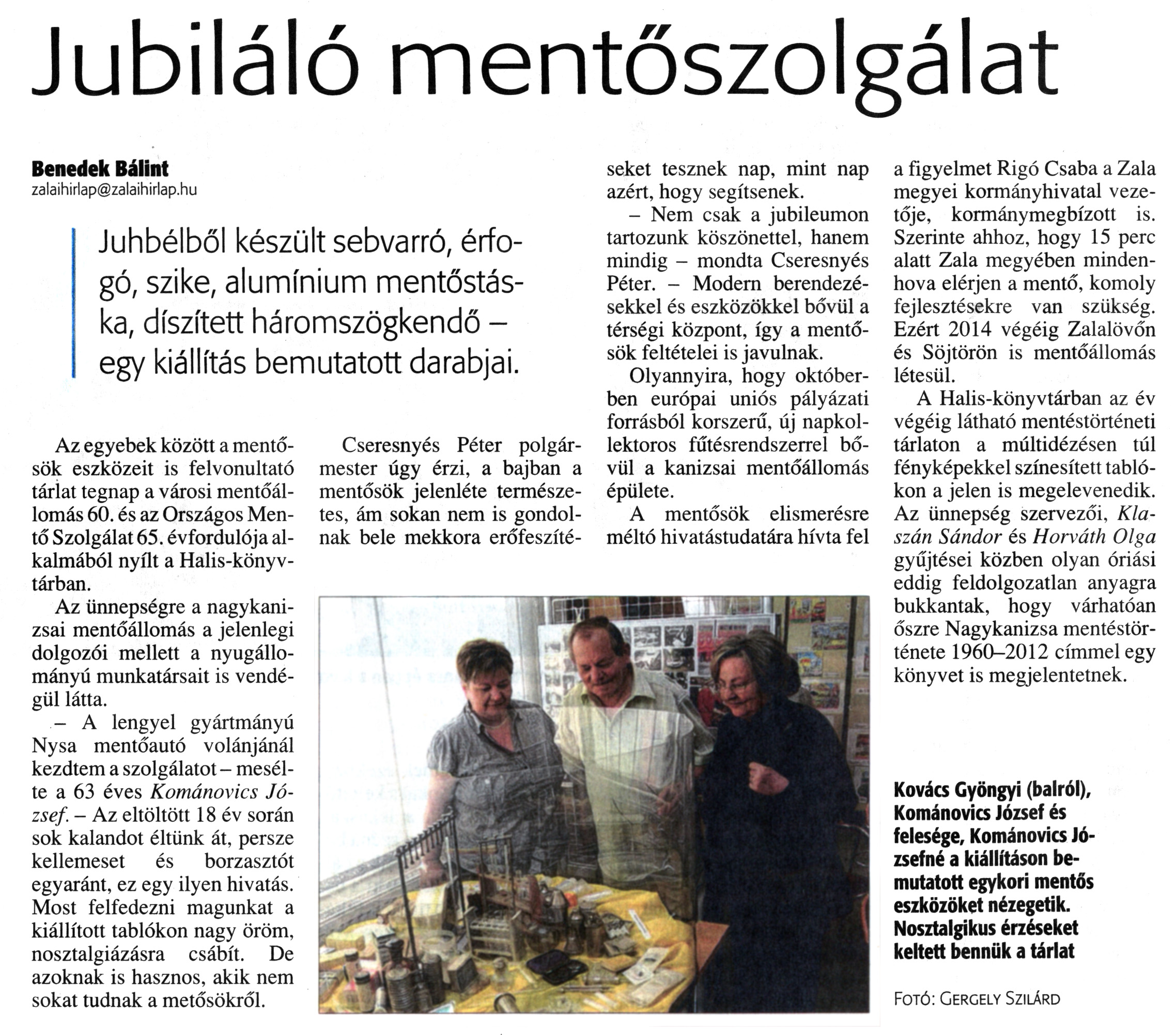Nyilvános 1670 | 3455 | Zalai Hírlap 2013. május 11. 109. szám 10. oldal - Jubiláló mentőszolgálat | Jubiláló mentőszolgálat Benedek Bálint zalaihirlap@zalaihirlap.hu Juhbélből készült sebvarró, érfogó, szike, alumínium mentőstáska, díszített háromszögkendő -egy kiállítás bemutatott darabjai. Az egyebek között a mentősök eszközeit is felvonultató tárlat tegnap a városi mentőállomás 60. és az Országos Mentő Szolgálat 65. évfordulója alkalmából nyílt a Halis-könyvtárban. Az ünnepségre a nagykanizsai mentőállomás a jelenlegi dolgozói mellett a nyugállományú munkatársait is vendégül látta. - A lengyel gyártmányú Nysa mentőautó volánjánál kezdtem a szolgálatot - mesélte a 63 éves Kománovics József. - Az eltöltött 18 év során sok kalandot éltünk át, persze kellemeset és borzasztót egyaránt, ez egy ilyen hivatás. Most felfedezni magunkat a kiállított tablókon nagy öröm, nosztalgiázásra csábít. De azoknak is hasznos, akik nem sokat tudnak a metősökről. Cseresnyés Péter polgármester úgy érzi, a bajban a mentősök jelenléte természetes, ám sokan nem is gondolnak bele mekkora erőfeszítéseket tesznek nap, mint nap azért, hogy segítsenek. - Nem csak a jubileumon tartozunk köszönettel, hanem mindig - mondta Cseresnyés Péter. - Modern berendezésekkel és eszközökkel bővül a térségi központ, így a mentősök feltételei is javulnak. Olyannyira, hogy októberben európai uniós pályázati forrásból korszerű, új napkollektoros fűtésrendszerrel bővül a kanizsai mentőállomás épülete. A mentősök elismerésre méltó hivatástudatára hívta fel a figyelmet Rigó Csaba a Zala megyei kormányhivatal vezetője, kormánymegbízott is. Szerinte ahhoz, hogy 15 perc alatt Zala megyében mindenhova elérjen a mentő, komoly fejlesztésekre van szükség. Ezért 2014 végéig Zalalövőn és Söjtörön is mentőállomás létesül. A Halis-könyvtárban az év végéig látható mentéstörténeti tárlaton a múltidézésen túl fényképekkel színesített tablókon a jelen is megelevenedik. Az ünnepség szervezői, Klaszán Sándor és Horváth Olga gyűjtései közben olyan óriási eddig feldolgozatlan anyagra bukkantak, hogy várhatóan őszre Nagykanizsa mentéstörténete 1960-2012 címmel egy könyvet is megjelentetnek. Kovács Gyöngyi (balról), Kománovics József és felesége, Kománovics Józsefné a kiállításon bemutatott egykori mentős eszközöket nézegetik. Nosztalgikus érzéseket keltett bennük a tárlat Fotó: Gergely Szilárd |