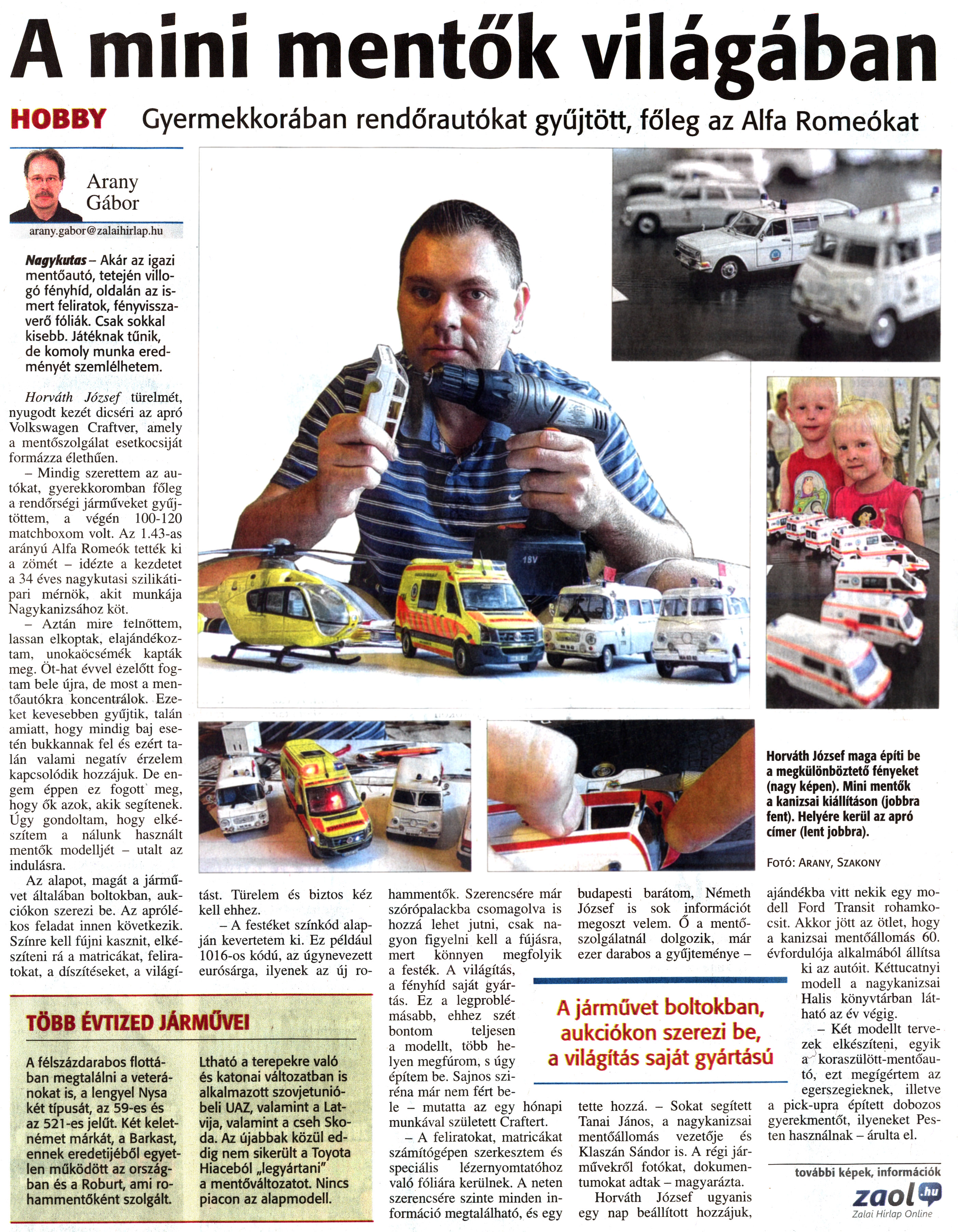 Nyilvános 1851 | 4763 | Zalai Hírlap 2013. július 19. 167. szám 8. oldal - A mini mentők világában | A cikk internetes változata a következő link alatt tekinthető meg: http://zaol.hu/loero/a-mini-mentok-vilagaban-1553058 A mini mentők világában HOBBY Gyermekkorában rendőrautókat gyűjtött, főleg az Alfa Romeókat Nagykutas- Akár az igazi mentőautó, tetején villogó fényhíd, oldalán az ismert feliratok, fényvisszaverő fóliák. Csak sokkal kisebb. Játéknak tűnik, de komoly munka eredményét szemlélhetem. Horváth József türelmét, nyugodt kezét dicséri az apró Volkswagen Craftver, amely a mentőszolgálat esetkocsiját formázza élethűen. - Mindig szerettem az autókat, gyerekkoromban főleg a rendőrségi járműveket gyűjtöttem, a végén 100-120 matchboxom volt. Az 1.43-as arányú Alfa Romeók tették ki a zömét - idézte a kezdetet a 34 éves nagykutasi szilikátipari mérnök, akit munkája Nagykanizsához köt. - Aztán mire felnőttem, lassan elkoptak, elajándékoztam, unokaöcsémék kapták meg. Öt-hat évvel ezelőtt fogtam bele újra, de most a mentőautókra koncentrálok. Ezeket kevesebben gyűjtik, talán amiatt, hogy mindig baj esetén bukkannak fel és ezért talán valami negatív érzelem kapcsolódik hozzájuk. De engem éppen ez fogott meg, hogy ők azok, akik segítenek. Úgy gondoltam, hogy elkészítem a nálunk használt mentők modelljét - utalt az indulásra. Az alapot, magát a járművet általában boltokban, aukciókon szerezi be. Az aprólékos feladat innen következik. Színre kell fújni kasznit, elkészíteni rá a matricákat, feliratokat, a díszítéseket, a világítást. Türelem és biztos kéz kell ehhez. - A festéket színkód alapján kevertetem ki. Ez például 1016-os kódú, az úgynevezett eurósárga, ilyenek az új rohammentők. Szerencsére már szórópalackba csomagolva is hozzá lehet jutni, csak nagyon figyelni kell a fújásra, mert könnyen megfolyik a festék. A világítás, a fényhíd saját gyártás. Ez a legproblémásabb, ehhez szét bontom teljesen a modellt, több helyen megfúrom, s úgy építem be. Sajnos sziréna már nem fért bele - mutatta az egy hónapi munkával született Craftert. - A feliratokat, matricákat számítógépen szerkesztem és speciális lézernyomtatóhoz való fóliára kerülnek. A neten szerencsére szinte minden információ megtalálható, és egy budapesti barátom, Németh József is sok információt megoszt velem. Ő a mentőszolgálatnál dolgozik, már ezer darabos a gyűjteménye - tette hozzá. - Sokat segített Tanai János, a nagykanizsai mentőállomás vezetője és Klaszán Sándor is. A régi járművekről fotókat, dokumentumokat adtak - magyarázta. Horváth József ugyanis egy nap beállított hozzájuk, ajándékba vitt nekik egy modell Ford Transit rohamkocsit. Akkor jött az ötlet, hogy a kanizsai mentőállomás 60. évfordulója alkalmából állítsa ki az autóit. Kéttucatnyi modell a nagykanizsai Halis könyvtárban látható az év végig. - Két modellt tervezek elkészíteni, egyik a koraszülött-mentőautó, ezt megígértem az egerszegieknek, illetve a pickupra épített dobozos gyerekmentőt, ilyeneket Pesten használnak - árulta el. Arany Gábor arany.gabor@zalaihirlap.hu TÖBB ÉVTIZED JÁRMŰVEI A félszázdarabos flottában megtalálni a veteránokat is, a lengyel Nysa két típusát, az 59-es és az 521-es jelűt. Két keletnémet márkát, a Barkast, ennek eredetijéből egyetlen működött az országban és a Roburt, ami rohammentőként szolgált. Látható a terepekre való és katonai változatban is alkalmazott szovjetunióbeli UAZ, valamint a Lat-vija, valamint a cseh Skoda. Az újabbak közül eddig nem sikerült a Toyota Hiaceból „legyártani" a mentőváltozatot. Nincs piacon az alapmodell. Fotó: Arany, Szakony A járművet boltokban, aukciókon szerezi be, a világítás saját gyártású további képek, információk zaol.hu Zalai Hírlap Online Horváth József maga építi be a megkülönböztető fényeket (nagy képen). Mini mentők a kanizsai kiállításon (jobbra fent). Helyére kerül az apró címer (lent jobbra). |