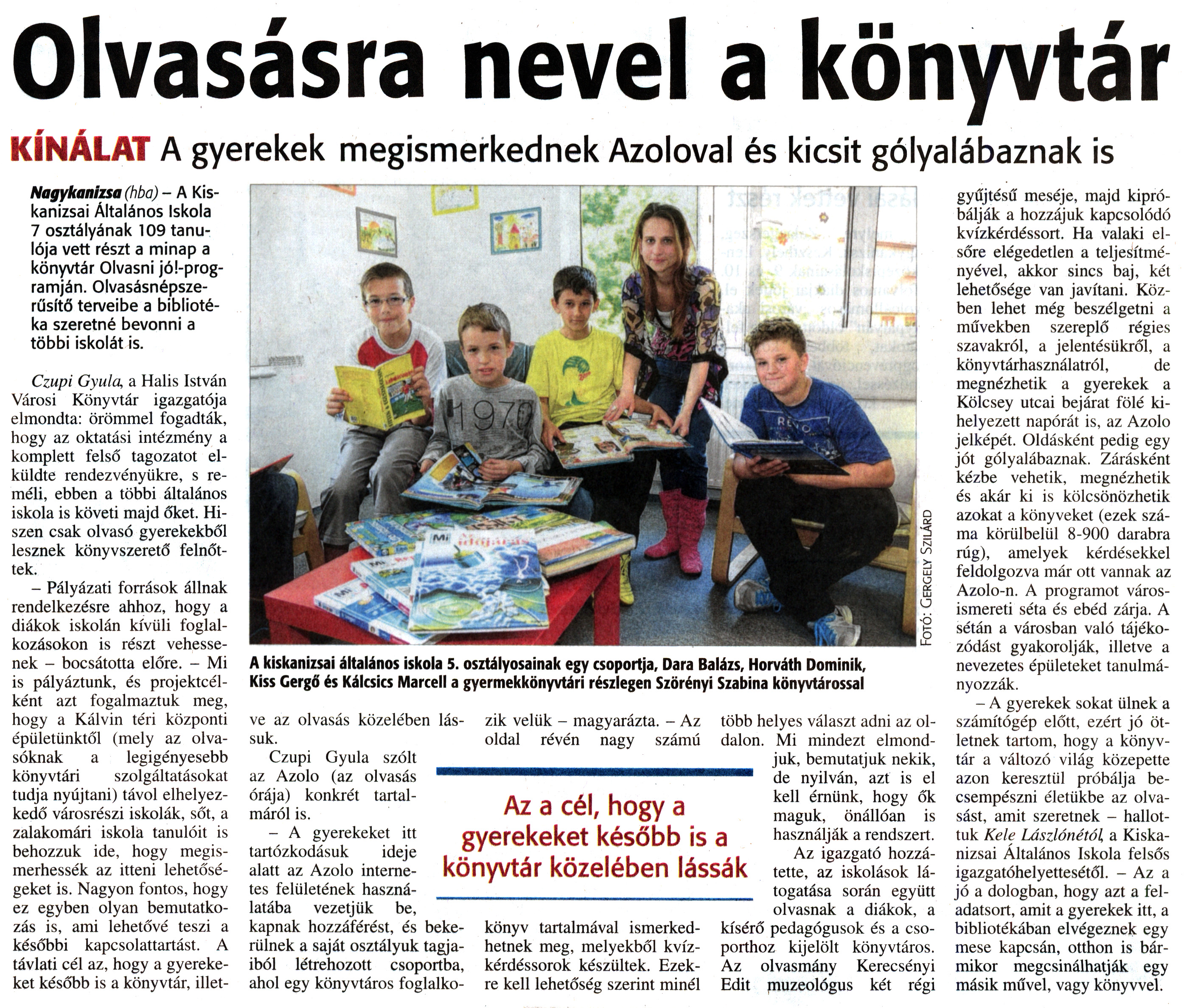 Nyilvános 2537 | 4970 | Zalai Hírlap 2014. május 8. 106. szám 4. oldal - Olvasásra nevel a könyvtár | Olvasásra nevel a könyvtár KÍNÁLAT A gyerekek megismerkednek Azoloval és kicsit gólyalábaznak is Nagykanizsa (hba) - A Kiskanizsai Általános Iskola 7 osztályának 109 tanulója vett részt a minap a könyvtár Olvasni jó!-programján. Olvasásnépszerűsítő terveibe a bibliotéka szeretné bevonni a többi iskolát is. Czupi Gyula, a Halis István Városi Könyvtár igazgatója elmondta: örömmel fogadták, hogy az oktatási intézmény a komplett felső tagozatot elküldte rendezvényükre, s reméli, ebben a többi általános iskola is követi majd őket. Hiszen csak olvasó gyerekekből lesznek könyvszerető felnőttek. - Pályázati források állnak rendelkezésre ahhoz, hogy a diákok iskolán kívüli foglalkozásokon is részt vehessenek - bocsátotta előre. - Mi is pályáztunk, és projektcélként azt fogalmaztuk meg, hogy a Kálvin téri központi épületünktől (mely az olvasóknak a legigényesebb könyvtári szolgáltatásokat tudja nyújtani) távol elhelyezkedő városrészi iskolák, sőt, a zalakomári iskola tanulóit is behozzuk ide, hogy megismerhessék az itteni lehetőségeket is. Nagyon fontos, hogy ez egyben olyan bemutatkozás is, ami lehetővé teszi a későbbi kapcsolattartást. A távlati cél az, hogy a gyerekeket később is a könyvtár, illetve az olvasás közelében lássuk. Czupi Gyula szólt az Azolo (az olvasás órája) konkrét tartalmáról is. - A gyerekeket itt tartózkodásuk ideje alatt az Azolo internetes felületének használatába vezetjük be, kapnak hozzáférést, és bekerülnek a saját osztályuk tagjaiból létrehozott csoportba, ahol egy könyvtáros foglalkozik velük - magyarázta. - Az oldal révén nagy számú könyv tartalmával ismerkedhetnek meg, melyekből kvízkérdéssorok készültek. Ezekre kell lehetőség szerint minél több helyes választ adni az oldalon. Mi mindezt elmondjuk, bemutatjuk nekik, de nyilván, azt is el kell érnünk, hogy ők maguk, önállóan is használják a rendszert. Az igazgató hozzátette, az iskolások látogatása során együtt olvasnak a diákok, a kísérő pedagógusok és a csoporthoz kijelölt könyvtáros. Az olvasmány Kerecsényi Edit muzeológus két régi gyűjtésű meséje, majd kipróbálják a hozzájuk kapcsolódó kvízkérdéssort. Ha valaki elsőre elégedetlen a teljesítményével, akkor sincs baj, két lehetősége van javítani. Közben lehet még beszélgetni a művekben szereplő régies szavakról, a jelentésükről, a könyvtárhasználatról, de megnézhetik a gyerekek a Kölcsey utcai bejárat fölé kihelyezett napórát is, az Azolo jelképét. Oldásként pedig egy jót gólyalábaznak. Zárásként kézbe vehetik, megnézhetik és akár ki is kölcsönözhetik azokat a könyveket (ezek száma körülbelül 8-900 darabra rúg), amelyek kérdésekkel feldolgozva már ott vannak az Azolo-n. A programot városismereti séta és ebéd zárja. A sétán a városban való tájékozódást gyakorolják, illetve a nevezetes épületeket tanulmányozzák. - A gyerekek sokat ülnek a számítógép előtt, ezért jó ötletnek tartom, hogy a könyvtár a változó világ közepette azon keresztül próbálja becsempészni életükbe az olvasást, amit szeretnek - hallottuk Kele Lászlónétól a Kiskanizsai Általános Iskola felsős igazgatóhelyettesétől. - Az a jó a dologban, hogy azt a feladatsort, amit a gyerekek itt, a bibliotékában elvégeznek egy mese kapcsán, otthon is bármikor megcsinálhatják egy másik művel, vagy könyvvel. A kiskanizsai általános iskola 5. osztályosainak egy csoportja. Dara Balázs, Horváth Dominik, Kiss Gergő és Kálcsics Marcell a gyermekkönyvtári részlegen Szörényi Szabina könyvtárossal |