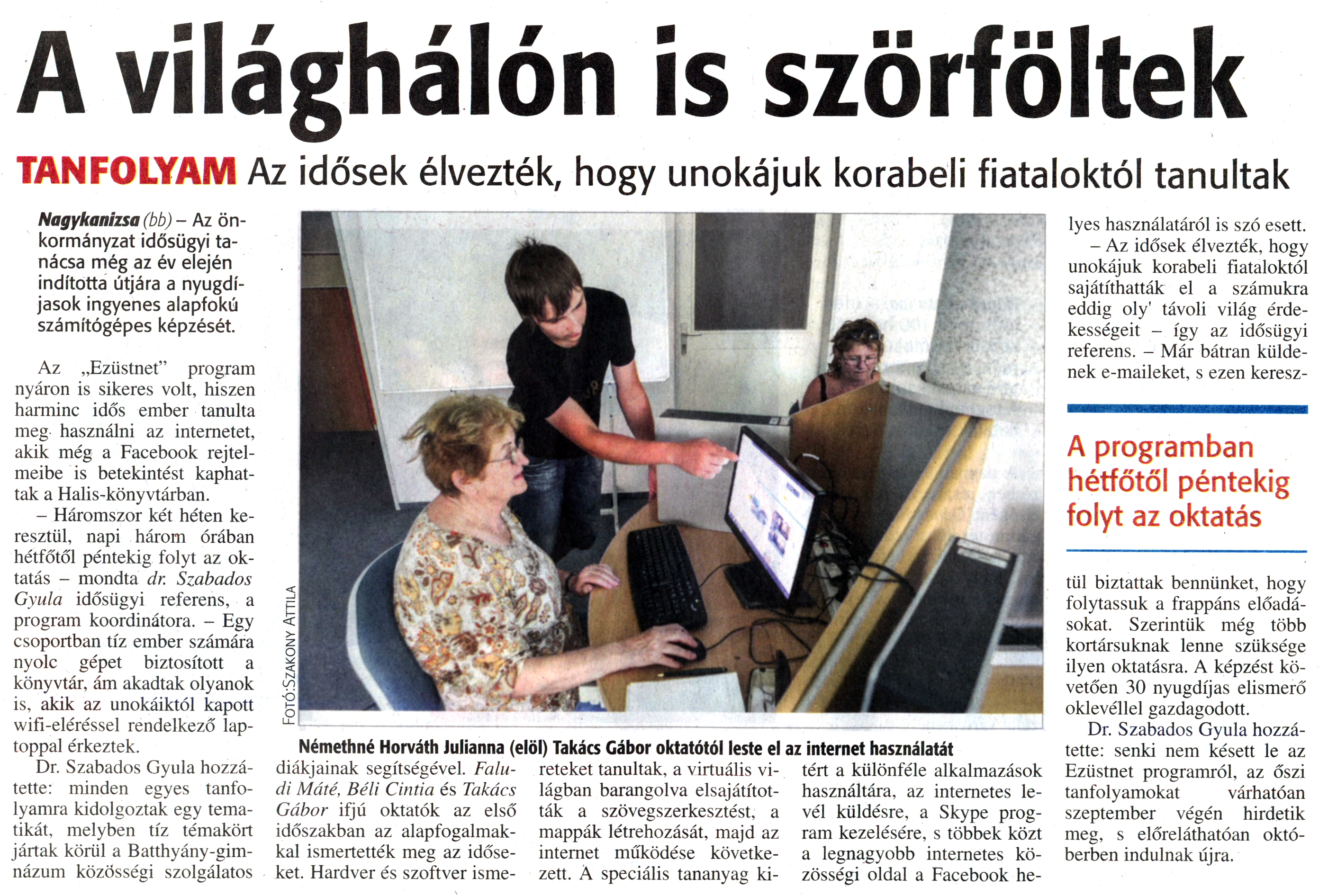 Nyilvános 2001 | 3706 | Zalai Hírlap 2014. szeptember 4. 206. szám 4. oldal | A világhálón is szörföltek TANFOLYAM Az idősek élvezték, hogy unokájuk korabeli fiataloktól tanultak Nagykanizsa (bb) - Az önkormányzat idősügyi tanácsa még az év elején indította útjára a nyugdíjasok ingyenes alapfokú számítógépes képzését. Az „Ezüstnet" program nyáron is sikeres volt, hiszen harminc idős ember tanulta meg használni az internetet, akik még a Facebook rejtelmeibe is betekintést kaphattak a Halis-könyvtárban. - Háromszor két héten keresztül, napi három órában hétfőtől péntekig folyt az oktatás - mondta dr. Szabados Gyula idősügyi referens, a program koordinátora. - Egy csoportban tíz ember számára nyolc gépet biztosított a könyvtár, ám akadtak olyanok is, akik az unokáiktól kapott wifi-eléréssel rendelkező laptoppal érkeztek. Dr. Szabados Gyula hozzátette: minden egyes tanfolyamra kidolgoztak egy tematikát, melyben tíz témakört jártak körül a Batthyány-gimnázum közösségi szolgálatos diákjainak segítségével. Faludi Máté, Béli Cintia és Takács Gábor ifjú oktatók az első időszakban az alapfogalmakkal ismertették meg az időseket. Hardver és szoftver ismereteket tanultak, a virtuális világban barangolva elsajátították a szövegszerkesztést, a mappák létrehozását, majd az internet működése következett. A speciális tananyag kitért a különféle alkalmazások használatára, az internetes levél küldésre, a Skype program kezelésére, s többek közt a legnagyobb internetes közösségi oldal a Facebook helyes használatáról is szó esett. - Az idősek élvezték, hogy unokájuk korabeli fiataloktól sajátíthatták el a számukra eddig oly\' távoli világ érdekességeit - így az idősügyi referens. - Már bátran küldenek e-maileket, s ezen keresztül biztattak bennünket, hogy folytassuk a frappáns előadásokat. Szerintük még több kortársuknak lenne szüksége ilyen oktatásra. A képzést követően 30 nyugdíjas elismerő oklevéllel gazdagodott. Dr. Szabados Gyula hozzátette: senki nem késett le az Ezüstnet programról, az őszi tanfolyamokat várhatóan szeptember végén hirdetik meg, s előreláthatóan októberben indulnak újra. Némethné Horváth Julianna (elöl) Takács Gábor oktatótól leste el az internet használatát A programban hétfőtől péntekig folyt az oktatás |