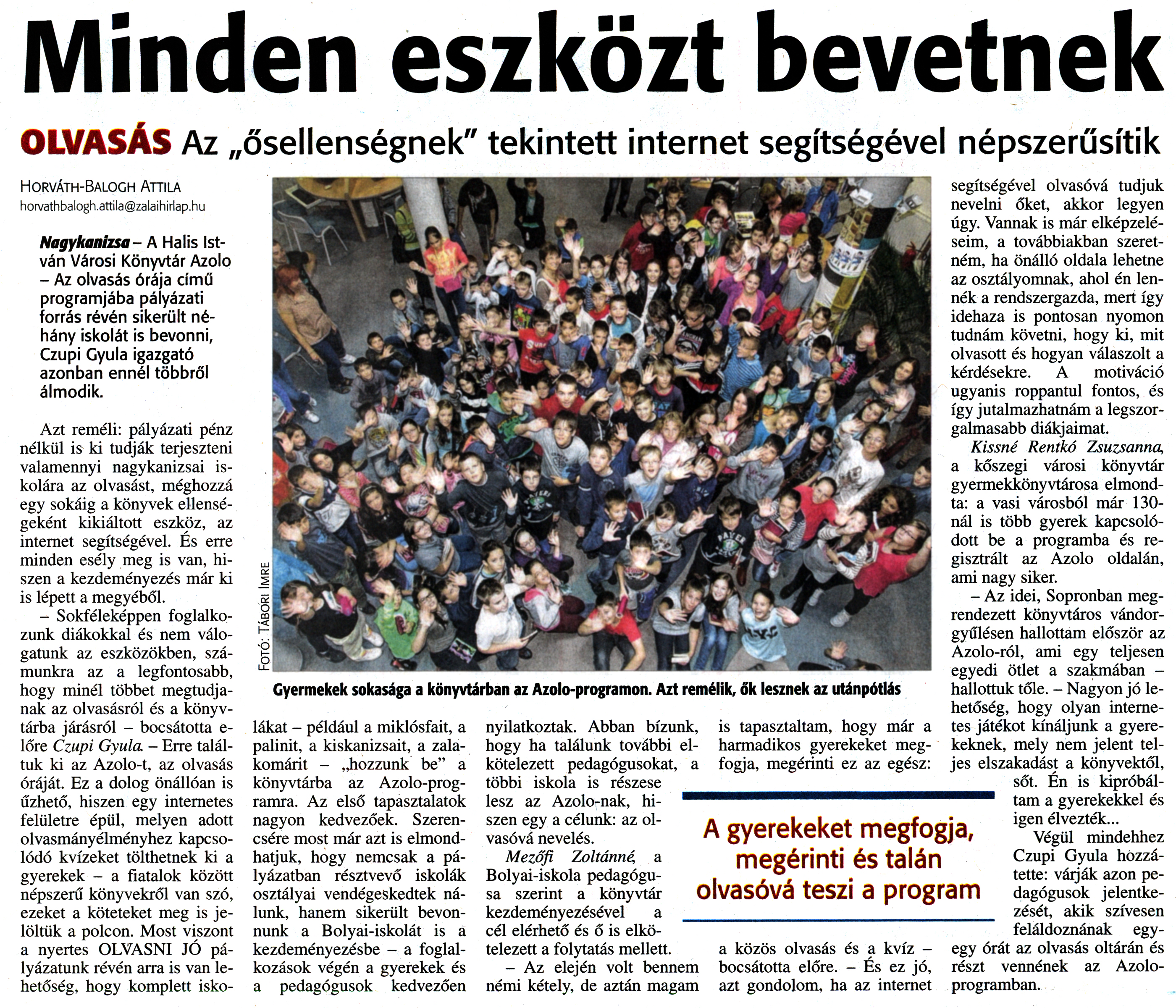 Nyilvános 1965 | 3724 | Zalai Hírlap 2014. november 19. 269. szám 7. oldal - Minden eszközt bevetnek | Minden eszközt bevetnek OLVASÁS Az „ősellenségnek" tekintett internet segítségével népszerűsítik A gyerekeket megfogja, megérinti és talán olvasóvá teszi a program Gyermekek sokasága a könyvtárban az Azolo-programon. Azt remélik, ők lesznek az utánpótlás Horváth-Balogh Attila horvathbalogh.attila@zalaihirlap.hu Nagykanizsa- A Halis István Városi Könyvtár Azolo - Az olvasás órája című programjába pályázati forrás révén sikerült néhány iskolát is bevonni, Czupi Gyula igazgató azonban ennél többről álmodik. Azt reméli: pályázati pénz nélkül is ki tudják terjeszteni valamennyi nagykanizsai iskolára az olvasást, méghozzá egy sokáig a könyvek ellenségeként kikiáltott eszköz, az internet segítségével. És erre minden esély meg is van, hiszen a kezdeményezés már ki is lépett a megyéből. - Sokféleképpen foglalkozunk diákokkal és nem válogatunk az eszközökben, számunkra az a legfontosabb, hogy minél többet megtudjanak az olvasásról és a könyvtárba járásról - bocsátotta e-lőre Czupi Gyula - Erre találtuk ki az Azolo-t, az olvasás óráját. Ez a dolog önállóan is űzhető, hiszen egy internetes felületre épül, melyen adott olvasmányélményhez kapcsolódó kvízeket tölthetnek ki a gyerekek - a fiatalok között népszerű könyvekről van szó, ezeket a köteteket meg is jelöltük a polcon. Most viszont a nyertes OLVASNI JÓ pályázatunk révén arra is van lehetőség, hogy komplett iskolákat - például a miklósfait, a palinit, a kiskanizsait, a zalakomárit - „hozzunk be" a könyvtárba az Azolo-programra. Az első tapasztalatok nagyon kedvezőek. Szerencsére most már azt is elmondhatjuk, hogy nemcsak a pályázatban résztvevő iskolák osztályai vendégeskedtek nálunk, hanem sikerült bevonnunk a Bolyai-iskolát is a kezdeményezésbe - a foglalkozások végén a gyerekek és a pedagógusok kedvezően nyilatkoztak. Abban bízunk, hogy ha találunk további elkötelezett pedagógusokat, a többi iskola is részese lesz az Azolo-nak, hiszen egy a célunk: az olvasóvá nevelés. Mezőfi Zoltánné, a Bolyai-iskola pedagógusa szerint a könyvtár kezdeményezésével a cél elérhető és ő is elkötelezett a folytatás mellett. - Az elején volt bennem némi kétely, de aztán magam is tapasztaltam, hogy már a harmadikos gyerekeket megfogja, megérinti ez az egész: a közös olvasás és a kvíz -bocsátotta előre. - És ez jó, azt gondolom, ha az internet segítségével olvasóvá tudjuk nevelni őket, akkor legyen úgy. Vannak is már elképzeléseim, a továbbiakban szeretném, ha önálló oldala lehetne az osztályomnak, ahol én lennék a rendszergazda, mert így idehaza is pontosan nyomon tudnám követni, hogy ki, mit olvasott és hogyan válaszolt a kérdésekre. A motiváció ugyanis roppantul fontos, és így jutalmazhatnám a legszorgalmasabb diákjaimat. Kissné Rentkó Zsuzsanna a kőszegi városi könyvtár gyermekkönyvtárosa elmondta: a vasi városból már 130-nál is több gyerek kapcsolódott be a programba és regisztrált az Azolo oldalán, ami nagy siker. - Az idei, Sopronban megrendezett könyvtáros vándorgyűlésen hallottam először az Azolo-ról, ami egy teljesen egyedi ötlet a szakmában -hallottuk tőle. - Nagyon jó lehetőség, hogy olyan internetes játékot kínáljunk a gyerekeknek, mely nem jelent teljes elszakadást a könyvektől, sőt. Én is kipróbáltam a gyerekekkel és igen élvezték... Végül mindehhez Czupi Gyula hozzátette: várják azon pedagógusok jelentkezését, akik szívesen feláldoznának egy-egy órát az olvasás oltárán és részt vennének az Azolo-programban. |