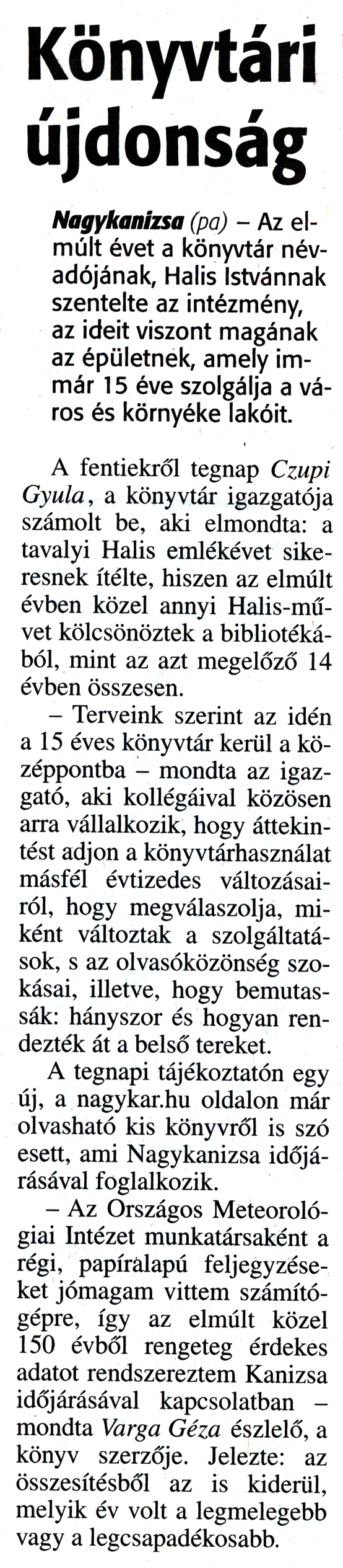 Nyilvános 1848 | 3699 | Zalai Hírlap 2016. január 6. 4. szám 3. oldal - Könyvtári újdonság | Könyvtári újdonság Nagykanizsa (pa) - Az elmúlt évet a könyvtár névadójának, Halis Istvánnak szentelte az intézmény, az ideit viszont magának az épületnek, amely immár 15 éve szolgálja a város és környéke lakóit. A fentiekről tegnap Czupi Gyula, a könyvtár igazgatója számolt be, aki elmondta: a tavalyi Halis emlékévet sikeresnek ítélte, hiszen az elmúlt évben közel annyi Halis-művet kölcsönöztek a bibliotékából, mint az azt megelőző 14 évben összesen. - Terveink szerint az idén a 15 éves könyvtár kerül a középpontba - mondta az igazgató, aki kollégáival közösen arra vállalkozik, hogy áttekintést adjon a könyvtárhasználat másfél évtizedes változásairól, hogy megválaszolja, miként változtak a szolgáltatások, s az olvasóközönség szokásai, illetve, hogy bemutassák: hányszor és hogyan rendezték át a belső tereket. A tegnapi tájékoztatón egy új, a nagykar.hu oldalon már olvasható kis könyvről is szó esett, ami Nagykanizsa időjárásával foglalkozik. - Az Országos Meteorológiai Intézet munkatársaként a régi, papíralapú feljegyzéseket jómagam vittem számítógépre, így az elmúlt közel 150 évből rengeteg érdekes adatot rendszereztem Kanizsa időjárásával kapcsolatban - mondta Varga Géza észlelő, a könyv szerzője. Jelezte: az összesítésből az is kiderül, melyik év volt a legmelegebb vagy a legcsapadékosabb. |