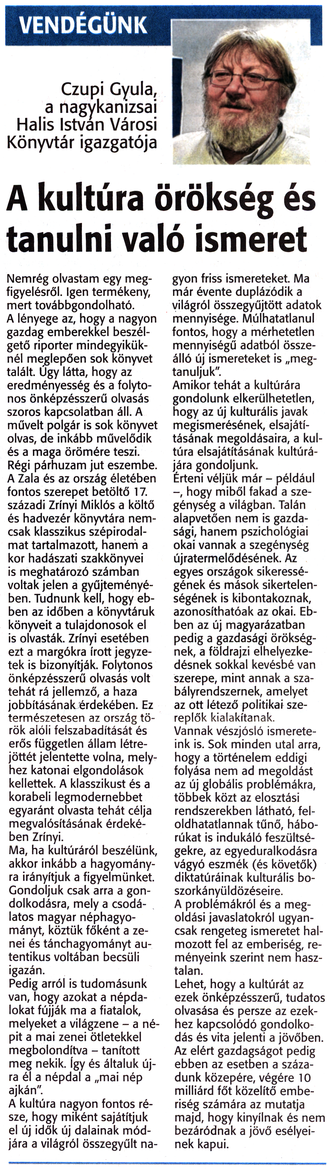 Nyilvános 2002 | 3522 | Zalai Hírlap 2016. január 16. 13. szám 2. oldal | VENDÉGÜNK Czupi Gyula, a nagykanizsai Halis István Városi Könyvtár igazgatója A kultúra örökség és tanulni való ismeret Nemrég olvastam egy megfigyelésről. Igen termékeny, mert továbbgondolható. A lényege az, hogy a nagyon gazdag emberekkel beszélgető riporter mindegyiküknél meglepően sok könyvet talált. Úgy látta, hogy az eredményesség és a folytonos önképzésszerű olvasás szoros kapcsolatban áll. A művelt polgár is sok könyvet olvas, de inkább művelődik és a maga örömére teszi. Régi párhuzam jut eszembe. A Zala és az ország életében fontos szerepet betöltő 17. századi Zrínyi Miklós a költő és hadvezér könyvtára nemcsak klasszikus szépirodalmat tartalmazott, hanem a kor hadászati szakkönyvei is meghatározó számban voltak jelen a gyűjteményében. Tudnunk kell, hogy ebben az időben a könyvtáruk könyveit a tulajdonosok el is olvasták. Zrínyi esetében ezt a margókra írott jegyzetek is bizonyítják. Folytonos önképzésszerű olvasás volt tehát rá jellemző, a haza jobbításának érdekében. Ez természetesen az ország török alóli felszabadítását és erős független állam létrejöttét jelentette volna, melyhez katonai elgondolások kellettek. A klasszikust és a korabeli legmodernebbet egyaránt olvasta tehát célja megvalósításának érdekében Zrínyi. Ma, ha kultúráról beszélünk, akkor inkább a hagyományra irányítjuk a figyelmünket. Gondoljuk csak arra a gondolkodásra, mely a csodálatos magyar néphagyományt, köztük főként a zenei és tánchagyományt autentikus voltában becsüli igazán. Pedig arról is tudomásunk van, hogy azokat a népdalokat fújják ma a fiatalok, melyeket a világzene - a népit a mai zenei ötletekkel megbolondítva - tanított meg nekik. Így és általuk újra él a népdal a „mai nép ajkán". A kultúra nagyon fontos része, hogy miként sajátítjuk el új idők új dalainak módjára a világról összegyűlt nagyon friss ismereteket. Ma már évente duplázódik a világról összegyűjtött adatok mennyisége. Múlhatatlanul fontos, hogy a mérhetetlen mennyiségű adatból összeálló új ismereteket is „megtanuljuk". Amikor tehát a kultúrára gondolunk elkerülhetetlen, hogy az új kulturális javak megismerésének, elsajátításának megoldásaira, a kultúra elsajátításának kultúrájára gondoljunk. Érteni véljük már - például hogy miből fakad a szegénység a világban. Talán alapvetően nem is gazdasági, hanem pszichológiai okai vannak a szegénység újratermelődésének. Az egyes országok sikerességének és mások sikertelenségének is kibontakoznak, azonosíthatóak az okai. Ebben az új magyarázatban pedig a gazdasági örökségnek, a földrajzi elhelyezkedésnek sokkal kevésbé van szerepe, mint annak a szabályrendszernek, amelyet az ott létező politikai szereplők kialakítanak. Vannak vészjósló ismereteink is. Sok minden utal arra, hogy a történelem eddigi folyása nem ad megoldást az új globális problémákra, többek közt az elosztási rendszerekben látható, feloldhatatlannak tűnő, háborúkat is indukáló feszültségekre, az egyeduralkodásra vágyó eszmék (és követők) diktatúráinak kulturális boszorkányüldözéseire. A problémákról és a megoldási javaslatokról ugyancsak rengeteg ismeretet halmozott fel az emberiség, reményeink szerint nem hasztalan. Lehet, hogy a kultúrát az ezek önképzésszerű, tudatos olvasása és persze az ezekhez kapcsolódó gondolkodás és vita jelenti a jövőben. Az elért gazdagságot pedig ebben az esetben a századunk közepére, végére 10 milliárd főt közelítő emberiség számára az mutatja majd, hogy kinyílnak és nem bezáródnak a jövő esélyeinek kapui. |