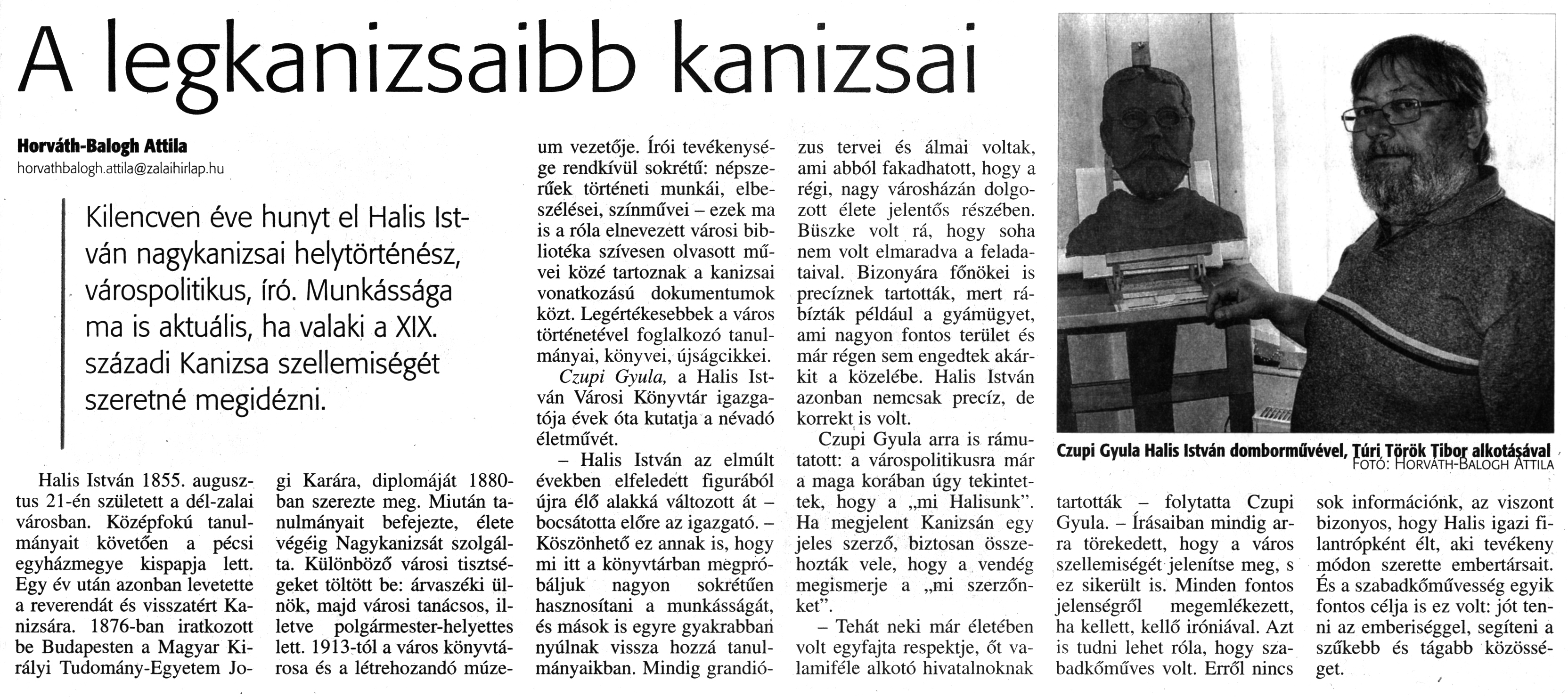 Nyilvános 1941 | 3578 | Zalai Hírlap 2017. április 8. 83. szám 11. oldal - A legkanizsaibb kanizsai | A legkanizsaibb kanizsai Horváth-Balogh Attila horvathbalogh.attila@zalaihirlap.hu Kilencven éve hunyt el Halis István nagykanizsai helytörténész, várospolitikus, író. Munkássága ma is aktuális, ha valaki a XIX. századi Kanizsa szellemiségét szeretné megidézni. Halis István 1855. augusztus 21-én született a dél-zalai városban. Középfokú tanulmányait követően a pécsi egyházmegye kispapja lett. Egy év után azonban levetette a reverendát és visszatért Kanizsára. 1876-ban iratkozott be Budapesten a Magyar Királyi Tudomány-Egyetem Jogi Karára, diplomáját 1880-ban szerezte meg. Miután tanulmányait befejezte, élete végéig Nagykanizsát szolgálta. Különböző városi tisztségeket töltött be: árvaszéki ülnök, majd városi tanácsos, illetve polgármester-helyettes lett. 1913-tól a város könyvtárosa és a létrehozandó múze- um vezetője. írói tevékenysége rendkívül sokrétű: népszerűek történeti munkái, elbeszélései, színművei - ezek ma is a róla elnevezett városi bibliotéka szívesen olvasott művei közé tartoznak a kanizsai vonatkozású dokumentumok közt. Legértékesebbek a város történetével foglalkozó tanulmányai, könyvei, újságcikkei. Czupi Gyula, a Halis István Városi Könyvtár igazgatója évek óta kutatja a névadó életművét. - Halis István az elmúlt években elfeledett figurából újra élő alakká változott át -bocsátotta előre az igazgató. -Köszönhető ez annak is, hogy mi itt a könyvtárban megpróbáljuk nagyon sokrétűen hasznosítani a munkásságát, és mások is egyre gyakrabban nyúlnak vissza hozzá tanulmányaikban. Mindig grandiózus tervei és álmai voltak, ami abból fakadhatott, hogy a régi. nagy városházán dolgozott élete jelentős részében. Büszke volt rá, hogy soha nem volt elmaradva a feladataival. Bizonyára főnökei is precíznek tartották, mert rábízták például a gyámügyet, ami nagyon fontos terület és már régen sem engedtek akárkit a közelébe. Halis István azonban nemcsak precíz, de korrekt is volt. Czupi Gyula arra is rámutatott: a várospolitikusra már a maga korában úgy tekintettek, hogy a „mi Halisunk". Ha megjelent Kanizsán egy jeles szerző, biztosan összehozták vele, hogy a vendég megismerje a „mi szerzőnket". - Tehát neki már életében volt egyfajta respektje, őt valamiféle alkotó hivatalnoknak tartották - folytatta Czupi Gyula. - írásaiban mindig arra törekedett, hogy a város szellemiségét jelenítse meg, s ez sikerült is. Minden fontos jelenségről megemlékezett, ha kellett, kellő iróniával. Azt is tudni lehet róla, hogy szabadkőműves volt. Erről nincs sok információnk, az viszont bizonyos, hogy Halis igazi filantrópként élt, aki tevékeny módon szerette embertársait. És a szabadkőművesség egyik fontos célja is ez volt: jót tenni az emberiséggel, segíteni a szűkebb és tágabb közösséget. Czupi Gyula Halis István domborművével. Túri Török Tibor alkotásával Fotó: Horvath-Balogh Attila |