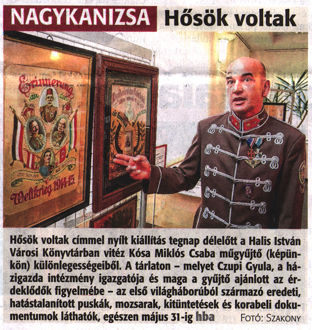 Nyilvános 1793 | 3424 | Zalai Hírlap 2017. május 10. 107. szám 3. oldal | NAGYKANIZSA Hősök voltak Hősök voltak címmel nyílt kiállítás tegnap délelőtt a Halis István Városi Könyvtárban vitéz Kósa Miklós Csaba műgyűjtő (képünkön) különlegességeiből. A tárlaton - melyet Czupi Gyula, a házigazda intézmény igazgatója és maga a gyűjtő ajánlott az érdeklődők figyelmébe - az első világháborúból származó eredeti, hatástalanított puskák, mozsarak, kitüntetések és korabeli dokumentumok láthatók, egészen május 31 -ig hba Fotó: Szakony |