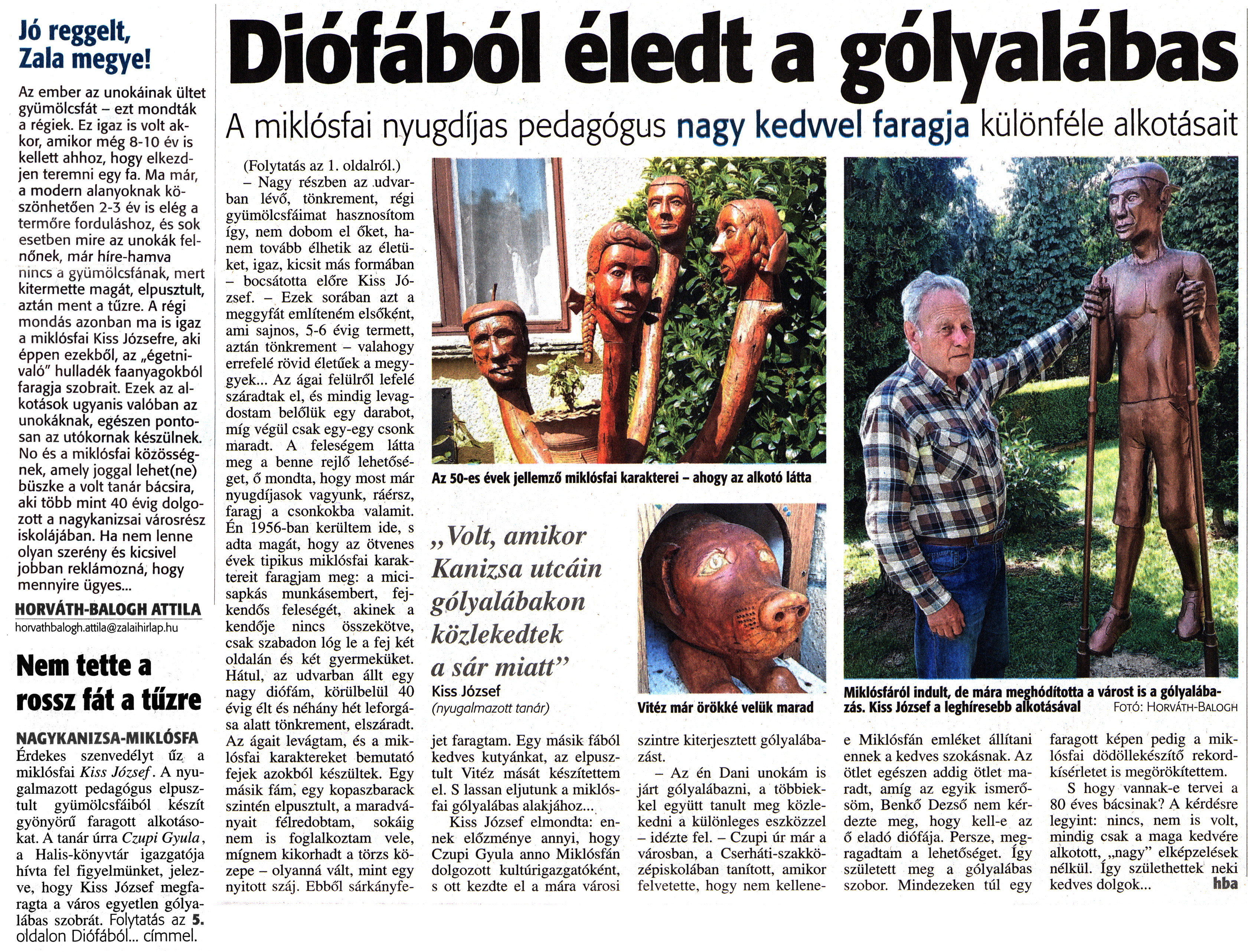 Nyilvános 1505 | 2390 | Zalai Hírlap 2017. május 24. 119. szám 5. oldal - Diófából éledt a gólyalábas | Jó reggelt, Zala megyei Az ember az unokáinak ültet gyümölcsfát - ezt mondták a régiek. Ez igaz is volt akkor, amikor még 8-10 év is kellett ahhoz, hogy elkezdjen teremni egy fa. Ma már, a modern alanyoknak köszönhetően 2-3 év is elég a termőre forduláshoz, és sok esetben mire az unokák felnőnek, már híre-hamva nincs a gyümölcsfának, mert kitermette magát, elpusztult, aztán ment a tűzre. A régi mondás azonban ma is igaz a miklósfai Kiss Józsefre, aki éppen ezekből, az „égetni-való" hulladék faanyagokból faragja szobrait. Ezek az alkotások ugyanis valóban az unokáknak, egészen pontosan az utókornak készülnek. No és a miklósfai közösségnek, amely joggal lehet(ne) büszke a volt tanár bácsira, aki több mint 40 évig dolgozott a nagykanizsai városrész iskolájában. Ha nem lenne olyan szerény és kicsivel jobban reklámozná, hogy mennyire ügyes... HORVÁTH-BALOGH ATTILA horvathbalogh.attila@zalaihirlap.hu Nem tette a rossz fát a tűzre NAGYKANIZSA-MIKLÓSFA Érdekes szenvedélyt űz a miklósfai Kiss József. A nyugalmazott pedagógus elpusztult gyümölcsfáiból készít gyönyörű faragott alkotásokat. A tanár úrra Czupi Gyula, a Halis-könyvtár igazgatója hívta fel figyelmünket, jelezve, hogy Kiss József megfaragta a város egyetlen gólyalábas szobrát. Folytatás az 5. oldalon Diófából... címmel. Diófából éledt a gólyalábas A miklósfai nyugdíjas pedagógus nagy kedvvel faragja különféle alkotásait Miklósfáról indult, de mára meghódította a várost is a gólyalábazás. Kiss József a leghíresebb alkotásával Fotó: Horváth-Balogh e Miklósfán emléket állítani ennek a kedves szokásnak. Az ötlet egészen addig ötlet maradt, amíg az egyik ismerősöm, Benkő Dezső nem kérdezte meg, hogy kell-e az ő eladó diófája. Persze, megragadtam a lehetőséget. így született meg a gólyalábas szobor. Mindezeken túl egy faragott képen pedig a miklósfai dödöllekészítő rekordkísérletet is megörökítettem. S hogy vannak-e tervei a 80 éves bácsinak? A kérdésre legyint: nincs, nem is volt, mindig csak a maga kedvére alkotott, „nagy" elképzelések nélkül. így születhettek neki kedves dolgok... Hba (Folytatás az 1. oldalról.) - Nagy részben az udvarban lévő, tönkrement, régi gyümölcsfáimat hasznosítom így, nem dobom el őket, hanem tovább élhetik az életüket, igaz, kicsit más formában - bocsátotta előre Kiss József. - Ezek sorában azt a meggyfát említeném elsőként, ami sajnos, 5-6 évig termett, aztán tönkrement - valahogy errefelé rövid életűek a meggyek... Az ágai felülről lefelé száradtak el, és mindig levagdostam belőlük egy darabot, míg végül csak egy-egy csonk maradt. A feleségem látta meg a benne rejlő lehetőséget, ő mondta, hogy most már nyugdíjasok vagyunk, ráérsz, faragj a csonkokba valamit. Én 1956-ban kerültem ide, s adta magát, hogy az ötvenes évek tipikus miklósfai karaktereit faragjam meg: a mici-sapkás munkásembert, fejkendős feleségét, akinek a kendője nincs összekötve, csak szabadon lóg le a fej két oldalán és két gyermeküket. Hátul, az udvarban állt egy nagy diófám, körülbelül 40 évig élt és néhány hét leforgása alatt tönkrement, elszáradt. Az ágait levágtam, és a miklósfai karaktereket bemutató fejek azokból készültek. Egy másik fám, egy kopaszbarack szintén elpusztult, a maradványait félredobtam, sokáig nem is foglalkoztam vele, mígnem kikorhadt a törzs közepe - olyanná vált, mint egy nyitott száj. Ebből sárkányfejet faragtam. Egy másik fából kedves kutyánkat, az elpusztult Vitéz mását készítettem el. S lassan eljutunk a miklósfai gólyalábas alakjához... Kiss József elmondta: ennek előzménye annyi, hogy Czupi Gyula anno Miklósfán dolgozott kultúrigazgatóként, s ott kezdte el a mára városi Vitéz már örökké velük marad szintre kiterjesztett gólyalábazást. - Az én Dani unokám is járt gólyalábazni, a többiekkel együtt tanult meg közlekedni a különleges eszközzel - idézte fel. - Czupi úr már a városban, a Cserháti-szakközépiskolában tanított, amikor felvetette, hogy nem kellene- Az 50-es évek jellemző miklósfai karakterei - ahogy az alkotó látta „ Volt, amikor Kanizsa utcáin gólyalábakon közlekedtek a sár miatt" Kiss József (nyugalmazott tanár) |