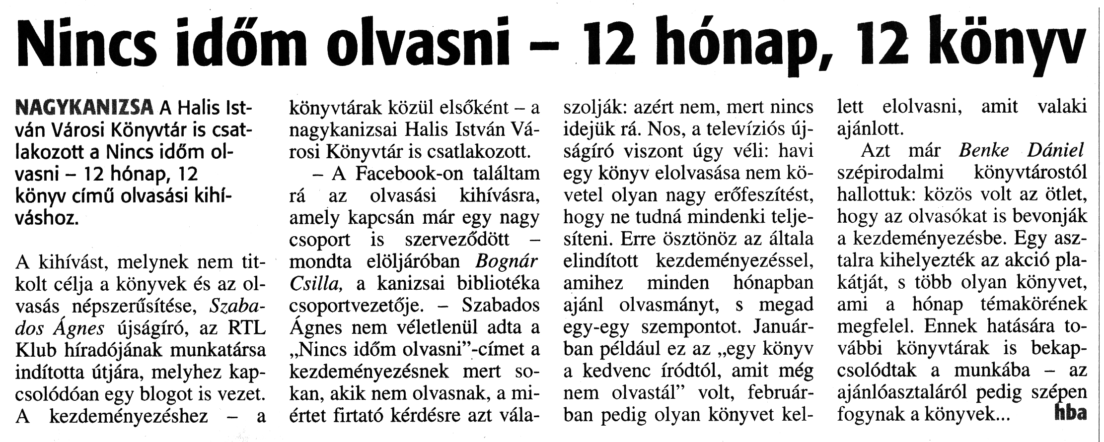 Nyilvános 1656 | 3015 | Zalai Hírlap 2018. március 6. 55. szám 13. oldal | Nincs időm olvasni - 12 hónap, 12 könyv NAGYKANIZSA A Halis István Városi Könyvtár is csatlakozott a Nincs időm olvasni - 12 hónap, 12 könyv című olvasási kihíváshoz. A kihívást, melynek nem titkolt célja a könyvek és az olvasás népszerűsítése, Szabados Ágnes újságíró, az RTL Klub híradójának munkatársa indította útjára, melyhez kapcsolódóan egy blogot is vezet. A kezdeményezéshez - a könyvtárak közül elsőként - a nagykanizsai Halis István Városi Könyvtár is csatlakozott. - A Facebook-on találtam rá az olvasási kihívásra, amely kapcsán már egy nagy csoport is szerveződött -mondta elöljáróban Bognár Csilla, a kanizsai bibliotéka csoportvezetője. - Szabados Ágnes nem véletlenül adta a „Nincs időm olvasni"-címet a kezdeményezésnek mert sokan, akik nem olvasnak, a miértet firtató kérdésre azt válaszolják: azért nem, mert nincs idejük rá. Nos, a televíziós újságíró viszont úgy véli: havi egy könyv elolvasása nem követel olyan nagy erőfeszítést, hogy ne tudná mindenki teljesíteni. Erre ösztönöz az általa elindított kezdeményezéssel, amihez minden hónapban ajánl olvasmányt, s megad egy-egy szempontot. Januárban például ez az „egy könyv a kedvenc íródtól, amit még nem olvastál" volt, februárban pedig olyan könyvet kellett elolvasni, amit valaki ajánlott. Azt már Benke Dániel szépirodalmi könyvtárostól hallottuk: közös volt az ötlet, hogy az olvasókat is bevonják a kezdeményezésbe. Egy asztalra kihelyezték az akció plakátját, s több olyan könyvet, ami a hónap témakörének megfelel. Ennek hatására további könyvtárak is bekapcsolódtak a munkába - az ajánlóasztaláról pedig szépen fogynak a könyvek... hba |