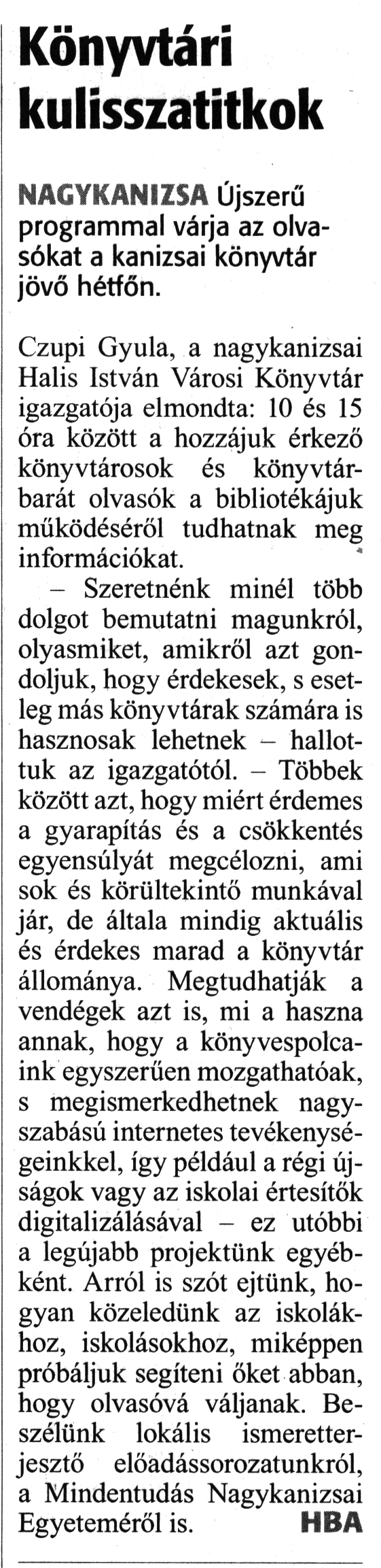 Nyilvános 1714 | 2664 | Zalai Hírlap 2018. október 5. 232. szám 7. oldal - Könyvtári kulisszatitkok | Könyvtári kulisszatitkok NAGYKANIZSA Újszerű programmal várja az olvasókat a kanizsai könyvtár jövő hétfőn. Czupi Gyula, a nagykanizsai Halis István Városi Könyvtár igazgatója elmondta: 10 és 15 óra között a hozzájuk érkező könyvtárosok és könyvtárbarát olvasók a bibliotékájuk működéséről tudhatnak meg információkat. - Szeretnénk minél több dolgot bemutatni magunkról, olyasmiket, amikről azt gondoljuk, hogy érdekesek, s esetleg más könyvtárak számára is hasznosak lehetnek - hallottuk az igazgatótól. - Többek között azt, hogy miért érdemes a gyarapítás és a csökkentés egyensúlyát megcélozni, ami sok és körültekintő munkával jár, de általa mindig aktuális és érdekes marad a könyvtár állománya. Megtudhatják a vendégek azt is, mi a haszna annak, hogy a könyvespolcaink egyszerűen mozgathatóak, s megismerkedhetnek nagyszabású internetes tevékenységeinkkel, így például a régi újságok vagy az iskolai értesítők digitalizálásával - ez utóbbi a legújabb projektünk egyébként. Arról is szót ejtünk, hogyan közeledünk az iskolákhoz, iskolásokhoz, miképpen próbáljuk segíteni őket abban, hogy olvasóvá váljanak. Beszélünk lokális ismeretterjesztő előadássorozatunkról, a Mindentudás Nagykanizsai Egyeteméről is. HBA |