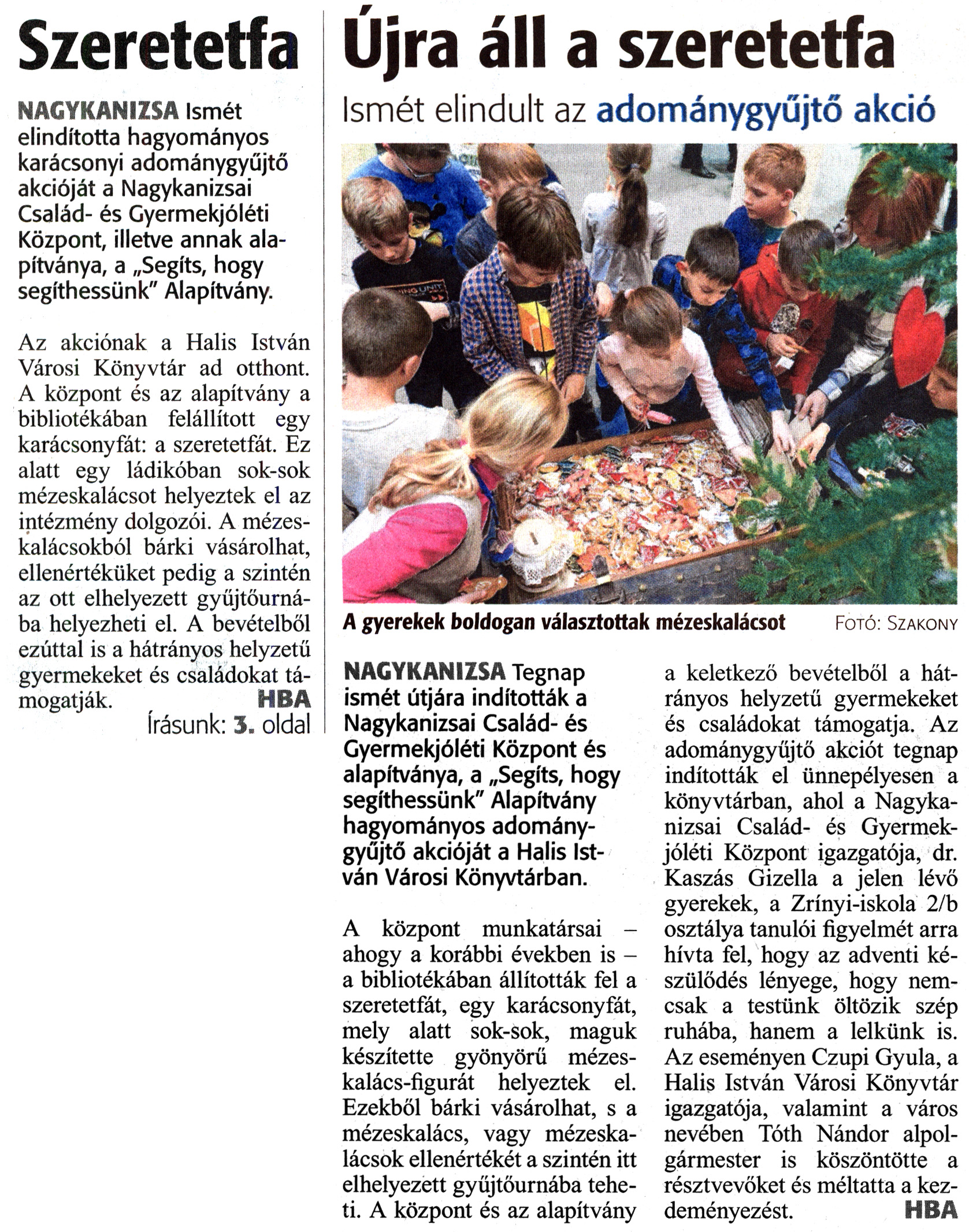 Nyilvános 1625 | 2769 | Zalai Hírlap 2018. december 4. 281. szám 1, 3. oldal | Szeretetfa Újra áll a szeretetfa Ismét elindult az adománygyűjtő akció A gyerekek boldogan választottak mézeskalácsot Fotó: Szakony NAGYKANIZSA Ismét elindította hagyományos karácsonyi adománygyűjtő akcióját a Nagykanizsai Család- és Gyermekjóléti Központ, illetve annak alapítványa, a „Segíts, hogy segíthessünk" Alapítvány. Az akciónak a Halis István Városi Könyvtár ad otthont. A központ és az alapítvány a bibliotékában felállított egy karácsonyfát: a szeretetfát. Ez alatt egy ládikóban sok-sok mézeskalácsot helyeztek el az intézmény dolgozói. A mézeskalácsokból bárki vásárolhat, ellenértéküket pedig a szintén az ott elhelyezett gyűjtőurná-ba helyezheti el. A bevételből ezúttal is a hátrányos helyzetű gyermekeket és családokat támogatják. HBA írásunk: 3. oldal NAGYKANIZSA Tegnap ismét útjára indították a Nagykanizsai Család- és Gyermekjóléti Központ és alapítványa, a „Segíts, hogy segíthessünk" Alapítvány hagyományos adománygyűjtő akcióját a Halis István Városi Könyvtárban. A központ munkatársai -ahogy a korábbi években is -a bibliotékában állították fel a szeretetfát, egy karácsonyfát, mely alatt sok-sok, maguk készítette gyönyörű mézeskalács-figurát helyeztek el. Ezekből bárki vásárolhat, s a mézeskalács, vagy mézeskalácsok ellenértékét a szintén itt elhelyezett gyűjtőurnába teheti. A központ és az alapítvány a keletkező bevételből a hátrányos helyzetű gyermekeket és családokat támogatja. Az adománygyűjtő akciót tegnap indították el ünnepélyesen a könyvtárban, ahol a Nagykanizsai Család- és Gyermekjóléti Központ igazgatója, dr. Kaszás Gizella a jelen lévő gyerekek, a Zrínyi-iskola 2/b osztálya tanulói figyelmét arra hívta fel, hogy az adventi készülődés lényege, hogy nemcsak a testünk öltözik szép ruhába, hanem a lelkünk is. Az eseményen Czupi Gyula, a Halis István Városi Könyvtár igazgatója, valamint a város nevében Tóth Nándor alpolgármester is köszöntötte a résztvevőket és méltatta a kezdeményezést. HBA |