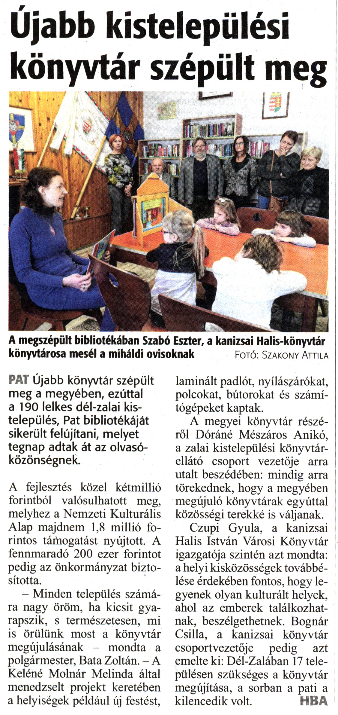 Nyilvános 1562 | 2718 | Zalai Hírlap 2018. december 1. 279. szám 16. oldal | Újabb kistelepülési könyvtár szépült meg A megszépült bibliotékában Szabó Eszter, a kanizsai Halis-könyvtár könyvtárosa mesél a miháldi ovisoknak Fotó: Szakony Attila PAT Újabb könyvtár szépült meg a megyében, ezúttal a 190 lelkes dél-zalai kistelepülés, Pat bibliotékáját sikerült felújítani, melyet tegnap adtak át az olvasóközönségnek. A fejlesztés közel kétmillió forintból valósulhatott meg, melyhez a Nemzeti Kulturális Alap majdnem 1,8 millió forintos támogatást nyújtott. A fennmaradó 200 ezer forintot pedig az önkormányzat biztosította. - Minden település számára nagy öröm, ha kicsit gyarapszik, s természetesen, mi is örülünk most a könyvtár megújulásának - mondta a polgármester, Bata Zoltán. - A Keléné Molnár Melinda által menedzselt projekt keretében a helyiségek például új festést, laminált padlót, nyílászárókat, polcokat, bútorokat és számítógépeket kaptak. A megyei könyvtár részéről Dóráné Mészáros Anikó, a zalai kistelepülési könyvtárellátó csoport vezetője arra utalt beszédében: mindig arra törekednek, hogy a megyében megújuló könyvtárak egyúttal közösségi terekké is váljanak. Czupi Gyula, a kanizsai Halis István Városi Könyvtár igazgatója szintén azt mondta: a helyi kisközösségek továbbélése érdekében fontos, hogy legyenek olyan kulturált helyek, ahol az emberek találkozhatnak, beszélgethetnek. Bognár Csilla, a kanizsai könyvtár csoportvezetője pedig azt emelte ki: Dél-Zalában 17 településen szükséges a könyvtár megújítása, a sorban a pati a kilencedik volt. HBA |