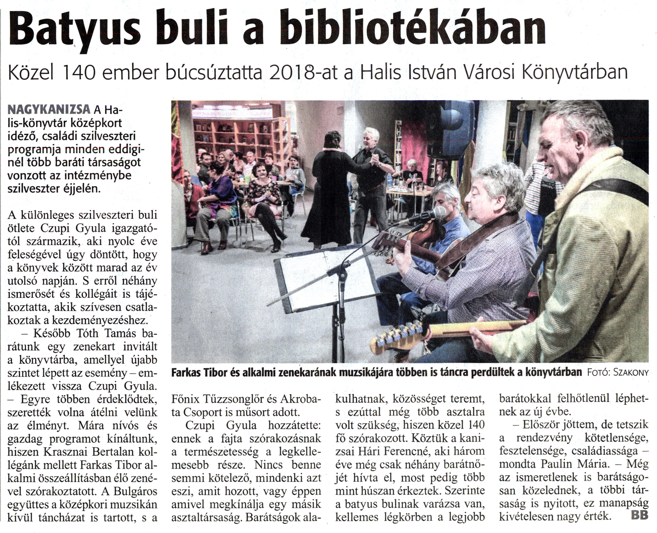 Nyilvános 1749 | 5120 | Zalai Hírlap 2019. január 2. 1. szám 3. oldal | Batyus buli a bibliotékában Közel 140 ember búcsúztatta 2018-at a Halis István Városi Könyvtárban Farkas Tibor és alkalmi zenekarának muzsikájára többen is táncra perdültek a könyvtárban Fotó: Szakony NAGYKANIZSA A Halis-könyvtár középkort idéző, családi szilveszteri programja minden eddiginél több baráti társaságot vonzott az intézménybe szilveszter éjjelén. A különleges szilveszteri buli ötlete Czupi Gyula igazgatótól származik, aki nyolc éve feleségével úgy döntött, hogy a könyvek között marad az év utolsó napján. S erről néhány ismerősét és kollégáit is tájékoztatta, akik szívesen csatlakoztak a kezdeményezéshez. - Később Tóth Tamás barátunk egy zenekart invitált a könyvtárba, amellyel újabb szintet lépett az esemény - emlékezett vissza Czupi Gyula. - Egyre többen érdeklődtek, szerették volna átélni velünk az élményt. Mára nívós és gazdag programot kínáltunk, hiszen Krasznai Bertalan kollégánk mellett Farkas Tibor alkalmi összeállításban élő zenével szórakoztatott. A Bulgáros együttes a középkori muzsikán kívül táncházat is tartott, s a Főnix Tűzzsonglőr és Akrobata Csoport is műsort adott. Czupi Gyula hozzátette: ennek a fajta szórakozásnak a természetesség a legkellemesebb része. Nincs benne semmi kötelező, mindenki azt eszi, amit hozott, vagy éppen amivel megkínálja egy másik asztaltársaság. Barátságok alakulhatnak, közösséget teremt, s ezúttal még több asztalra volt szükség, hiszen közel 140 fő szórakozott. Köztük a kanizsai Hári Ferencné, aki három éve még csak néhány barátnőjét hívta el, most pedig több mint húszan érkeztek. Szerinte a batyus bulinak varázsa van, kellemes légkörben a legjobb barátokkal felhőtlenül léphetnek az új évbe. - Először jöttem, de tetszik a rendezvény kötetlensége, fesztelensége, családiassága -mondta Paulin Mária. - Még az ismeretlenek is barátságosan közelednek, a többi társaság is nyitott, ez manapság kivételesen nagy érték. BB |