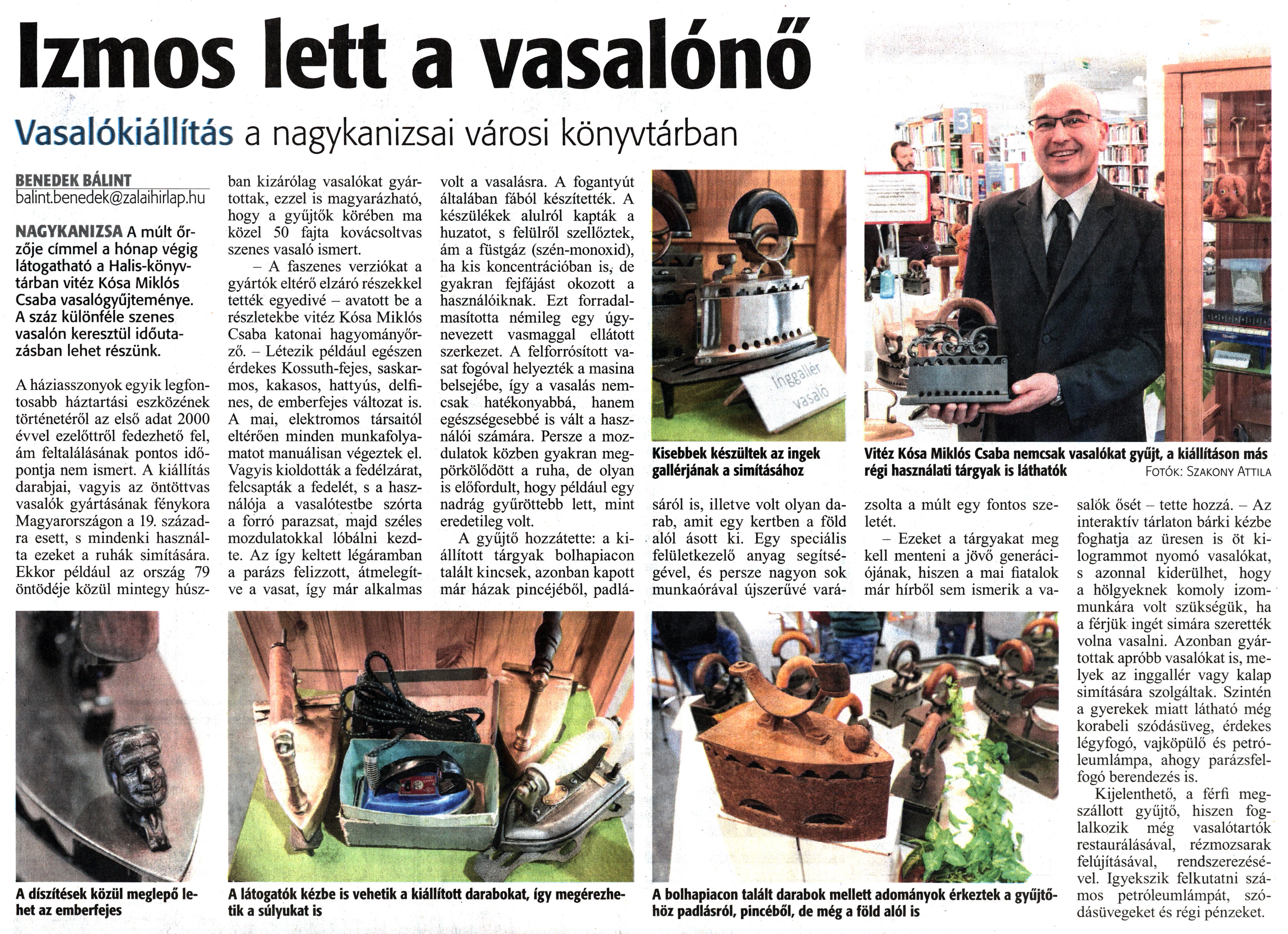 Nyilvános 1691 | 2962 | Zalai Hírlap 2019. március 26. 71. szám 9. oldal | BENEDEK BÁLINT balint.benedek@zalaihirlap.hu NAGYKANIZSA A múlt őrzője címmel a hónap végig látogatható a Halis-könyvtárban vitéz Kósa Miklós Csaba vasalógyűjteménye. A száz különféle szenes vasalón keresztül időutazásban lehet részünk. A háziasszonyok egyik legfontosabb háztartási eszközének történetéről az első adat 2000 évvel ezelőttről fedezhető fel, ám feltalálásának pontos időpontja nem ismert. A kiállítás darabjai, vagyis az öntöttvas vasalók gyártásának fénykora Magyarországon a 19. századra esett, s mindenki használta ezeket a ruhák simítására. Ekkor például az ország 79 öntödéje közül mintegy húszban kizárólag vasalókat gyártottak, ezzel is magyarázható, hogy a gyűjtők körében ma közel 50 fajta kovácsoltvas szenes vasaló ismert. - A faszenes verziókat a gyártók eltérő elzáró részekkel tették egyedivé - avatott be a részletekbe vitéz Kósa Miklós Csaba katonai hagyományőrző. - Létezik például egészen érdekes Kossuth-fejes, saskarmos, kakasos, hattyús, delfines, de emberfejes változat is. A mai, elektromos társaitól eltérően minden munkafolyamatot manuálisan végeztek el. Vagyis kioldották a fedélzárat, felcsapták a fedelét, s a használója a vasalótestbe szórta a forró parazsat, majd széles mozdulatokkal lóbálni kezdte. Az így keltett légáramban a parázs felizzott, átmelegítve a vasat, így már alkalmas volt a vasalásra. A fogantyút általában fából készítették. A készülékek alulról kapták a huzatot, s felülről szellőztek, ám a füstgáz (szén-monoxid), ha kis koncentrációban is, de gyakran fejfájást okozott a használóiknak. Ezt forradalmasította némileg egy úgynevezett vasmaggal ellátott szerkezet. A felforrósított vasat fogóval helyezték a masina belsejébe, így a vasalás nemcsak hatékonyabbá, hanem egészségesebbé is vált a használói számára. Persze a mozdulatok közben gyakran megpörkölődött a ruha, de olyan is előfordult, hogy például egy nadrág gyűröttebb lett, mint eredetileg volt. A gyűjtő hozzátette: a kiállított tárgyak bolhapiacon talált kincsek, azonban kapott már házak pincéjéből, padlásáról is, illetve volt olyan darab, amit egy kertben a föld alól ásott ki. Egy speciális felületkezelő anyag segítségével, és persze nagyon sok munkaórával újszerűvé varázsolta a múlt egy fontos szeletét. - Ezeket a tárgyakat meg kell menteni a jövő generációjának, hiszen a mai fiatalok már hírből sem ismerik a vasalók ősét - tette hozzá. - Az interaktív tárlaton bárki kézbe foghatja az üresen is öt kilogrammot nyomó vasalókat, s azonnal kiderülhet, hogy a hölgyeknek komoly izommunkára volt szükségük, ha a férjük ingét simára szerették volna vasalni. Azonban gyártottak apróbb vasalókat is, melyek az inggallér vagy kalap simítására szolgáltak. Szintén a gyerekek miatt látható még korabeli szódásüveg, érdekes légyfogó, vajköpülő és petróleumlámpa, ahogy parázsfelfogó berendezés is. Kijelenthető, a férfi megszállott gyűjtő, hiszen foglalkozik még vasalótartók restaurálásával, rézmozsarak felújításával, rendszerezésével. Igyekszik felkutatni számos petróleumlámpát, szódásüvegeket és régi pénzeket. A látogatók kézbe is vehetik a kiállított darabokat, így megérezhetik a súlyukat is A bolhapiacon talált darabok mellett adományok érkeztek a gyűjtőhöz padlásról, pincéből, de még a föld alól is A díszítések közül meglepő lehet az emberfejes Izmos lett a vasalónő Vasalókiállítás a nagykanizsai városi könyvtárban Vitéz Kósa Miklós Csaba nemcsak vasalókat gyűjt, a kiállításon más régi használati tárgyak is láthatók Fotók: Szakony Attila |
