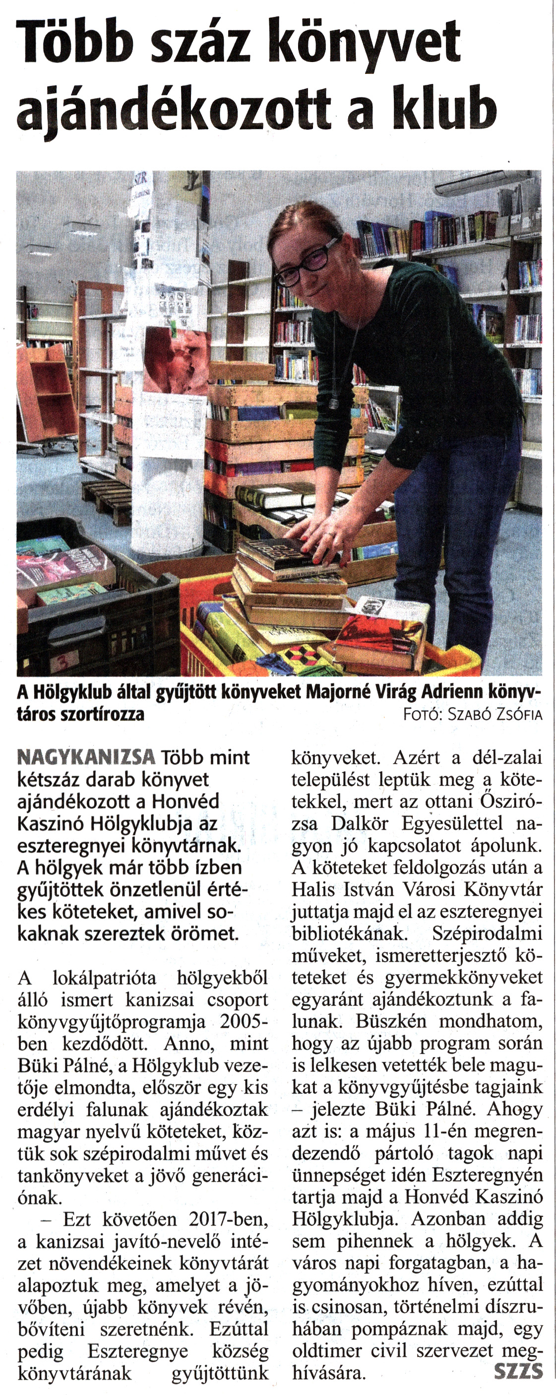 Nyilvános 1722 | 2919 | Zalai Hírlap 2019. április 25. 95. szám 16. oldal | Több száz könyvet ajándékozott a klub A Hölgyklub által gyűjtött könyveket Majorné Virág Adrienn könyvtáros szortírozza Fotó: Szabó Zsófia NAGYKANIZSA Több mint kétszáz darab könyvet ajándékozott a Honvéd Kaszinó Hölgyklubja az eszteregnyei könyvtárnak. A hölgyek már több ízben gyűjtöttek önzetlenül értékes köteteket, amivel sokaknak szereztek örömet. A lokálpatrióta hölgyekből álló ismert kanizsai csoport könyvgyűjtőprogramja 2005-ben kezdődött. Anno, mint Büki Pálné, a Hölgyklub vezetője elmondta, először egy kis erdélyi falunak ajándékoztak magyar nyelvű köteteket, köztük sok szépirodalmi müvet és tankönyveket a jövő generációnak. - Ezt követően 2017-ben, a kanizsai javító-nevelő intézet növendékeinek könyvtárát alapoztuk meg, amelyet a jövőben, újabb könyvek révén, bővíteni szeretnénk. Ezúttal pedig Eszteregnye község könyvtárának gyűjtöttünk könyveket. Azért a dél-zalai települést leptük meg a kötetekkel, mert az ottani Őszirózsa Dalkör Egyesülettel nagyon jó kapcsolatot ápolunk. A köteteket feldolgozás után a Halis István Városi Könyvtár juttatja majd el az eszteregnyei bibliotékának. Szépirodalmi műveket, ismeretterjesztő köteteket és gyermekkönyveket egyaránt ajándékoztunk a falunak. Büszkén mondhatom, hogy az újabb program során is lelkesen vetették bele magukat a könyvgyűjtésbe tagjaink - jelezte Büki Pálné. Ahogy azt is: a május 11-én megrendezendő pártoló tagok napi ünnepséget idén Eszteregnyén tartja majd a Honvéd Kaszinó Hölgyklubja. Azonban addig sem pihennek a hölgyek. A város napi forgatagban, a hagyományokhoz híven, ezúttal is csinosan, történelmi díszruhában pompáznak majd, egy oldtimer civil szervezet meghívására. SZZS |