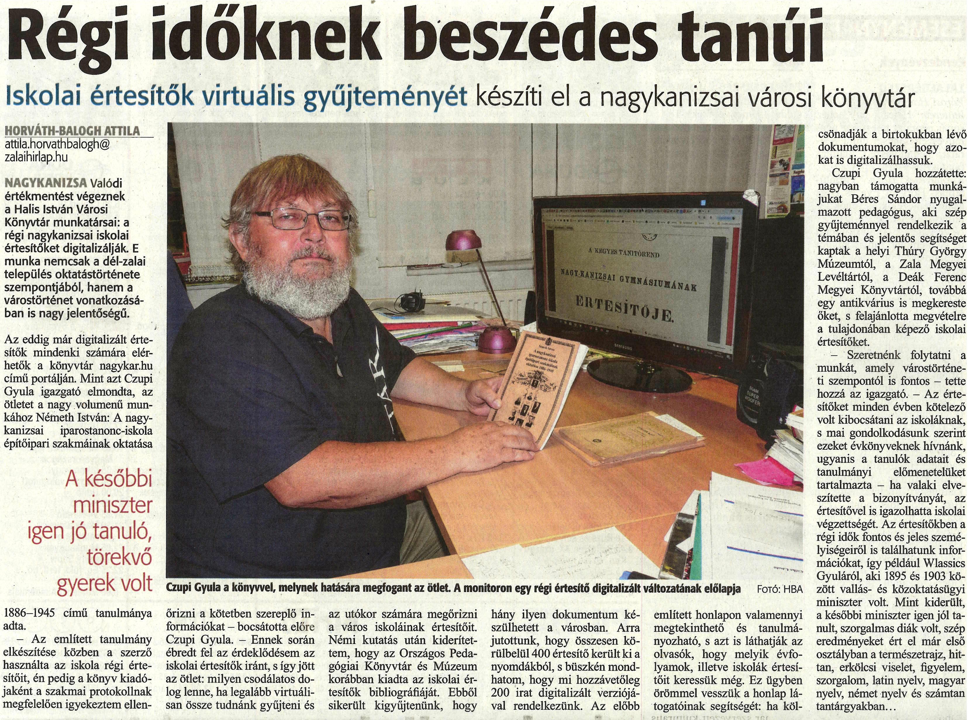 Nyilvános 1402 | 2428 | Régi időknek beszédes tanúi | Iskolai értesítők virtuális gyűjteményét készíti el a nagykanizsai városi könyvtár HORVÁTH-BALOGH ATTILA attila.horvathbalogh@zalaihirlap.hu NAGYKANIZSA Valódi értékmentést végeznek a Halis István Városi Könyvtár munkatársai: a régi nagykanizsai iskolai értesítőket digitalizálják. E munka nemcsak a dél-zalai település oktatástörténete szempontjából, hanem a várostörténet vonatkozásában is nagy jelentőségű. Az eddig már digitalizált értesítők mindenki számára elérhetők a könyvtár nagykar.hu című portálján. Mint azt Czupi Gyula igazgató elmondta, az ötletet a nagy volumenű munkához Németh István: A nagykanizsai iparostanonc-iskola építőipari szakmáinak oktatása - A későbbi miniszter igen jó tanuló, törekvő gyerek volt - 1886-1945 című tanulmánya adta. -Az említett tanulmány elkészítése közben a szerző használta az iskola régi értesítőit, én pedig a könyv kiadójaként a szakmai protokollnak megfelelően igyekeztem ellenőrizni a kötetben szereplő információkat - bocsátotta előre Czupi Gyula. - Ennek során ébredt fel az érdeklődésem az iskolai értesítők iránt, s így jött az ötlet: milyen csodálatos dolog lenne, ha legalább virtuálisan össze tudnánk gyűjteni és az utókor számára megőrizni a város iskoláinak értesítőit. Némi kutatás után kiderítettem, hogy az Országos Pedagógiai Könyvtár és Múzeum korábban kiadta az iskolai értesítők bibliográfiáját. Ebből sikerült kigyűjtenünk, hogy hány ilyen dokumentum készülhetett a városban. Arra jutottunk, hogy összesen körülbelül 400 értesítő került ki a nyomdákból, s büszkén mondhatom, hogy mi hozzávetőleg 200 irat digitalizált verziójával rendelkezünk. Az előbb említett honlapon valamennyi megtekinthető és tanulmányozható, s azt is láthatják az olvasók, hogy melyik évfolyamok, illetve iskolák értesítőit keressük még. Ez ügyben örömmel vesszük a honlap látogatóinak segítségét: ha kölcsönadják a birtokukban lévő dokumentumokat, hogy azokat is digitalizálhassuk. Czupi Gyula hozzátette: nagyban támogatta munkájukat Béres Sándor nyugalmazott pedagógus, aki szép gyűjteménnyel rendelkezik a témában és jelentős segítséget kaptak a helyi Thúry György Múzeumtól, a Zala Megyei Levéltártól, a Deák Ferenc Megyei Könyvtártól, továbbá egy antikvárius is megkereste őket, s felajánlotta megvételre a tulajdonában képező iskolai értesítőket. - Szeretnénk folytatni a munkát, amely várostörténeti szempontéi is fontos - tette hozzá az igazgató. - Az értesítőket minden évben kötelező volt kibocsátani az iskoláknak, s mai gondolkodásunk szerint ezeket évkönyveknek hívnánk, ugyanis a tanulók adatait és tanulmányi előmenetelüket tartalmazta - ha valaki elveszítette a bizonyítványát, az értesítővel is igazolhatta iskolai végzettségét. Az értesítőkben a régi idők fontos és jeles személyiségeiről is találhatunk információkat, így például Wlassics Gyuláról, aki 1895 és 1903 között vallás- és közoktatásügyi miniszter volt. Mint kiderült, a későbbi miniszter igen jól tanult, szorgalmas diák volt, szép eredményeket ért el már első osztályban a természetrajz, hittan, erkölcsi viselet, figyelem, szorgalom, latin nyelv, magyar nyelv, német nyelv és számtan tantárgyakban... Czupi Gyula a könyvvel, melynek hatására megfogant az ötlet. A monitoron egy régi értesítő digitalizált változatának előlapja Fotó: HBA |