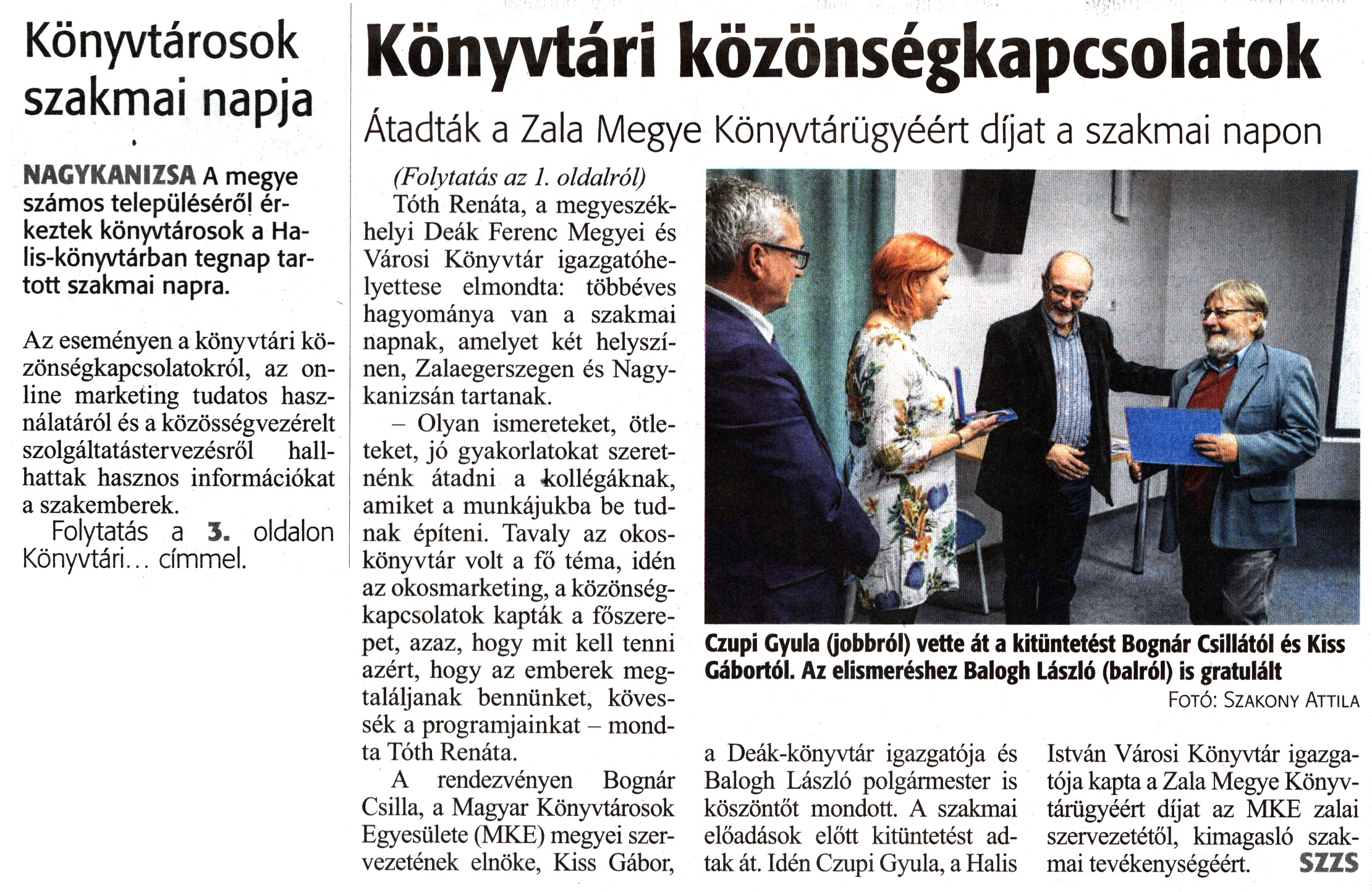 Nyilvános 1623 | 2708 | Zalai Hírlap 2019. november 26. 274. szám, 1, 3. oldal | Könyvtári közönségkapcsolatok Átadták a Zala Megye Könyvtárügyéért díjat a szakmai napon Könyvtárosok szakmai napja NAGYKANIZSA A megye számos településéről érkeztek könyvtárosok a Halis-könyvtárban tegnap tartott szakmai napra. Az eseményen a könyvtári közönségkapcsolatokról, az online marketing tudatos használatáról és a közösségvezérelt szolgáltatástervezésről hallhattak hasznos információkat a szakemberek. Folytatás a 3. oldalon Könyvtári... címmel. (Folytatás az 1. oldalról) Tóth Renáta, a megyeszékhelyi Deák Ferenc Megyei és Városi Könyvtár igazgatóhelyettese elmondta: többéves hagyománya van a szakmai napnak, amelyet két helyszínen, Zalaegerszegen és Nagykanizsán tartanak. - Olyan ismereteket, ötleteket, jó gyakorlatokat szeretnénk átadni a kollégáknak, amiket a munkájukba be tudnak építeni. Tavaly az okoskönyvtár volt a fő téma, idén az okosmarketing, a közönségkapcsolatok kapták a főszerepet, azaz, hogy mit kell tenni azért, hogy az emberek megtaláljanak bennünket, kövessék a programjainkat - mondta Tóth Renáta. A rendezvényen Bognár Csilla, a Magyar Könyvtárosok Egyesülete (MKE) megyei szervezetének elnöke, Kiss Gábor, a Deák-könyvtár igazgatója és Balogh László polgármester is köszöntőt mondott. A szakmai előadások előtt kitüntetést adtak át. Idén Czupi Gyula, a Halis István Városi Könyvtár igazgatója kapta a Zala Megye Könyvtárügyéért díjat az MKE zalai szervezetétől, kimagasló szakmai tevékenységéért. Czupi Gyula (jobbról) vette át a kitüntetést Bognár Csillától és Kiss Gábortól. Az elismeréshez Balogh László (balról) is gratulált Fotó: Szakony Attila SZZS |