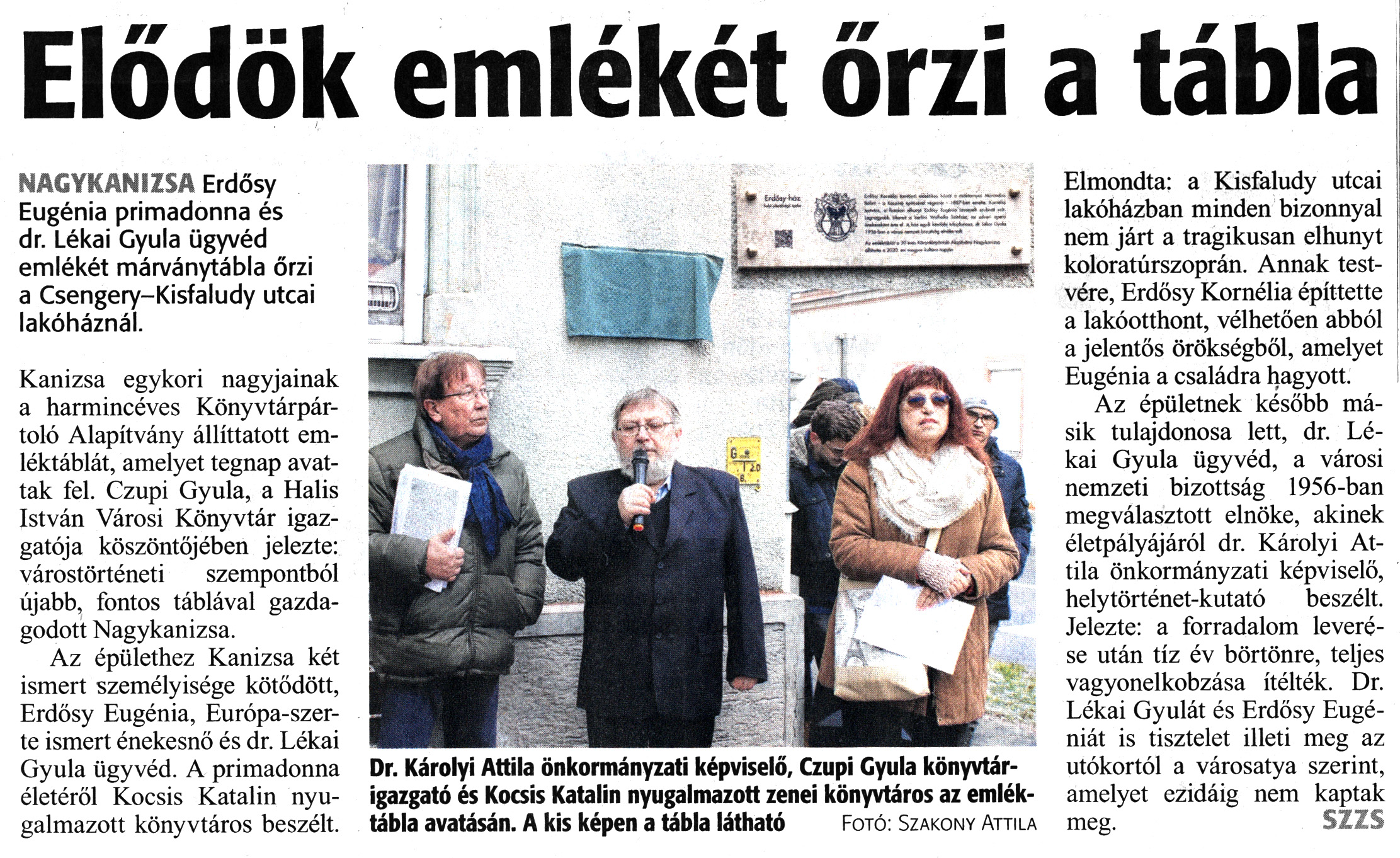Nyilvános 1566 | 2644 | Zalai Hírlap 2020. január 23. 19. szám 3. oldal | Elődök emlékét őrzi a tábla NAGYKANIZSA Erdősy Eugénia primadonna és dr. Lékai Gyula ügyvéd emlékét márványtábla őrzi a Csengery-Kisfaludy utcai lakóháznál. Kanizsa egykori nagyjainak a harmincéves Könyvtárpártoló Alapítvány állíttatott emléktáblát, amelyet tegnap avattak fel. Czupi Gyula, a Halis István Városi Könyvtár igazgatója köszöntőjében jelezte: várostörténeti szempontból újabb, fontos táblával gazdagodott Nagykanizsa. Az épülethez Kanizsa két ismert személyisége kötődött, Erdősy Eugénia, Európa-szerte ismert énekesnő és dr. Lékai Gyula ügyvéd. A primadonna életéről Kocsis Katalin nyugalmazott könyvtáros beszélt. Elmondta: a Kisfaludy utcai lakóházban minden bizonnyal nem járt a tragikusan elhunyt koloratúrszoprán. Annak testvére, Erdősy Kornélia építtette a lakóotthont, vélhetően abból a jelentős örökségből, amelyet Eugénia a családra hagyott. Az épületnek később másik tulajdonosa lett, dr. Lékai Gyula ügyvéd, a városi nemzeti bizottság 1956-ban megválasztott elnöke, akinek életpályájáról dr. Károlyi Attila önkormányzati képviselő, helytörténet-kutató beszélt. Jelezte: a forradalom leverése után tíz év börtönre, teljes vagyonelkobzása ítélték. Dr. Lékai Gyulát és Erdősy Eugéniát is tisztelet illeti meg az utókortól a városatya szerint, amelyet ezidáig nem kaptak meg. SZZS Dr. Károlyi Attila önkormányzati képviselő, Czupi Gyula könyvtárigazgató és Kocsis Katalin nyugalmazott zenei könyvtáros az emléktábla avatásán. A kis képen a tábla látható Fotó: Szakony Attila |