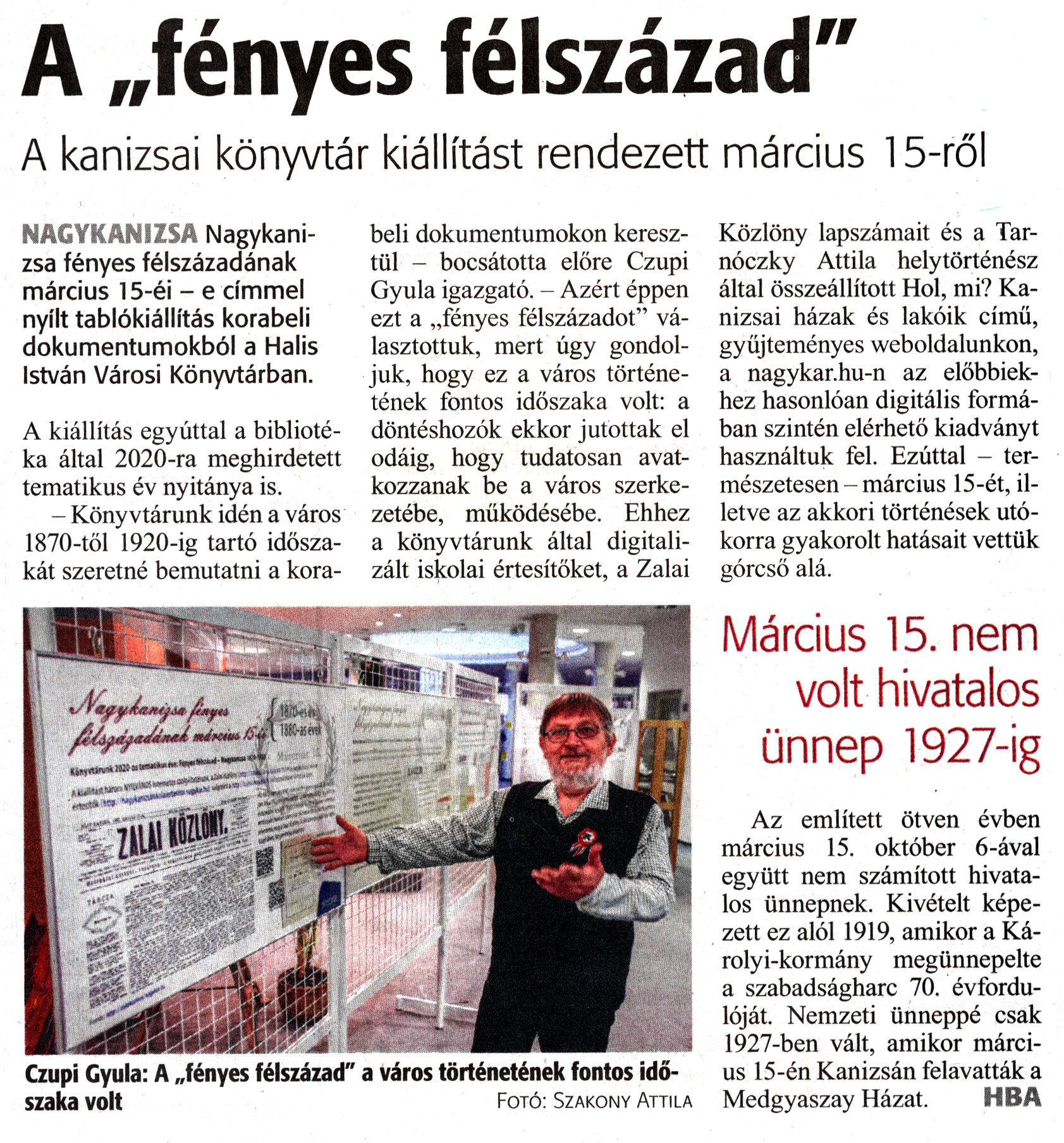 Nyilvános 1474 | 2151 | Zalai Hírlap 2020. március 14. 63. szám 7. oldal | A „fényes félszázad" A kanizsai könyvtár kiállítást rendezett március 15-ről NAGYKANIZSA Nagykanizsa fényes félszázadának március 15-éi - e címmel nyílt tablókiállítás korabeli dokumentumokból a Halis István Városi Könyvtárban. A kiállítás egyúttal a bibliotéka által 2020-ra meghirdetett tematikus év nyitánya is. - Könyvtárunk idén a város 1870-től 1920-ig tartó időszakát szeretné bemutatni a korabeli dokumentumokon keresztül - bocsátotta előre Czupi Gyula igazgató. - Azért éppen ezt a „fényes félszázadot" választottuk, mert úgy gondoljuk, hogy ez a város történetének fontos időszaka volt: a döntéshozók ekkor jutottak el odáig, hogy tudatosan avatkozzanak be a város szerkezetébe, működésébe. Ehhez a könyvtárunk által digitalizált iskolai értesítőket, a Zalai Közlöny lapszámait és a Tarnóczky Attila helytörténész által összeállított Hol, mi? Kanizsai házak és lakóik című, gyűjteményes weboldalunkon, a nagykar.hu-n az előbbiekhez hasonlóan digitális formában szintén elérhető kiadványt használtuk fel. Ezúttal - természetesen - március 15-ét, illetve az akkori történések utókorra gyakorolt hatásait vettük górcső alá. Az említett ötven évben március 15. október 6-ával együtt nem számított hivatalos ünnepnek. Kivételt képezett ez alól 1919, amikor a Károlyi-kormány megünnepelte a szabadságharc 70. évfordulóját. Nemzeti ünneppé csak 1927-ben vált, amikor március 15-én Kanizsán felavatták a Medgyaszay Házat. HBA Czupi Gyula: A „fényes félszázad" a város történetének fontos időszaka volt Fotó: Szakony Attila |