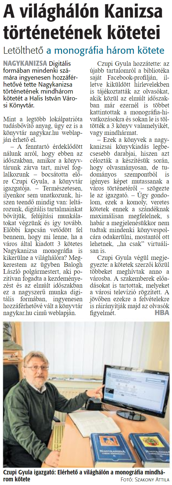 Nyilvános 2124 | 2313 | Zalai Hírlap 2020. április 27. 98. szám 3. oldal | A világhálón Kanizsa történetének kötetei Letölthető a monográfia három kötete NAGYKANIZSA Digitális formában mindenki számára ingyenesen hozzáférhetővé tette Nagykanizsa történetének mindhárom kötetét a Halis István Városi Könyvtár. Mint a legtöbb lokálpatrióta tudásbővítő anyag, úgy ez is a könyvtár nagykar.hu weblapján érhető el. - A fenntartó érdeklődött nálunk arról, hogy ebben az időszakban, amikor a könyvtárunk zárva tart, mivel foglalkozunk - bocsátotta előre Czupi Gyula, a könyvtár igazgatója. - Természetesen, ilyenkor sem unatkozunk, hiszen teendő mindig van: leltározunk, digitális tartalmainkat bővítjük, felújítási munkálatokat végzünk és így tovább. Előbbi kapcsán vetődött fel bennem, hogy mi lenne, ha a város által kiadott 3 kötetes Nagykanizsa monográfia is kikerülne a világhálóra? Megkerestem az ügyben Balogh László polgármestert, aki pozitívan fogadta a kezdeményezést és az elmúlt időszakban ez a nagyszerű munka digitális formában, ingyenesen hozzáférhetővé vált a könyvtár nagykar.hu című weblapján. Czupi Gyula hozzátette: az újabb tartalomról a bibliotéka saját Facebook-profilján, illetve kiküldött hírlevelekben is tájékoztatták az olvasókat, akik közül az elmúlt időszakban már ezernél is többet kattintottak a monográfia-hivatkozásokra és sokan le is töltötték a 3 könyv valamelyikét, vagy mindhármat. - Ezek a könyvek a nagykanizsai könyvkiadás legbecsesebb darabjai, hiszen azt célozták a készítésük során, hogy olvasmányosan, de tudományos szempontból is igényes képet mutassanak a város történetéről - szögezte le az igazgató. - Úgy gondolom, ezek a komoly, veretes kötetek ennek a szándéknak maximálisan megfelelnek, s habár a megjelenésükkor nem tudtak mindenki könyvespolcára odakerülni, mostantól ott lehetnek, „ha csak" virtuálisan is. Czupi Gyula végül megjegyezte: a kötetek szerzői közül többeket meghívtak anno a városba. A szakemberek előadásokat is tartottak, melyeket a városi televízió rögzített. A jövőben ezekre a felvételekre is ráirányítják majd az olvasók figyelmét. HBA Czupi Gyula igazgató: Elérhető a világhálón a monográfia mindhárom kötete Fotó: Szakony Attila |