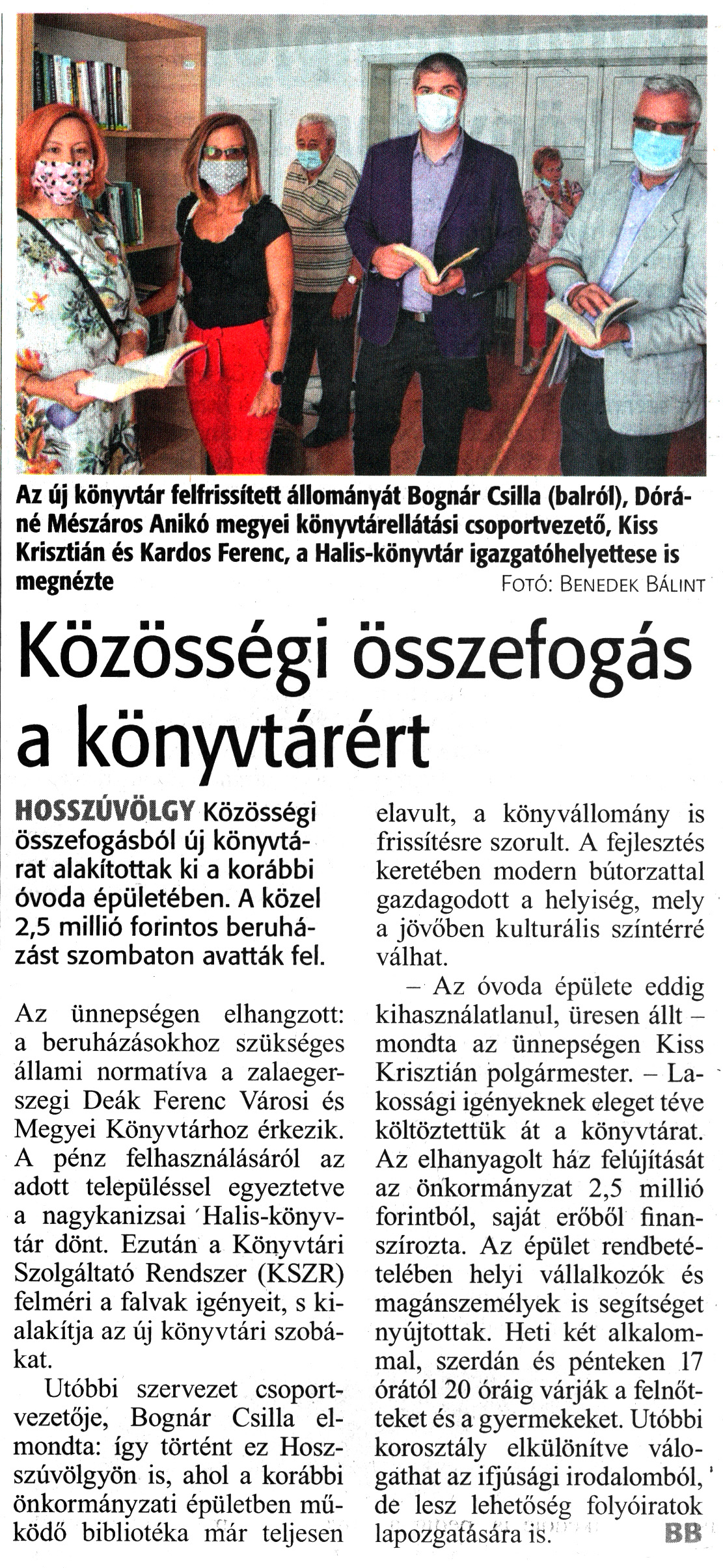 Nyilvános 1363 | 1941 | Zalai Hírlap 2020. szeptember 21. 221. szám 6. oldal | Közösségi összefogás a könyvtárért HOSSZÚVÖLGY Közösségi összefogásból új könyvtárat alakítottak ki a korábbi óvoda épületében. A közel 2,5 millió forintos beruházást szombaton avatták fel. Az ünnepségen elhangzott: a beruházásokhoz szükséges állami normatíva a zalaegerszegi Deák Ferenc Városi és Megyei Könyvtárhoz érkezik. A pénz felhasználásáról az adott településsel egyeztetve a nagykanizsai Halis-könyvtár dönt. Ezután a Könyvtári Szolgáltató Rendszer (KSZR) felméri a falvak igényeit, s kialakítja az új könyvtári szobákat. Utóbbi szervezet csoportvezetője, Bognár Csilla elmondta: így történt ez Hosszúvölgyön is, ahol a korábbi önkormányzati épületben működő bibliotéka már teljesen elavult, a könyvállomány is frissítésre szorult. A fejlesztés keretében modern bútorzattal gazdagodott a helyiség, mely a jövőben kulturális színtérré válhat. - Az óvoda épülete eddig kihasználatlanul, üresen állt -mondta az ünnepségen Kiss Krisztián polgármester. - Lakossági igényeknek eleget téve költöztettük át a könyvtárat. Az elhanyagolt ház felújítását az önkormányzat 2,5 millió forintból, saját erőből finanszírozta. Az épület rendbetételében helyi vállalkozók és magánszemélyek is segítséget nyújtottak. Heti két alkalommal, szerdán és pénteken 17 órától 20 óráig várják a felnőtteket és a gyermekeket. Utóbbi korosztály elkülönítve válogathat az ifjúsági irodalomból, de lesz lehetőség folyóiratok lapozgatására is. BB Az új könyvtár felfrissített állományát Bognár Csilla (balról), Dóráné Mészáros Anikó megyei könyvtárellátási csoportvezető, Kiss Krisztián és Kardos Ferenc, a Halis-könyvtár igazgatóhelyettese is megnézte Fotó: Benedek Bálint |