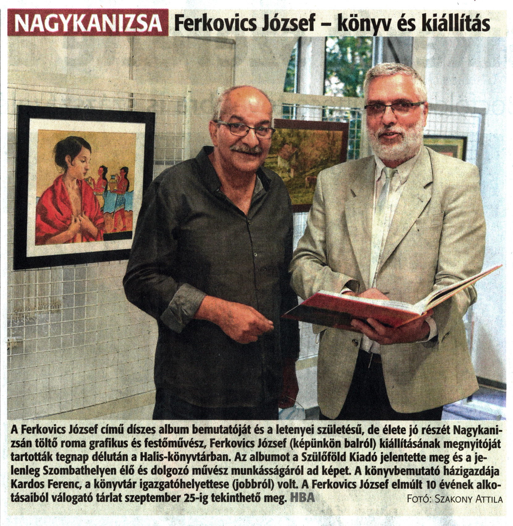Nyilvános 1563 | 2373 | Zalai Hírlap 2020. szeptember 24. 224. szám 16. oldal - Ferkovics József - könyv és kiállítás | A Ferkovics József című díszes album bemutatóját és a letenyei születésű, de élete jó részét Nagykanizsán töltő roma grafikus és festőművész, Ferkovics József (képünkön balról) kiállításának megnyitóját tartották tegnap délután a Halis-könyvtárban. Az albumot a Szülőföld Kiadó jelentette meg és a jelenleg Szombathelyen élő és dolgozó művész munkásságáról ad képet. A könyvbemutató házigazdája Kardos Ferenc, a könyvtár igazgatóhelyettese (jobbról) volt. A Ferkovics József elmúlt 10 évének alkotásaiból válogató tárlat szeptember 25-ig tekinthető meg. HBA Fotó: Szakony Attila |