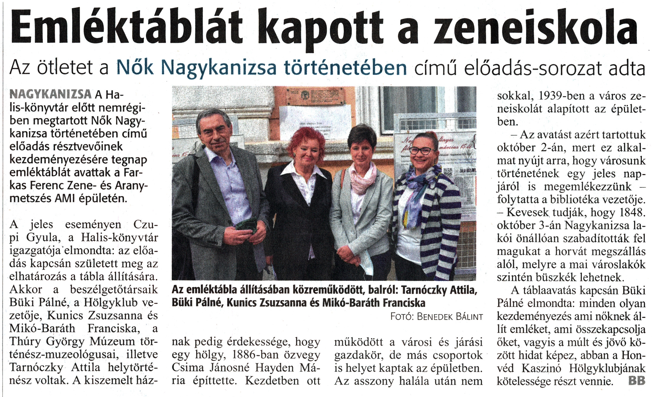 Nyilvános 1344 | 1808 | Zalai Hírlap 2020. október 3. 232. szám 4. oldal | Emléktáblát kapott a zeneiskola Az ötletet a Nők Nagykanizsa történetében című előadás-sorozat adta Az emléktábla állításában közreműködött, balról: Tarnóczky Attila, Büki Pálné, Kunics Zsuzsanna és Mikó-Baráth Franciska Fotó: Benedek Bálint NAGYKANIZSA A Halis-könyvtár előtt nemrégiben megtartott Nők Nagykanizsa történetében című előadás résztvevőinek kezdeményezésére tegnap emléktáblát avattak a Farkas Ferenc Zene- és Aranymetszés AMI épületén. A jeles eseményen Czupi Gyula, a Halis-könyvtár igazgatója elmondta: az előadás kapcsán született meg az elhatározás a tábla állítására. Akkor a beszélgetőtársaik Büki Pálné, a Hölgyklub vezetője, Kunics Zsuzsanna és Mikó-Baráth Franciska, a Thúry György Múzeum történész-muzeológusai, illetve Tarnóczky Attila helytörténész voltak. A kiszemelt háznak pedig érdekessége, hogy egy hölgy, 1886-ban özvegy Csima Jánosné Hayden Mária építtette. Kezdetben ott működött a városi és járási gazdakör, de más csoportok is helyet kaptak az épületben. Az asszony halála után nem sokkal, 1939-ben a város zeneiskolát alapított az épületben. - Az avatást azért tartottuk október 2-án, mert ez alkalmat nyújt arra, hogy városunk történetének egy jeles napjáról is megemlékezzünk -folytatta a bibliotéka vezetője. - Kevesek tudják, hogy 1848. október 3-án Nagykanizsa lakói önállóan szabadították fel magukat a horvát megszállás alól, melyre a mai városlakók szintén büszkék lehetnek. A táblaavatás kapcsán Büki Pálné elmondta: minden olyan kezdeményezés ami nőknek állít emléket, ami összekapcsolja őket, vagyis a múlt és jövő között hidat képez, abban a Honvéd Kaszinó Hölgyklubjának kötelessége részt vennie. BB |