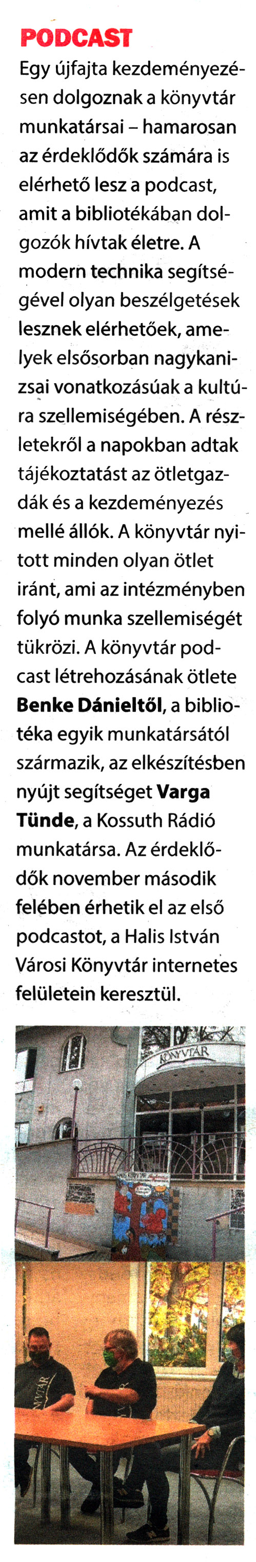 Nyilvános 1555 | 2512 | Kanizsa 2020. november 6. 40. szám 3. oldal | PODCAST Egy újfajta kezdeményezésen dolgoznak a könyvtár munkatársai - hamarosan az érdeklődők számára is elérhető lesz a podcast, amit a bibliotékában dolgozók hívtak életre. A modern technika segítségével olyan beszélgetések lesznek elérhetőek, amelyek elsősorban nagykanizsai vonatkozásúak a kultúra szellemiségében. A részletekről a napokban adtak tájékoztatást az ötletgazdák és a kezdeményezés mellé állók. A könyvtár nyitott minden olyan ötlet iránt, ami az intézményben folyó munka szellemiségét tükrözi. A könyvtár podcast létrehozásának ötlete Benke Dánieltől, a bibliotéka egyik munkatársától származik, az elkészítésben nyújt segítséget Varga Tünde, a Kossuth Rádió munkatársa. Az érdeklődők november második felében érhetik el az első podcastot, a Halis István Városi Könyvtár internetes felületein keresztül. |