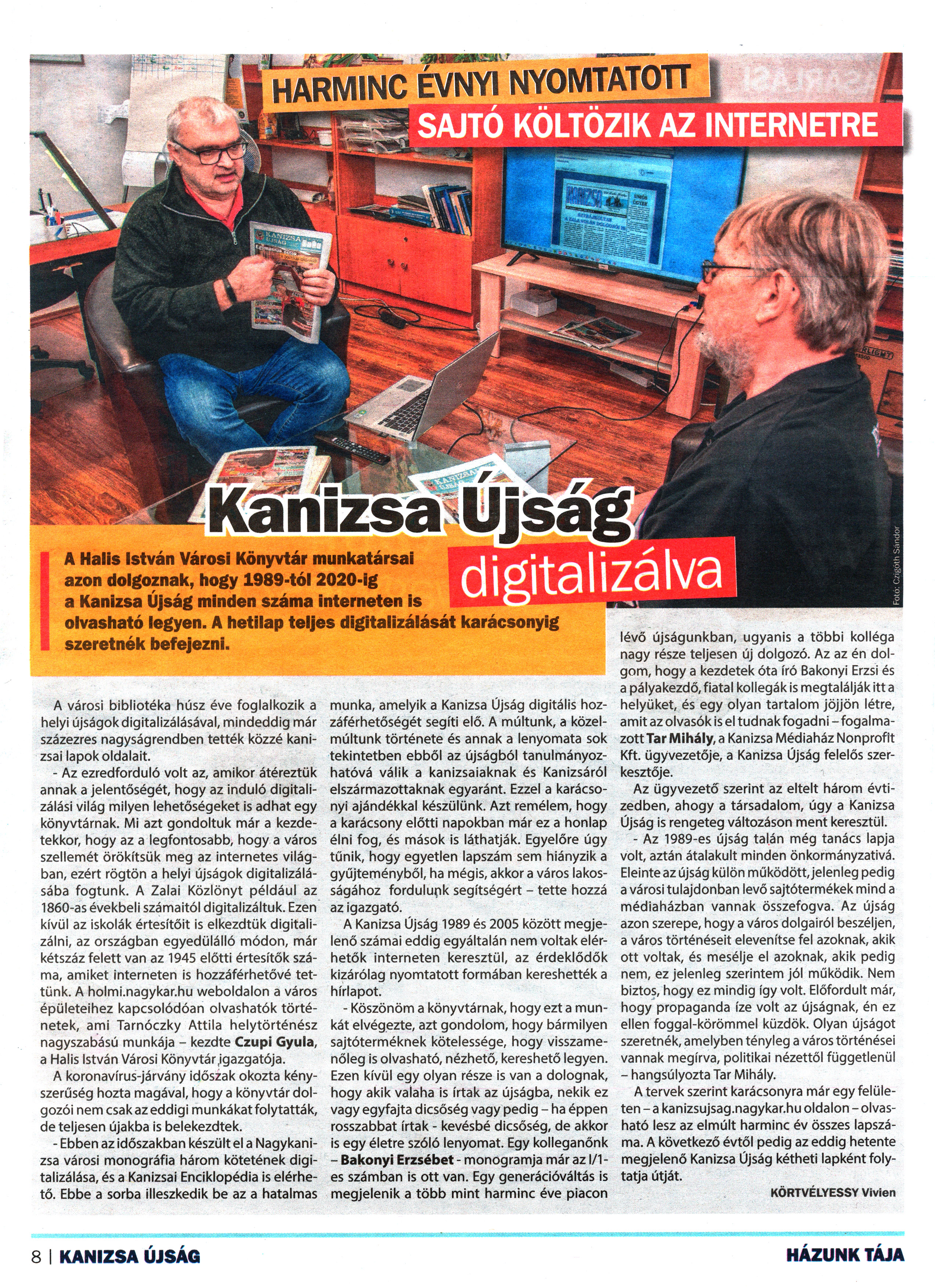 Nyilvános 1669 | 2100 | Kanizsa 2020. december 18. 46. szám 8. oldal | Kanizsa Újság digitalizálva Harminc évnyi nyomtatott sajtó költözik az internetre A Halis István Városi Könyvtár munkatársai azon dolgoznak, hogy 1989-tól 2020-ig a Kanizsa Újság minden száma interneten is olvasható legyen. A hetilap teljes digitalizálását karácsonyig szeretnék befejezni. A városi bibliotéka húsz éve foglalkozik a helyi újságok digitalizálásával, mindeddig már százezres nagyságrendben tették közzé kanizsai lapok oldalait. - Az ezredforduló volt az, amikor átéreztük annak a jelentőségét, hogy az induló digitalizálási világ milyen lehetőségeket is adhat egy könyvtárnak. Mi azt gondoltuk már a kezdetekkor, hogy az a legfontosabb, hogy a város szellemét örökítsük meg az internetes világban, ezért rögtön a helyi újságok digitalizálásába fogtunk. A Zalai Közlönyt például az 1860-as évekbeli számaitól digitalizáltuk. Ezen kívül az iskolák értesítőit is elkezdtük digitalizálni, az országban egyedülálló módon, már kétszáz felett van az 1945 előtti értesítők száma, amiket interneten is hozzáférhetővé tettünk. A holmi.nagykar.hu weboldalon a város épületeihez kapcsolódóan olvashatók történetek, ami Tarnóczky Attila helytörténész nagyszabású munkája - kezdte Czupi Gyula, a Halis István Városi Könyvtárigazgatója. A koronavírus-járvány időszak okozta kényszerűség hozta magával, hogy a könyvtár dolgozói nem csak az eddigi munkákat folytatták, de teljesen újakba is belekezdtek. - Ebben az időszakban készültel a Nagykanizsa városi monográfia három kötetének digitalizálása, és a Kanizsai Enciklopédia is elérhető. Ebbe a sorba illeszkedik be az a hatalmas munka, amelyik a Kanizsa Újság digitális hozzáférhetőségét segíti elő. A múltunk, a közelmúltunk története és annak a lenyomata sok tekintetben ebből az újságból tanulmányozhatóvá válik a kanizsaiaknak és Kanizsáról elszármazottaknak egyaránt. Ezzel a karácsonyi ajándékkal készülünk. Azt remélem, hogy a karácsony előtti napokban már ez a honlap élni fog, és mások is láthatják. Egyelőre úgy tűnik, hogy egyetlen lapszám sem hiányzik a gyűjteményből, ha mégis, akkor a város lakosságához fordulunk segítségért - tette hozzá az igazgató. A Kanizsa Újság 1989 és 2005 között megjelenő számai eddig egyáltalán nem voltak elérhetők interneten keresztül, az érdeklődők kizárólag nyomtatott formában kereshették a hírlapot. - Köszönöm a könyvtárnak, hogy ezt a munkát elvégezte, azt gondolom, hogy bármilyen sajtóterméknek kötelessége, hogy visszamenőleg is olvasható, nézhető, kereshető legyen. Ezen kívül egy olyan része is van a dolognak, hogy akik valaha is írtak az újságba, nekik ez vagy egyfajta dicsőség vagy pedig - ha éppen rosszabbat írtak - kevésbé dicsőség, de akkor is egy életre szóló lenyomat. Egy kolleganőnk - Bakonyi Erzsébet - monogramja már az I/1-es számban is ott van. Egy generációváltás is megjelenik a több mint harminc éve piacon lévő újságunkban, ugyanis a többi kolléga nagy része teljesen új dolgozó. Az az én dolgom, hogy a kezdetek óta író Bakonyi Erzsi és a pályakezdő, fiatal kollegák is megtalálják itt a helyüket, és egy olyan tartalom jöjjön létre, amit az olvasók is el tudnak fogadni - fogalmazott Tar Mihály, a Kanizsa Médiaház Nonprofit Kft. ügyvezetője, a Kanizsa Újság felelős szerkesztője. Az ügyvezető szerint az eltelt három évtizedben, ahogy a társadalom, úgy a Kanizsa Újság is rengeteg változáson ment keresztül. - Az 1989-es újság talán még tanács lapja volt, aztán átalakult minden önkormányzativá. Eleinte az újság külön működött, jelenleg pedig a városi tulajdonban levő sajtótermékek mind a médiaházban vannak összefogva. Az újság azon szerepe, hogy a város dolgairól beszéljen, a város történéseit elevenítse fel azoknak, akik ott voltak, és mesélje el azoknak, akik pedig nem, ez jelenleg szerintem jól működik. Nem biztos, hogy ez mindig így volt. Előfordult már, hogy propaganda íze volt az újságnak, én ez ellen foggal-körömmel küzdök. Olyan újságot szeretnék, amelyben tényleg a város történései vannak megírva, politikai nézettől függetlenül - hangsúlyozta Tar Mihály. A tervek szerint karácsonyra már egy felületen - a kanizsaujsag.nagykar.hu oldalon - olvasható lesz az elmúlt harminc év összes lapszáma. A következő évtől pedig az eddig hetente megjelenő Kanizsa Újság kétheti lapként folytatja útját. KÖRTVÉLYESSY Vivien |