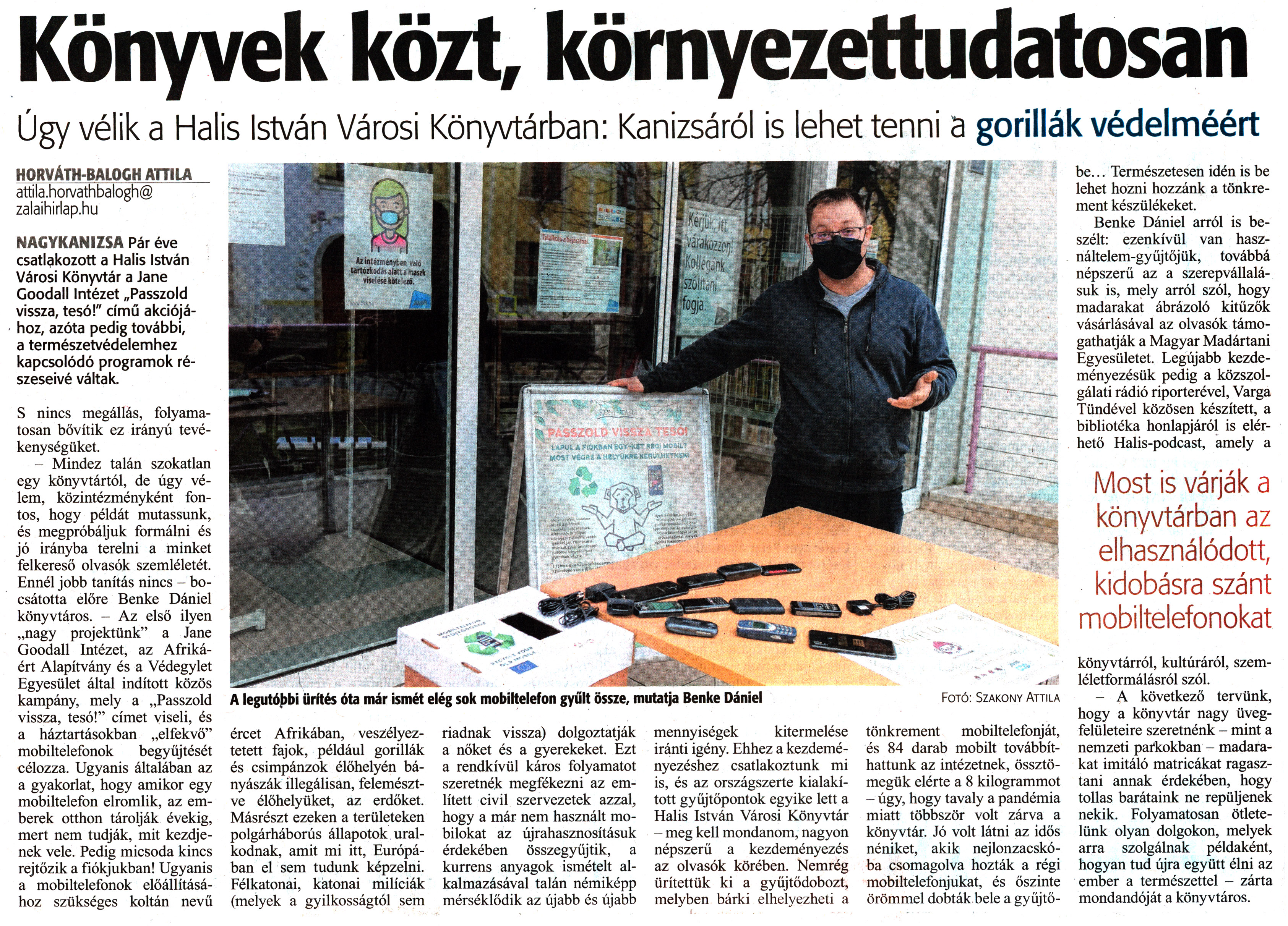 Nyilvános 1427 | 1905 | Zalai Hírlap 2021. február 8. 32. szám 4. oldal | Könyvek közt, környezettudatosan NAGYKANIZSA Pár éve csatlakozott a Halis István Városi Könyvtár a Jane Goodall Intézet „Passzold vissza, tesó!" című akciójához, azóta pedig további, a természetvédelemhez kapcsolódó programok részeseivé váltak. S nincs megállás, folyamatosan bővítik ez irányú tevékenységüket. - Mindez talán szokatlan egy könyvtártól, de úgy vélem, közintézményként fontos, hogy példát mutassunk, és megpróbáljuk formálni és jó irányba terelni a minket felkereső olvasók szemléletét. Ennél jobb tanítás nincs - bocsátotta előre Benke Dániel könyvtáros. - Az első ilyen „nagy projektünk" a Jane Goodall Intézet, az Afrikáért Alapítvány és a Védegylet Egyesület által indított közös kampány, mely a „Passzold vissza, tesó!" címet viseli, és a háztartásokban „elfekvő" mobiltelefonok begyűjtését célozza. Ugyanis általában az a gyakorlat, hogy amikor egy mobiltelefon elromlik, az emberek otthon tárolják évekig, mert nem tudják, mit kezdjenek vele. Pedig micsoda kincs rejtőzik a fiókjukban! Ugyanis a mobiltelefonok előállításához szükséges koltán nevű ércet Afrikában, veszélyeztetett fajok, például gorillák és csimpánzok élőhelyén bányásszák illegálisan, felemésztve élőhelyüket, az erdőket. Másrészt ezeken a területeken polgárháborús állapotok uralkodnak, amit mi itt, Európában el sem tudunk képzelni. Félkatonai, katonai milíciák (melyek a gyilkosságtól sem riadnak vissza) dolgoztatják a nőket és a gyerekeket. Ezt a rendkívül káros folyamatot szeretnék megfékezni az említett civil szervezetek azzal, hogy a már nem használt mobilokat az újrahasznosításuk érdekében összegyűjtik, a kurrens anyagok ismételt alkalmazásával talán némiképp mérséklődik az újabb és újabb mennyiségek kitermelése iránti igény. Ehhez a kezdeményezéshez csatlakoztunk mi is, és az országszerte kialakított gyűjtőpontok egyike lett a Halis István Városi Könyvtár - meg kell mondanom, nagyon népszerű a kezdeményezés az olvasók körében. Nemrég ürítettük ki a gyüjtődobozt, melyben bárki elhelyezheti a tönkrement mobiltelefonját, és 84 darab mobilt továbbíthattunk az intézetnek, össztömegük elérte a 8 kilogrammot - úgy, hogy tavaly a pandémia miatt többször volt zárva a könyvtár. Jó volt látni az idős néniket, akik nejlonzacskóba csomagolva hozták a régi mobiltelefonjukat, és őszinte örömmel dobták bele a gyűjtőbe... Természetesen idén is be lehet hozni hozzánk a tönkrement készülékeket. Benke Dániel arról is beszélt: ezenkívül van használtelem-gyüjtőjük, továbbá népszerű az a szerepvállalásuk is, mely arról szól, hogy madarakat ábrázoló kitűzők vásárlásával az olvasók támogathatják a Magyar Madártani Egyesületet. Legújabb kezdeményezésük pedig a közszolgálati rádió riporterével, Varga Tündével közösen készített, a bibliotéka honlapjáról is elérhető Halis-podcast, amely a könyvtárról, kultúráról, szemléletformálásról szól. - A következő tervünk, hogy a könyvtár nagy üvegfelületeire szeretnénk - mint a nemzeti parkokban - madarakat imitáló matricákat ragasztani annak érdekében, hogy tollas barátaink ne repüljenek nekik. Folyamatosan ötletelünk olyan dolgokon, melyek arra szolgálnak példaként, hogyan tud újra együtt élni az ember a természettel - zárta mondandóját a könyvtáros. HORVÁTH-BALOGH ATTILA attila.horvathbalogh@ zalaihirlap.hu |
