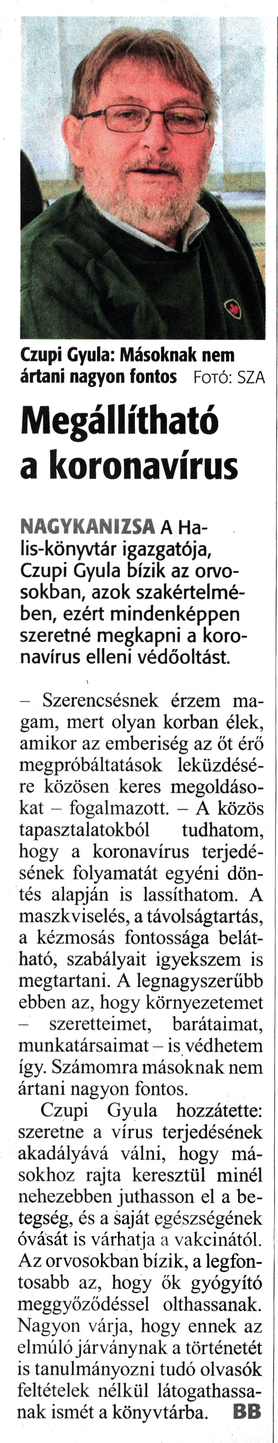Nyilvános 1924 | 1787 | Zalai Hírlap 2021. február 5. 30. szám 3. oldal | Czupi Gyula: Másoknak nem ártani nagyon fontos Fotó: SZA Megállítható a koronavírus NAGYKANIZSA A Halis-könyvtár igazgatója, Czupi Gyula bízik az orvosokban, azok szakértelmében, ezért mindenképpen szeretné megkapni a koronavírus elleni védőoltást. - Szerencsésnek érzem magam, mert olyan korban élek, amikor az emberiség az őt érő megpróbáltatások leküzdésére közösen keres megoldásokat - fogalmazott. - A közös tapasztalatokból tudhatom, hogy a koronavírus terjedésének folyamatát egyéni döntés alapján is lassíthatom. A maszkviselés, a távolságtartás, a kézmosás fontossága belátható, szabályait igyekszem is megtartani. A legnagyszerűbb ebben az, hogy környezetemet - szeretteimet, barátaimat, munkatársaimat - is védhetem így. Számomra másoknak nem ártani nagyon fontos. Czupi Gyula hozzátette: szeretne a vírus terjedésének akadályává válni, hogy másokhoz rajta keresztül minél nehezebben juthasson el a betegség, és a saját egészségének óvását is várhatja a vakcinától. Az orvosokban bízik, a legfontosabb az, hogy ők gyógyító meggyőződéssel olthassanak. Nagyon várja, hogy ennek az elmúló járványnak a történetét is tanulmányozni tudó olvasók feltételek nélkül látogathassanak ismét a könyvtárba. BB |