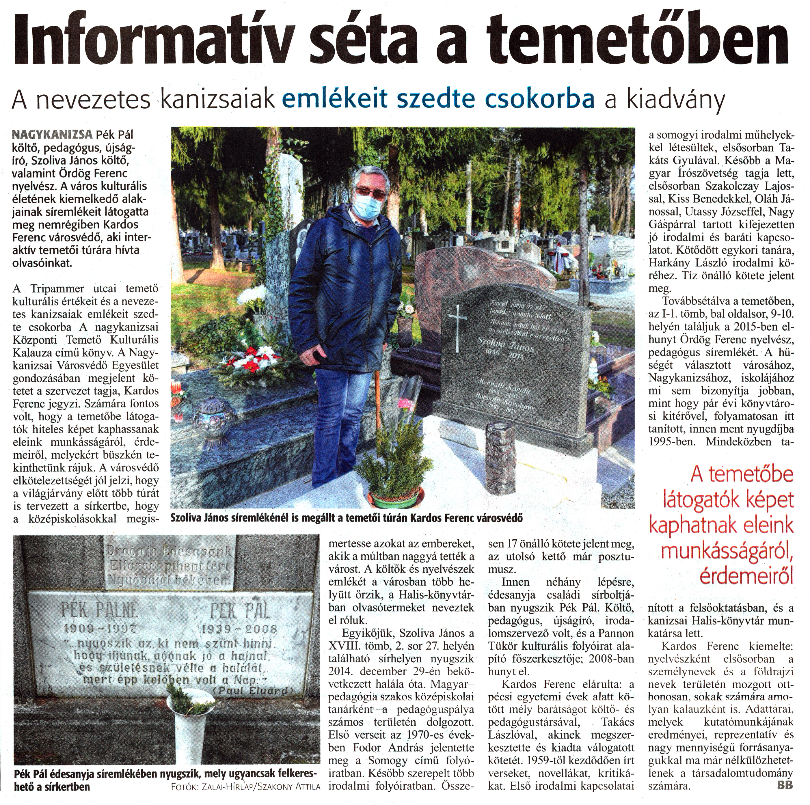 Nyilvános 1325 | 1658 | Zalai Hírlap 2021. április 7. 79. szám 10. oldal | Informatív séta a temetőben A nevezetes kanizsaiak emlékeit szedte csokorba a kiadvány NAGYKANIZSA Pék Pál költő, pedagógus, újságíró, Szoliva János költő, valamint Ördög Ferenc nyelvész. A város kulturális életének kiemelkedő alakjainak síremlékeit látogatta meg nemrégiben Kardos Ferenc városvédő, aki interaktív temetői túrára hívta olvasóinkat. A Tripammer utcai temető kulturális értékeit és a nevezetes kanizsaiak emlékeit szedte csokorba A nagykanizsai Központi Temető Kulturális Kalauza című könyv. A Nagykanizsai Városvédő Egyesület gondozásában megjelent kötetet a szervezet tagja, Kardos Ferenc jegyzi. Számára fontos volt, hogy a temetőbe látogatók hiteles képet kaphassanak eleink munkásságáról, érdemeiről, melyekért büszkén tekinthetünk rájuk. A városvédő elkötelezettségét jól jelzi, hogy a világjárvány előtt több túrát is tervezett a sírkertbe, hogy a középiskolásokkal megismertesse azokat az embereket, akik a múltban naggyá tették a várost. A költők és nyelvészek emlékét a városban több helyütt őrzik, a Halis-könyvtárban olvasótermeket neveztek el róluk. Egyikőjük, Szoliva János a XVIII. tömb, 2. sor 27. helyén található sírhelyen nyugszik 2014. december 29-én bekövetkezett halála óta. Magyarpedagógia szakos középiskolai tanárként a pedagóguspálya számos területén dolgozott. Első verseit az 1970-es években Fodor András jelentette meg a Somogy című folyóiratban. Később szerepelt több irodalmi folyóiratban. Összesen 17 önálló kötete jelent meg, az utolsó kettő már posztumusz. Innen néhány lépésre, édesanyja családi sírboltjában nyugszik Pék Pál. Költő, pedagógus, újságíró, irodalomszervező volt, és a Pannon Tükör kulturális folyóirat alapító főszerkesztője; 2008-ban hunyt el. Kardos Ferenc elárulta: a pécsi egyetemi évek alatt kötött mély barátságot költő- és pedagógustársával, Takács Lászlóval, akinek megszerkesztette és kiadta válogatott kötetét. 1959-től kezdődően írt verseket, novellákat, kritikákat. Első irodalmi kapcsolatai a somogyi irodalmi műhelyekkel létesültek, elsősorban Ta-káts Gyulával. Később a Magyar írószövetség tagja lett, elsősorban Szakolczay Lajossal, Kiss Benedekkel, Oláh Jánossal, Utassy Józseffel, Nagy Gáspárral tartott kifejezetten jó irodalmi és baráti kapcsolatot. Kötődött egykori tanára, Harkány László irodalmi köréhez. Tíz önálló kötete jelent meg. Továbbsétálva a temetőben, az 1-1. tömb, bal oldalsor, 9-10. helyén találjuk a 2015-ben elhunyt Ördög Ferenc nyelvész, pedagógus síremlékét. A hűségét választott városához, Nagykanizsához, iskolájához mi sem bizonyítja jobban, mint hogy pár évi könyvtárosi kitérővel, folyamatosan itt tanított, innen ment nyugdíjba 1995-ben. Mindeközben tanított a felsőoktatásban, és a kanizsai Halis-könyvtár munkatársa lett. Kardos Ferenc kiemelte: nyelvészként elsősorban a személynevek és a földrajzi nevek területén mozgott otthonosan, sokak számára amolyan kalauzként is. Adattárai, melyek kutatómunkájának eredményei, reprezentatív és nagy mennyiségű forrásanyagukkal ma már nélkülözhetetlenek a társadalomtudomány számára. BB Szoliva János síremlékénél is megállt a temetői túrán Kardos Ferenc városvédő Pék Pál édesanyja síremlékében nyugszik, mely ugyancsak felkereshető a sírkertben Fotók: Zalai-Hírl''ap/Szakony Attila |