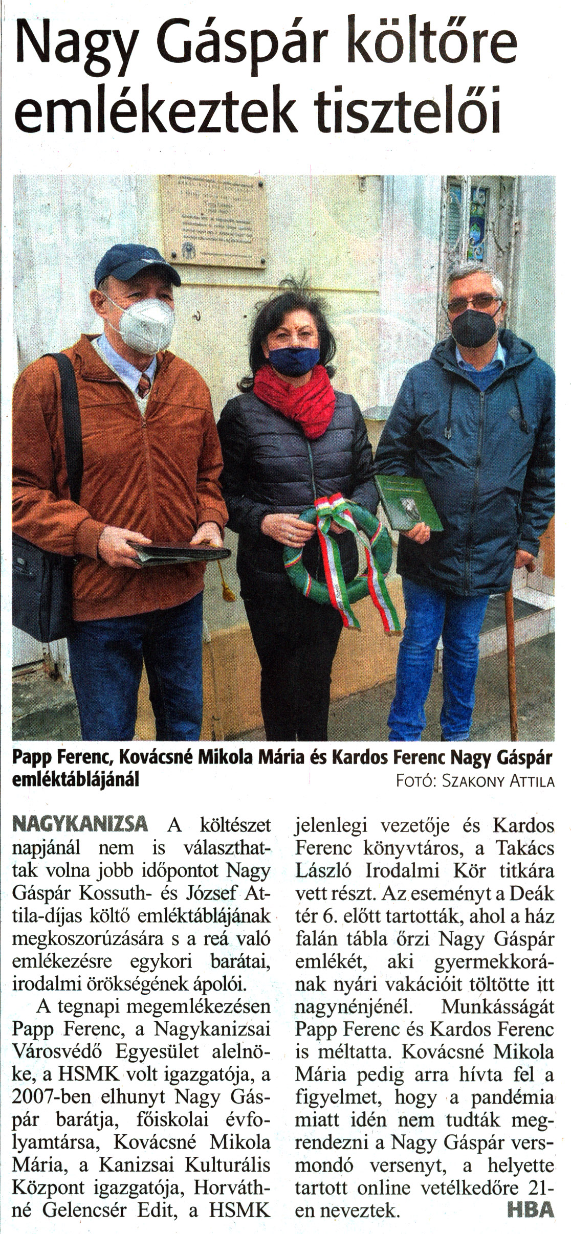 Nyilvános 1421 | 1855 | Zalai Hírlap 2021. április 12. 83. szám 3. oldal | Nagy Gáspár költőre emlékeztek tisztelői Papp Ferenc, Kovácsné Mikola Mária és Kardos Ferenc Nagy Gáspár emléktáblájánál Fotó: Szakony Attila NAGYKANIZSA A költészet napjánál nem is választhattak volna jobb időpontot Nagy Gáspár Kossuth- és József Attila-díjas költő emléktáblájának megkoszorúzására s a reá való emlékezésre egykori barátai, irodalmi örökségének ápolói. A tegnapi megemlékezésen Papp Ferenc, a Nagykanizsai Városvédő Egyesület alelnöke, a HSMK volt igazgatója, a 2007-ben elhunyt Nagy Gáspár barátja, főiskolai évfolyamtársa, Kovácsné Mikola Mária, a Kanizsai Kulturális Központ igazgatója, Horváthné Gelencsér Edit, a HSMK jelenlegi vezetője és Kardos Ferenc könyvtáros, a Takács László Irodalmi Kör titkára vett részt. Az eseményt a Deák tér 6. előtt tartották, ahol a ház falán tábla őrzi Nagy Gáspár emlékét, aki gyermekkorának nyári vakációit töltötte itt nagynénjénél. Munkásságát Papp Ferenc és Kardos Ferenc is méltatta. Kovácsné Mikola Mária pedig arra hívta fel a figyelmet, hogy a pandémia miatt idén nem tudták megrendezni a Nagy Gáspár versmondó versenyt, a helyette tartott online vetélkedőre 21-en neveztek. HBA |