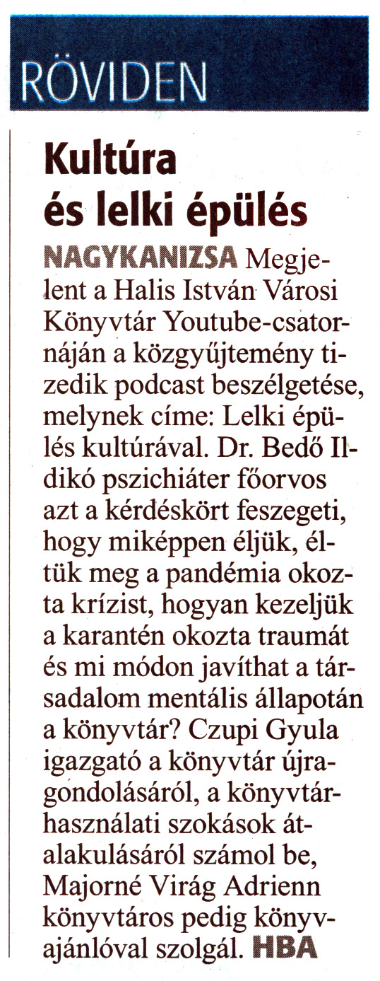 Nyilvános 1305 | 1917 | Zalai Hírlap 2021. június 1. 124. szám 3. oldal | RÖVIDEN Kultúra és lelki épülés NAGYKANIZSA Megjelent a Halis István Városi Könyvtár Youtube-csatornáján a közgyűjtemény tizedik podcast beszélgetése, melynek címe: Lelki épülés kultúrával. Dr. Bedő Ildikó pszichiáter főorvos azt a kérdéskört feszegeti, hogy miképpen éljük, éltük meg a pandémia okozta krízist, hogyan kezeljük a karantén okozta traumát és mi módon javíthat a társadalom mentális állapotán a könyvtár? Czupi Gyula igazgató a könyvtár újragondolásáról, a könyvtárhasználati szokások átalakulásáról számol be, Majomé Virág Adrienn könyvtáros pedig könyvajánlóval szolgál. HBA |