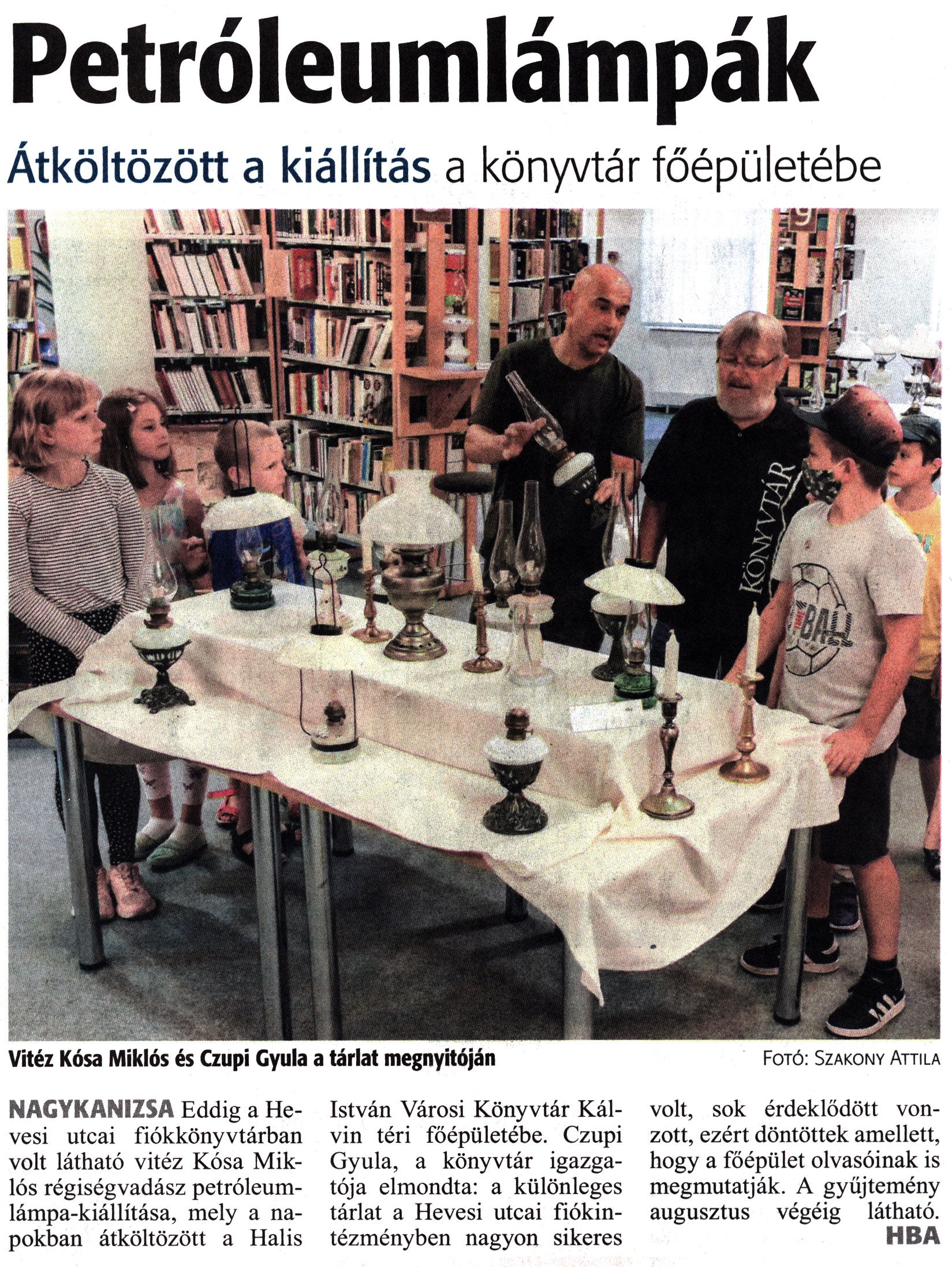 Nyilvános 1378 | 1874 | Zalai Hírlap 2021. július 7. 155. szám 16. oldal | Petróleumlámpák Átköltözött a kiállítás a könyvtár főépületébe Vitéz Kósa Miklós és Czupi Gyula a tárlat megnyitóján Fotó: Szakony Attila NAGYKANIZSA Eddig a Hevesi utcai fiókkönyvtárban volt látható vitéz Kósa Miklós régiségvadász petróleumlámpa-kiállítása, mely a napokban átköltözött a Halis István Városi Könyvtár Kálvin téri főépületébe. Czupi Gyula, a könyvtár igazgatója elmondta: a különleges tárlat a Hevesi utcai fiókintézményben nagyon sikeres volt, sok érdeklődött vonzott, ezért döntöttek amellett, hogy a főépület olvasóinak is megmutatják. A gyűjtemény augusztus végéig látható. HBA |