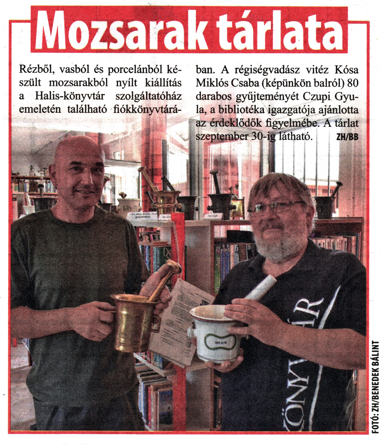 Nyilvános 1805 | 2890 | Rövid leírás | Teljes leírás (472 B) | City7 2021. augusztus 20. 22. szám 20. oldal Mozsarak tárlata Rézből, vasból és porcelánból készült mozsarakból nyílt kiállítás a Halis-könyvtár szolgáltatóház emeletén található fiókkönyvtárában. A régiségvadász vitéz Kósa Miklós Csaba (képünkön balról) 80 darabos gyűjteményét Czupi Gyula, a bibliotéka igazgatója ajánlotta az érdeklődők figyelmébe. A tárlat szeptember 30-ig látható. ZH/BB |