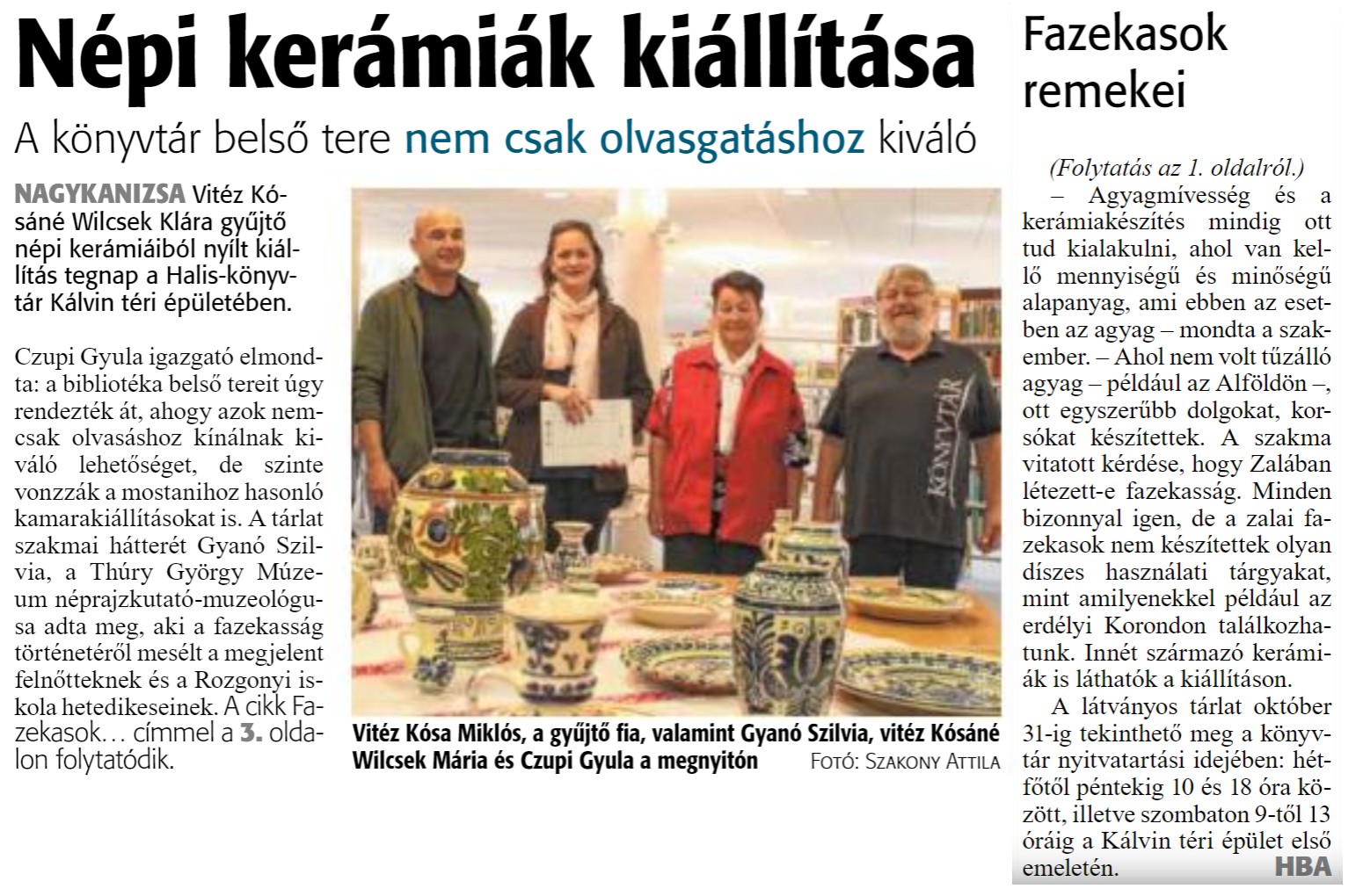 Nyilvános 1306 | 1635 | Népi kerámiák kiállítása | A könyvtár belső tere nem csak olvasgatáshoz kiváló NAGYKANIZSA Vitéz Kósáné Wilcsek Klára gyűjtő népi kerámiáiból nyílt kiállítás tegnap a Halis-könyvtár Kálvin téri épületében. Czupi Gyula igazgató elmondta: a bibliotéka belső tereit úgy rendezték át, ahogy azok nemcsak olvasáshoz kínálnak kiváló lehetőséget, de szinte vonzzák a mostanihoz hasonló kamarakiállításokat is. A tárlat szakmai hátterét Gyanó Szilvia, a Thúry György Múzeum néprajzkutató -muzeológusa adta meg, aki a fazekasság történetérő mesélt a megjelent felnőtteknek és a Rozgonyi iskola hetedikeseinek. A cikk Fazekasok. .. címmel a 3. oldalon folytatódik. Vitéz Kosa Miklós, a gyűjtő fia, valamint Gyanó Szilvia, vitéz Kósáné Wilcsek Mária és Czupi Gyula a megnyitón FOTÓ: SZAKONY ATTILA Fazekasok remekei (Folytatás az 1. oldalról.) - Agyagmíves ség és a kerámiakészítés mindig ott tud kialakulni, ahol van kellő mennyiségű és minőségű alapanyag, ami ebben az esetben az agyag - mondta a szakember. - Ahol nem volt tűzálló agyag - például az Alföldön ott egyszerűbb dolgokat, korsókat készítettek. A szakma vitatott kérdése, hogy Zalában létezett-e fazekasság. Minden bizonnyal igen, de a zalai fazekasok nem készítettek olyan díszes használati tárgyakat, mint amilyenekkel például az erdélyi Korondon találkozhatunk. Innét származó kerámiák is láthatók a kiállításon. A látványos tárlat október 31-ig tekinthető meg a könyvtár nyitvatartási idejében: hétfőtől péntekig 10 és 18 óra között, illetve szombaton 9-től 13 óráig a Kálvin téri épület első emeletén. HBA |