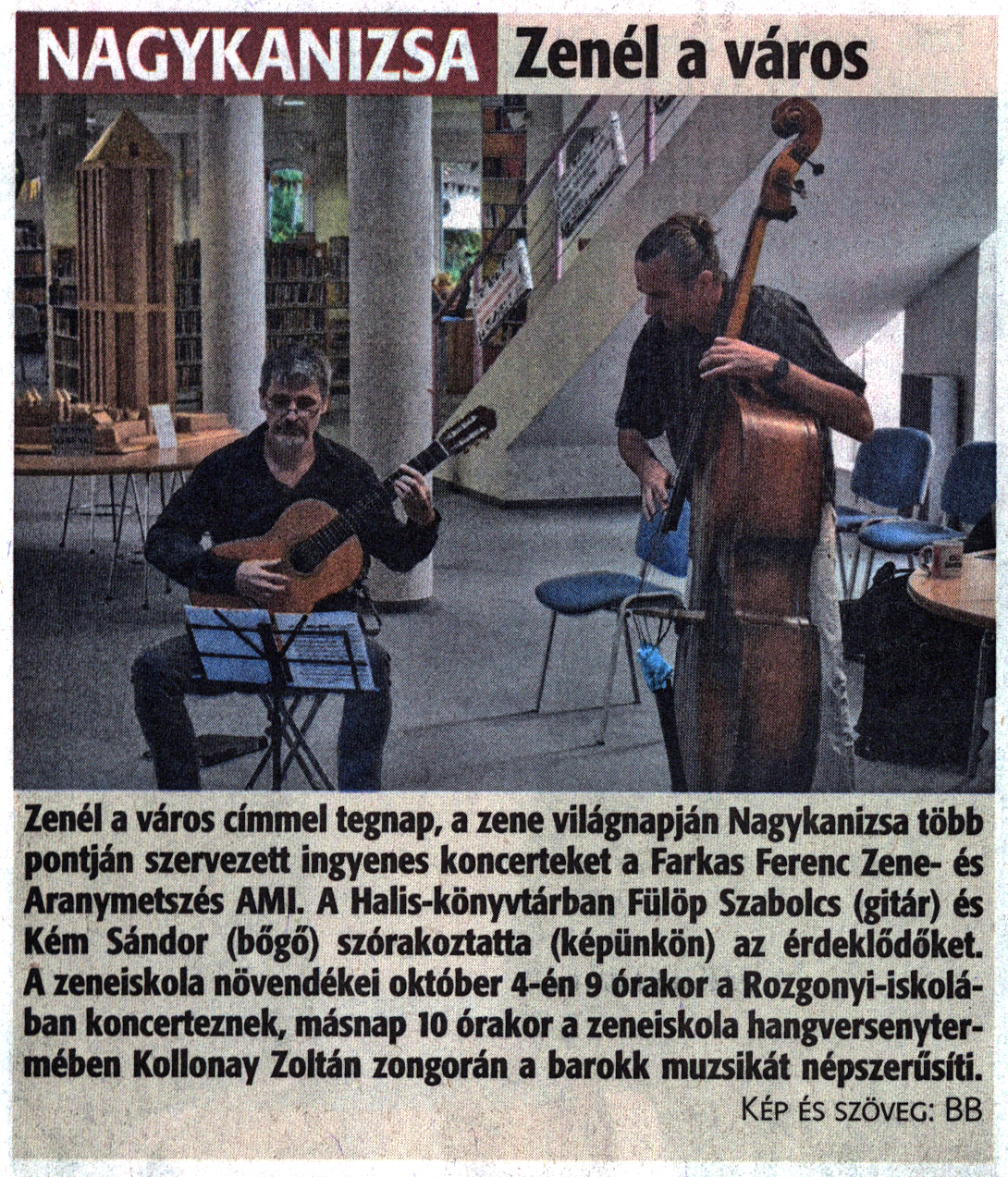 Nyilvános 1391 | 1986 | Zalai Hírlap 2021. október 2. 229. szám 16. oldal | Nagykanizsa - Zenél a város Zenél a város címmel tegnap, a zene világnapján Nagykanizsa több pontján szervezett ingyenes koncerteket a Farkas Ferenc Zene- és Aranymetszés AMI. A Halis-könyvtárban Fülöp Szabolcs (gitár) és Kém Sándor (bőgő) szórakoztatta (képünkön) az érdeklődőket. A zeneiskola növendékei október 4-én 9 órakor a Rozgonyi-iskolában koncerteznek, másnap 10 órakor a zeneiskola hangversenytermében Kollonay Zoltán zongorán a barokk muzsikát népszerűsíti. Kép és szöveg: BB |