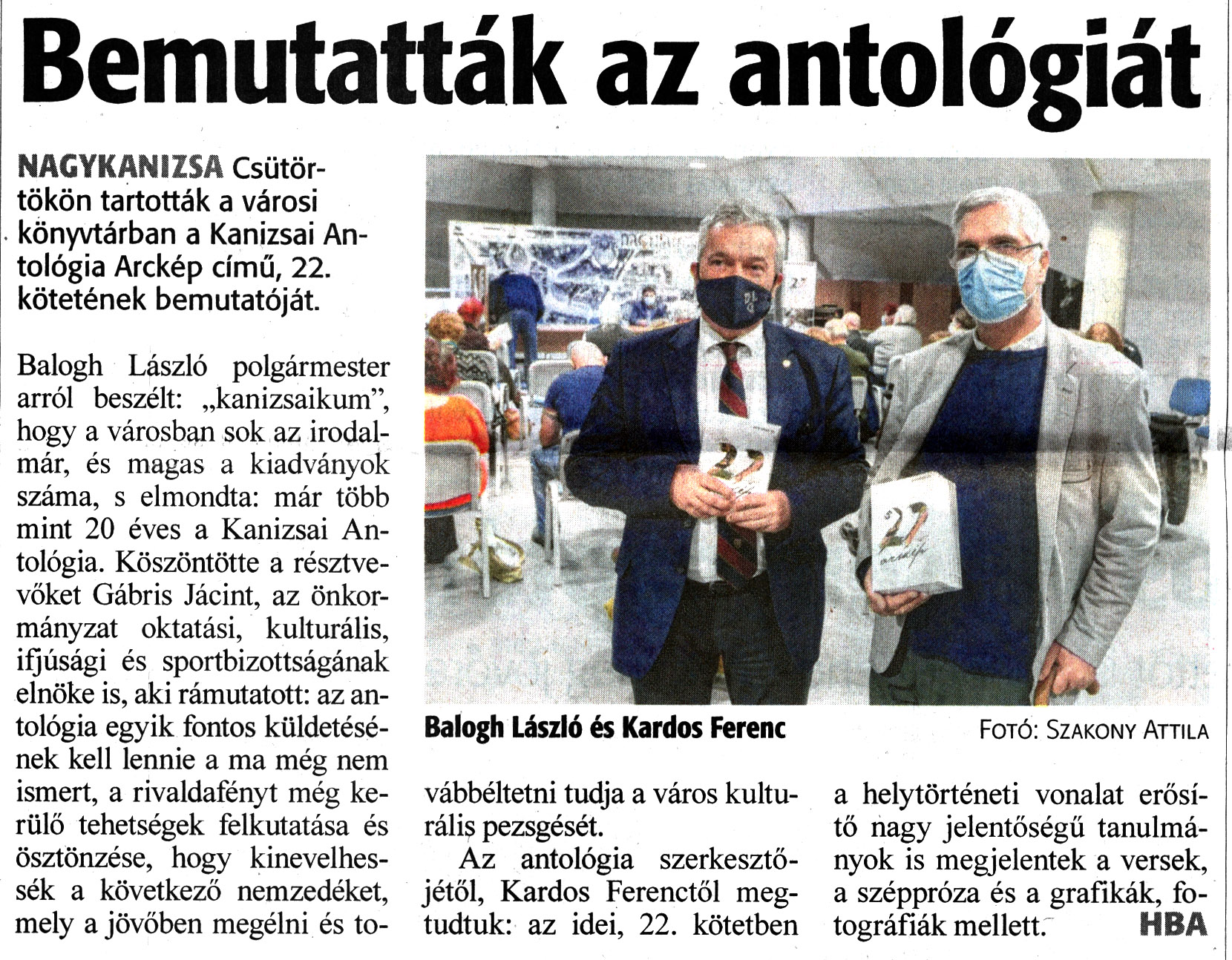 Nyilvános 1293 | 1845 | Zalai Hírlap 2021. december 11. 287. szám 16. oldal | Bemutatták az antológiát NAGYKANIZSA Csütörtökön tartották a városi könyvtárban a Kanizsai Antológia Arckép című, 22. kötetének bemutatóját. Balogh László polgármester arról beszélt: „kanizsaikum", hogy a városban sok az irodalmár, és magas a kiadványok száma, s elmondta: már több mint 20 éves a Kanizsai Antológia. Köszöntötte a résztvevőket Gábris Jácint, az önkormányzat oktatási, kulturális, ifjúsági és sportbizottságának elnöke is, aki rámutatott: az antológia egyik fontos küldetésének kell lennie a ma még nem ismert, a rivaldafényt még kerülő tehetségek felkutatása és ösztönzése, hogy kinevelhessék a következő nemzedéket, mely a jövőben megélni és továbbéltetni tudja a város kulturális pezsgését. Az antológia szerkesztőjétől, Kardos Ferenctől megtudtuk: az idei, 22. kötetben a helytörténeti vonalat erősítő nagy jelentőségű tanulmányok is megjelentek a versek, a széppróza és a grafikák, fotográfiák mellett. HBA Balogh László és Kardos Ferenc Fotó: Szakony Attila |