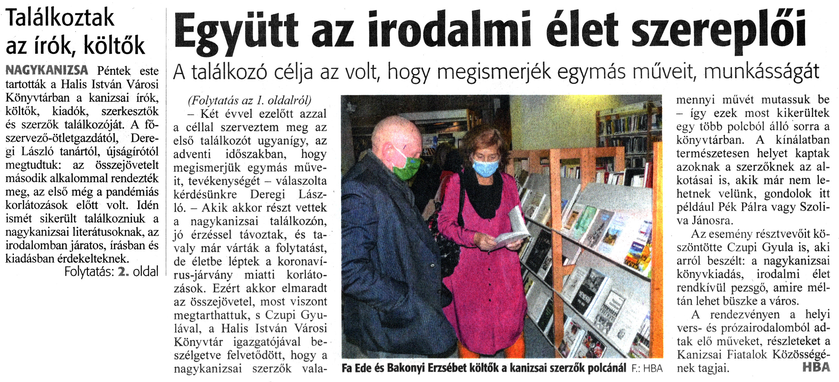 Nyilvános 1136 | 1658 | Zalai Hírlap 2021. december 13. 288. szám 1, 2. oldal | Találkoztak az írók, költők NAGYKANIZSA Péntek este tartották a Halis István Városi Könyvtárban a kanizsai írók, költők, kiadók, szerkesztők és szerzők találkozóját. A főszervező-ötletgazdától, Deregi László tanártól, újságírótól megtudtuk: az összejövetelt második alkalommal rendezték meg, az első még a pandémiás korlátozások előtt volt. Idén ismét sikerült találkozniuk a nagykanizsai literátusoknak, az irodalomban járatos, írásban és kiadásban érdekelteknek. Folytatás: 2. oldal Együtt az irodalmi élet szereplői A találkozó célja az volt, hogy megismerjék egymás műveit, munkásságát (Folytatás az 1. oldalról) - Két évvel ezelőtt azzal a céllal szerveztem meg az első találkozót ugyanígy, az adventi időszakban, hogy megismerjük egymás müveit, tevékenységét - válaszolta kérdésünkre Deregi László. - Akik akkor részt vettek a nagykanizsai találkozón, jó érzéssel távoztak, és tavaly már várták a folytatást, de életbe léptek a koronavírus-járvány miatti korlátozások. Ezért akkor elmaradt az összejövetel, most viszont megtarthattuk, s Czupi Gyulával, a Halis István Városi Könyvtár igazgatójával beszélgetve felvetődött, hogy a nagykanizsai szerzők valamennyi müvét mutassuk be - így ezek most kikerültek egy több polcból álló sorra a könyvtárban. A kínálatban természetesen helyet kaptak azoknak a szerzőknek az alkotásai is, akik már nem lehetnek velünk, gondolok itt például Pék Pálra vagy Szoliva Jánosra. Az esemény résztvevőit köszöntötte Czupi Gyula is, aki arról beszélt: a nagykanizsai könyvkiadás, irodalmi élet rendkívül pezsgő, amire méltán lehet büszke a város. A rendezvényen a helyi vers- és prózairodalomból adtak elő műveket, részleteket a Kanizsai Fiatalok Közösségének tagjai. HBA Fa Ede és Bakonyi Erzsébet költők a kanizsai szerzők polcánál F : HBA |