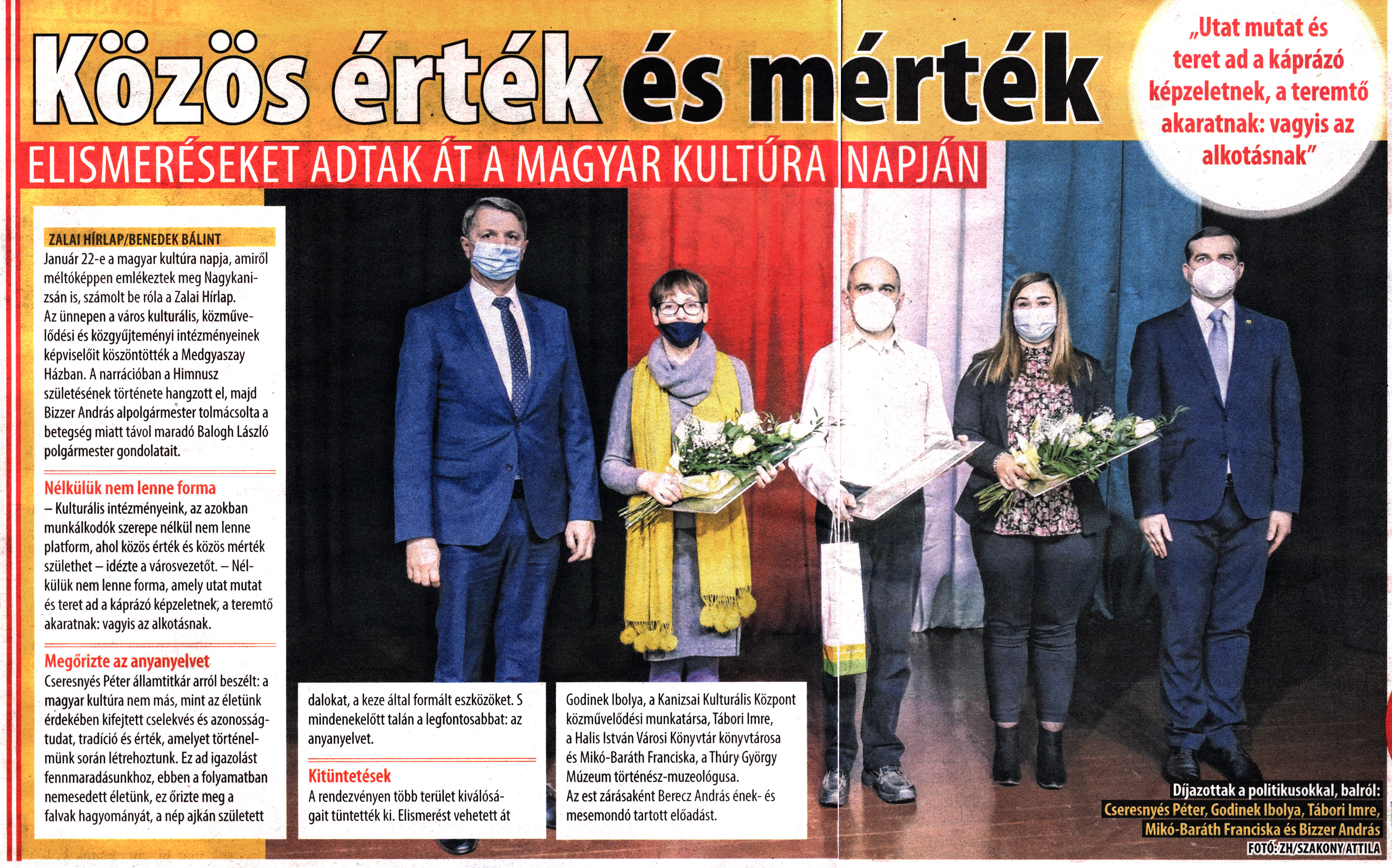 Nyilvános 1798 | 2761 | Rövid leírás | Teljes leírás (2.13 KB) | City7 magazin 2022. január 28. 4. szám 6-7. oldal Közös érték és mérték - Elismeréseket adtak át a magyar kultúra napján „Utat mutat és teret ad a káprázó képzeletnek, a teremtő akaratnak: vagyis az alkotásnak" ZALAI HÍRLAP/BENEDEK BÁLINT Január 22-e a magyar kultúra napja, amiről méltóképpen emlékeztek meg Nagykanizsán is, számolt be róla a Zalai Hírlap. Az ünnepen a város kulturális, közművelődési és közgyűjteményi intézményeinek képviselőit köszöntötték a Medgyaszay Házban. A narrációban a Himnusz születésének története hangzott el, majd Bizzer András alpolgármester tolmácsolta a betegség miatt távol maradó Balogh László polgármester gondolatait. Nélkülük nem lenne forma - Kulturális intézményeink, az azokban munkálkodók szerepe nélkül nem lenne platform, ahol közös érték és közös mérték születhet - idézte a városvezetőt. - Nélkülük nem lenne forma, amely utat mutat és teret ad a káprázó képzeletnek, a teremtő akaratnak: vagyis az alkotásnak. Megőrizte az anyanyelvet Cseresnyés Péter államtitkár arról beszélt: a magyar kultúra nem más, mint az életünk érdekében kifejtett cselekvés és azonosságtudat, tradíció és érték, amelyet történelmünk során létrehoztunk. Ez ad igazolást fennmaradásunkhoz, ebben a folyamatban nemesedett életünk, ez őrizte meg a falvak hagyományát, a nép ajkán született dalokat, a keze által formált eszközöket. S mindenekelőtt talán a legfontosabbat: az anyanyelvet. Kitüntetések A rendezvényen több terület kiválóságait tüntették ki. Elismerést vehetett át Gödinek Ibolya, a Kanizsai Kulturális Központ közművelődési munkatársa, Tábori Imre, a Halis István Városi Könyvtár könyvtárosa és Mikó-Baráth Franciska, a Thúry György Múzeum történész-muzeológusa. Az est zárásaként Berecz András ének- és mesemondó tartott előadást. Díjazottak a politikusokkal, balról: Cseresnyés Péter, Gödinek Ibolya, Tábori Imre, Mikó-Baráth Franciska és Bizzer András |