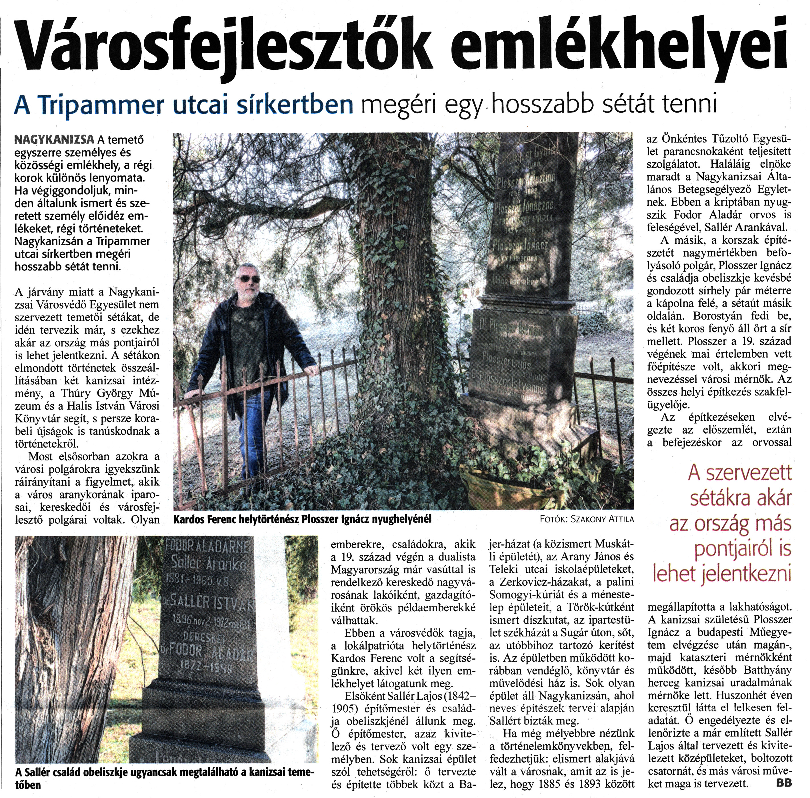Nyilvános 1293 | 1708 | Zalai Hírlap 2022. február 16. 39. szám 10. oldal | Városfejlesztők emlékhelyei A Tripammer utcai sírkertben megéri egy hosszabb sétát tenni NAGYKANIZSA A temető egyszerre személyes és közösségi emlékhely, a régi korok különös lenyomata. Ha végiggondoljuk, minden általunk ismert és szeretett személy előidéz emlékeket, régi történeteket. Nagykanizsán a Tripammer utcai sírkertben megéri hosszabb sétát tenni. A járvány miatt a Nagykanizsai Városvédő Egyesület nem szervezett temetői sétákat, de idén tervezik már, s ezekhez akár az ország más pontjairól is lehet jelentkezni. A sétákon elmondott történetek összeállításában két kanizsai intézmény, a Thúry György Múzeum és a Halis István Városi Könyvtár segít, s persze korabeli újságok is tanúskodnak a történetekről. Most elsősorban azokra a városi polgárokra igyekszünk ráirányítani a figyelmet, akik a város aranykorának iparosai, kereskedői és városfejlesztő polgárai voltak. Olyan emberekre, családokra, akik a 19. század végén a dualista Magyarország már vasúttal is rendelkező kereskedő nagyvárosának lakóiként, gazdagító-iként örökös példaemberekké válhattak. Ebben a városvédők tagja, a lokálpatrióta helytörténész Kardos Ferenc volt a segítségünkre, akivel két ilyen emlékhelyet látogatunk meg. Elsőként Sallér Lajos (1842-1905) építőmester és családja obeliszkjénél állunk meg. Ő építőmester, azaz kivitelező és tervező volt egy személyben. Sok kanizsai épület szól tehetségéről: ő tervezte és építette többek közt a Bajer-házat (a közismert Muskátli épületét), az Arany János és Teleki utcai iskolaépületeket, a Zerkovicz-házakat, a palini Somogyi-kúriát és a ménestelep épületeit, a Török-kútként ismert díszkutat, az ipartestület székházát a Sugár úton, sőt, az utóbbihoz tartozó kerítést is. Az épületben működött korábban vendéglő, könyvtár és művelődési ház is. Sok olyan épület áll Nagykanizsán, ahol neves építészek tervei alapján Sallért bízták meg. Ha még mélyebbre nézünk a történelemkönyvekben, felfedezhetjük: elismert alakjává vált a városnak, amit az is jelez, hogy 1885 és 1893 között az Önkéntes Tűzoltó Egyesület parancsnokaként teljesített szolgálatot. Haláláig elnöke maradt a Nagykanizsai Általános Betegsegélyező Egyletnek. Ebben a kriptában nyugszik Fodor Aladár orvos is feleségével, Sallér Arankával. A másik, a korszak építészetét nagymértékben befolyásoló polgár, Plosszer Ignácz és családja obeliszkje kevésbé gondozott sírhely pár méterre a kápolna felé, a sétaút másik oldalán. Borostyán fedi be, és két koros fenyő áll őrt a sír mellett. Plosszer a 19. század végének mai értelemben vett főépítésze volt, akkori megnevezéssel városi mérnök. Az összes helyi építkezés szakfelügyelője. Az építkezéseken elvégezte az előszemlét, eztán a befejezéskor az orvossal megállapította a lakhatóságot. A kanizsai születésű Plosszer Ignácz a budapesti Műegyetem elvégzése után magán-, majd kataszteri mérnökként működött, később Batthyány herceg kanizsai uradalmának mérnöke lett. Huszonhét éven keresztül látta el lelkesen feladatát. Ő engedélyezte és ellenőrizte a már említett Sallér Lajos által tervezett és kivitelezett középületeket, boltozott csatornát, és más városi műveket maga is tervezett. BB A Sallér család obeliszkje ugyancsak megtalálható a kanizsai temetőben Kardos Ferenc helytörténész Plosszer Ignácz nyughelyénél Fotók: Szakony Attila |