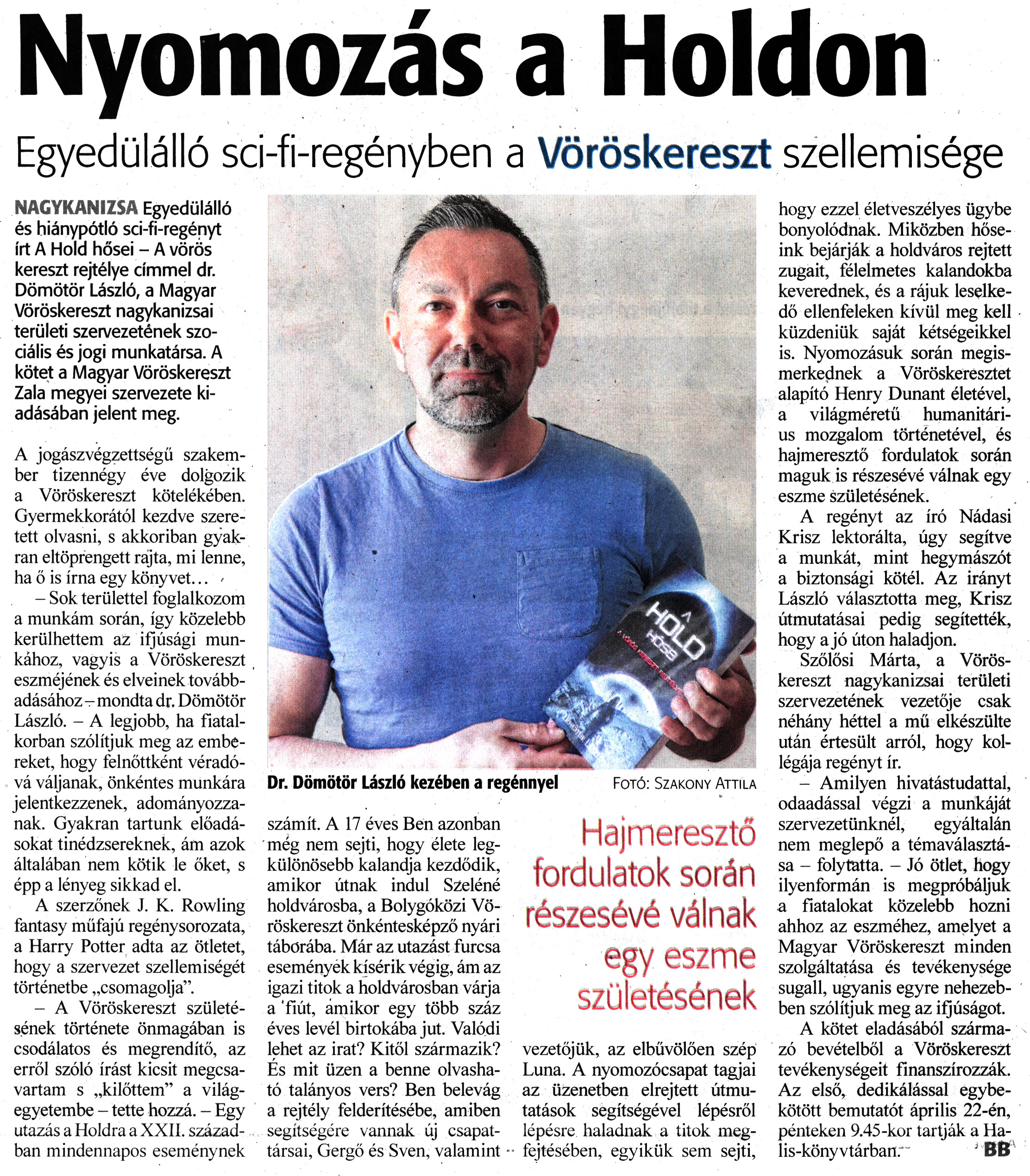 Nyilvános 1252 | 1484 | Zalai Hírlap 2022. április 21. 91. szám 11. oldal | Nyomozás a Holdon Egyedülálló sci-fi-regényben a Vöröskereszt szellemisége NAGYKANIZSA Egyedülálló és hiánypótló sci-fi-regényt írt A Hold hősei - A vörös kereszt rejtélye címmel dr. Dömötör László, a Magyar Vöröskereszt nagykanizsai területi szervezetének szociális és jogi munkatársa. A kötet a Magyar Vöröskereszt Zala megyei szervezete kiadásában jelent meg. A jogászvégzettségű szakember tizennégy éve dolgozik a Vöröskereszt kötelékében. Gyermekkorától kezdve szeretett olvasni, s akkoriban gyakran eltöprengett rajta, mi lenne, ha ő is írna egy könyvet... - - Sok területtel foglalkozom a munkám során, így közelebb kerülhettem az iijúsági munkához, vagyis a Vöröskereszt eszméjének és elveinek továbbadásához - mondta dr. Dömötör László. - A legjobb, ha fiatalkorban szólítjuk meg az embereket, hogy felnőttként véradóvá váljanak, önkéntes munkára jelentkezzenek, adományozzanak. Gyakran tartunk előadásokat tinédzsereknek, ám azok általában nem kötik le őket, s épp a lényeg sikkad el. A szerzőnek J. K. Rowling fantasy műfajú regény sorozata, a Harry Potter adta az ötletet, hogy a szervezet szellemiségét történetbe „csomagolja". - A Vöröskereszt születésének története önmagában is csodálatos és megrendítő, az erről szóló írást kicsit megcsavartam s „kilőttem" a világegyetembe - tette hozzá. - Egy utazás a Holdra a XXII. században mindennapos eseménynek számít. A 17 éves Ben azonban még nem sejti, hogy élete legkülönösebb kalandja kezdődik, amikor útnak indul Szeléné holdvárosba, a Bolygóközi Vöröskereszt önkéntesképző nyári táborába. Már az utazást furcsa események kísérik végig, ám az igazi titok a holdvárosban várja a ''fiút, ámikor egy több száz éves levél birtokába jut. Valódi lehet az irat? Kitől származik? És mit üzen a benne olvasható talányos vers? Ben belevág a rejtély felderítésébe, amiben segítségére vannak új csapattársai, Gergő és Sven, valamint vezetőjük, az elbűvölően szép Luna. A nyomozócsapat tagjai az üzenetben elrejtett útmutatások segítségével lépésről lépésre haladnak a titok megfejtésében, egyikük sem sejti, hogy ezzel életveszélyes ügybe bonyolódnak. Miközben hőseink bejárják a holdváros rejtett zugait, félelmetes kalandokba keverednek, és a rájuk leselkedő ellenfeleken kívül meg kell küzdeniük saját kétségeikkel is. Nyomozásuk során megismerkednek a Vöröskeresztet alapító Henry Dunant életével, a világméretű humanitárius mozgalom történetével, és hajmeresztő fordulatok során maguk is részesévé válnak egy eszme születésének. A regényt az író Nádasi Krisz lektorálta, úgy segítve a munkát, mint hegymászót a biztonsági kötél. Az irányt László választotta meg, Krisz útmutatásai pedig segítették, hogy a jó úton haladjon. Szőlősi Márta, a Vöröskereszt nagykanizsai területi szervezetének vezetője csak néhány héttel a mű elkészülte után értesült arról, hogy kollégája regényt ír. - Amilyen hivatástudattal, odaadással végzi a munkáját szervezetünknél, egyáltalán nem meglepő a témaválasztása - folytatta. - Jó ötlet, hogy ilyenformán is megpróbáljuk a fiatalokat közelebb hozni ahhoz az eszméhez, amelyet a Magyar Vöröskereszt minden szolgáltatása és tevékenysége sugall, ugyanis egyre nehezebben szólítjuk meg az ifjúságot. A kötet eladásából származó bevételből a Vöröskereszt tevékenységeit finanszírozzák. Az első, dedikálással egybekötött bemutatót április 22-én, pénteken 9.45-kor tartják a Halis-könyvtárban. " J BB Dr. Dömötör László kezében a regénnyel Fotó: Szakony Attila |