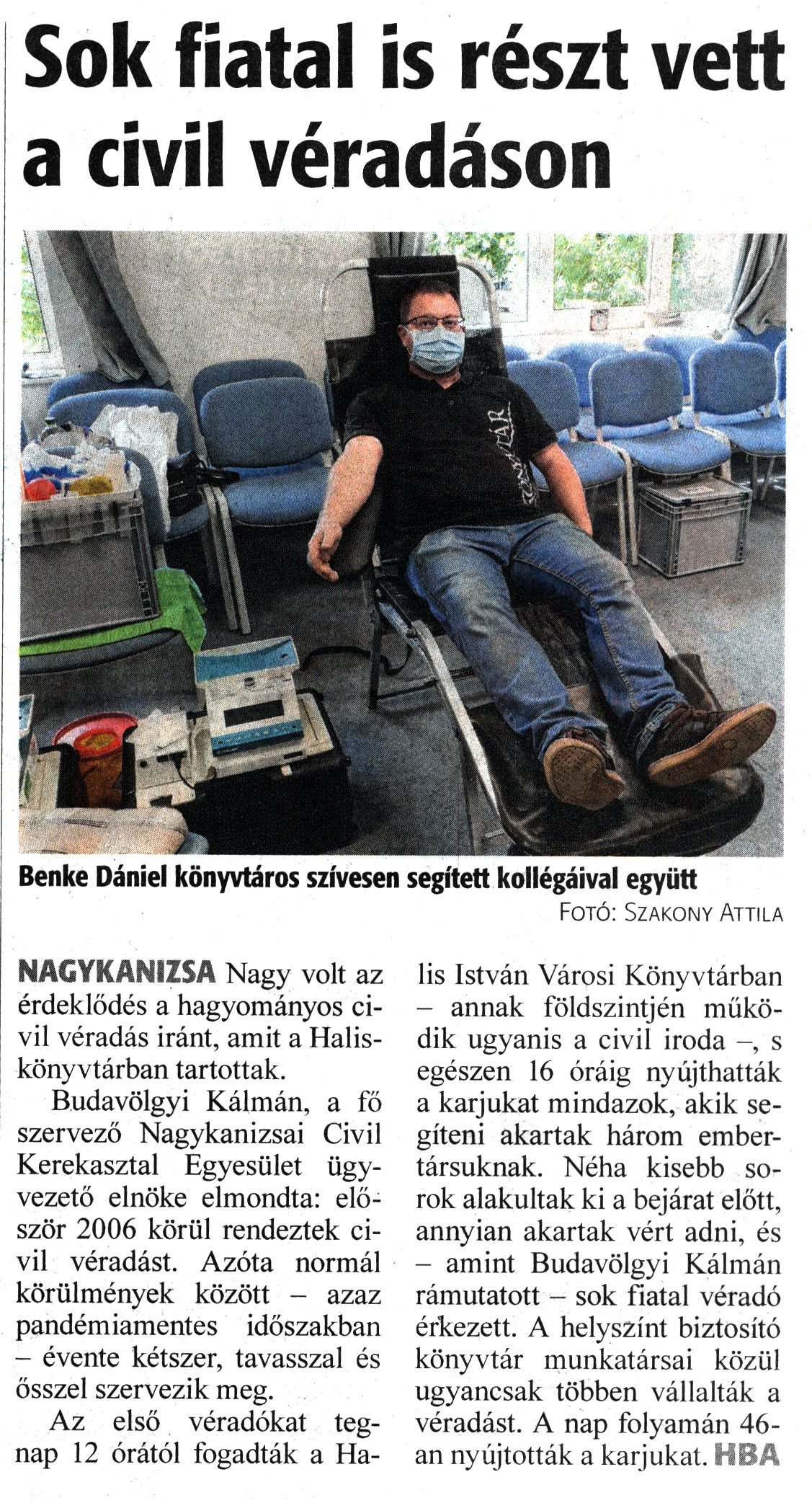 Nyilvános 1271 | 1645 | Zalai Hírlap 2022. május 14. 111. szám 1. oldal | Sok fiatal is részt vett a civil véradáson NAGYKANIZSA Nagy volt az érdeklődés a hagyományos civil véradás iránt, amit a Halis-könyvtárban tartottak. Budavölgyi Kálmán, a fő szervező Nagykanizsai Civil Kerekasztal Egyesület ügyvezető elnöke elmondta: először 2006 körül rendeztek civil véradást. Azóta normál körülmények között - azaz pandémiamentes időszakban - évente kétszer, tavasszal és ősszel szervezik meg. Az első véradókat tegnap 12 órától fogadták a Halis István Városi Könyvtárban - annak földszintjén működik ugyanis a civil iroda -, s egészen 16 óráig nyújthatták a karjukat mindazok, akik segíteni akartak három embertársuknak. Néha kisebb sorok alakultak ki a bejárat előtt, annyian akartak vért adni, és - amint Budavölgyi Kálmán rámutatott - sok fiatal véradó érkezett. A helyszínt biztosító könyvtár munkatársai közül ugyancsak többen vállalták a véradást. A nap folyamán 46-an nyújtották a karjukat. HBA Benke Dániel könyvtáros szívesen segített kollégáival együtt Fotó: Szakony Attila |