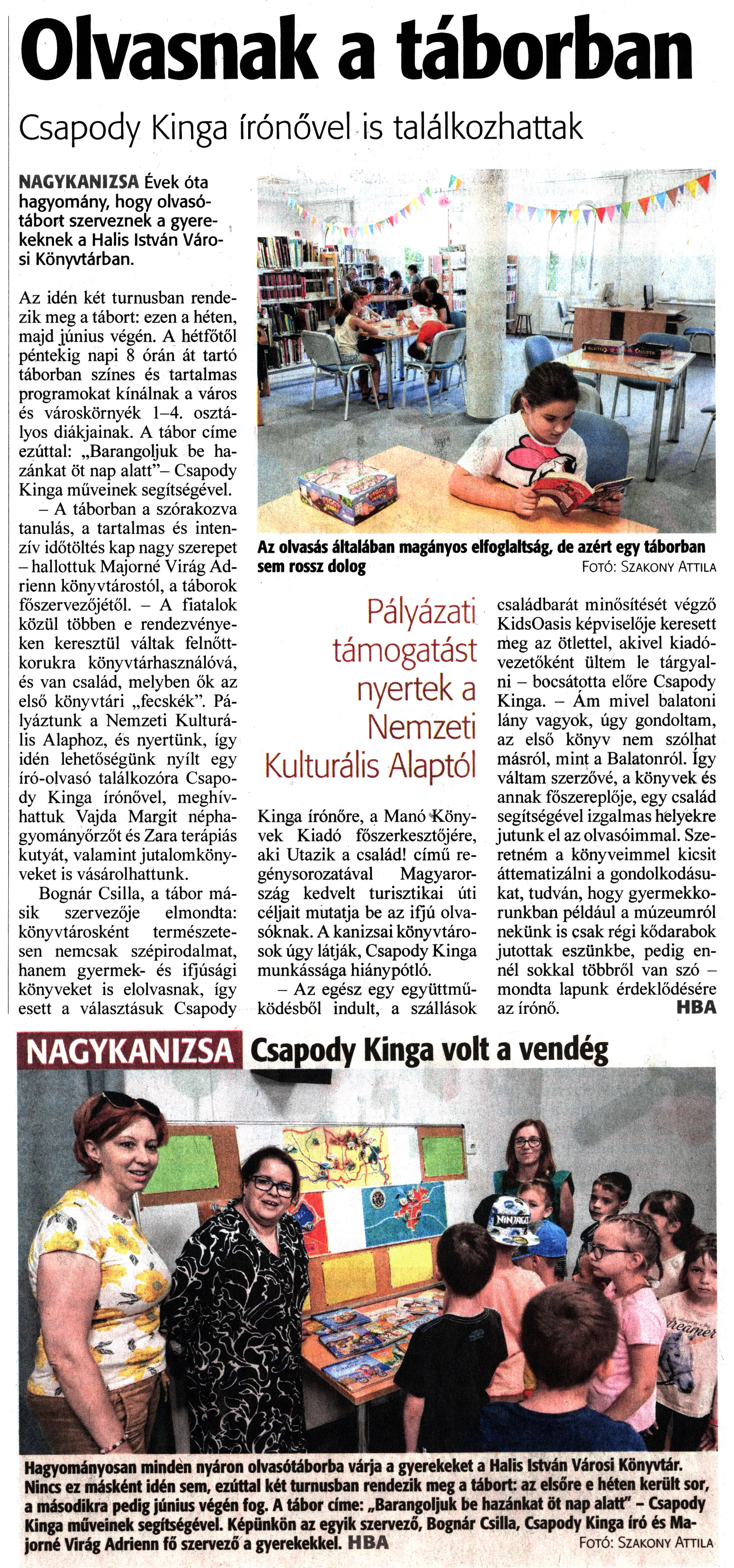 Nyilvános 1318 | 1862 | Zalai Hírlap 2022. június 25. 146. szám 1, 3. oldal | Olvasnak a táborban Csapody Kinga írónővel is találkozhattak Az olvasás általában magányos elfoglaltság, de azért egy táborban sem rossz dolog Fotó: Szakony Attila NAGYKANIZSA Évek óta hagyomány, hogy olvasótábort szerveznek a gyerekeknek a Halis István Városi Könyvtárban. Az idén két turnusban rendezik meg a tábort: ezen a héten, majd június végén. A hétfőtől péntekig napi 8 órán át tartó táborban színes és tartalmas programokat kínálnak a város és városkörnyék 1-4. osztályos diákjainak. A tábor címe ezúttal: „Barangoljuk be hazánkat öt nap alatt"- Csapody Kinga műveinek segítségével. - A táborban a szórakozva tanulás, a tartalmas és intenzív időtöltés kap nagy szerepet - hallottuk Majomé Virág Adrienn könyvtárostól, a táborok főszervezőjétől. - A fiatalok közül többen e rendezvényeken keresztül váltak felnőttkorukra könyvtárhasználóvá, és van család, melyben ők az első könyvtári „fecskék". Pályáztunk a Nemzeti Kulturális Alaphoz, és nyertünk, így idén lehetőségünk nyílt egy író-olvasó találkozóra Csapody Kinga írónővel, meghívhattuk Vajda Margit néphagyományőrzőt és Zara terápiás kutyát, valamint jutalomkönyveket is vásárolhattunk. Bognár Csilla, a tábor másik szervezője elmondta: könyvtárosként természetesen nemcsak szépirodalmat, hanem gyermek- és ifjúsági könyveket is elolvasnak, így esett a választásuk Csapody Kinga írónőre, a Manó Könyvek Kiadó főszerkesztőjére, aki Utazik a család! című regénysorozatával Magyarország kedvelt turisztikai úti céljait mutatja be az ifjú olvasóknak. A kanizsai könyvtárosok úgy látják, Csapody Kinga munkássága hiánypótló. - Az egész egy együttműködésből indult, a szállások családbarát minősítését végző KidsOasis képviselője keresett meg az ötlettel, akivel kiadóvezetőként ültem le tárgyalni - bocsátotta előre Csapody Kinga. - Ám mivel balatoni lány vagyok, úgy gondoltam, az első könyv nem szólhat másról, mint a Balatonról. így váltam szerzővé, a könyvek és annak főszereplője, egy család segítségével izgalmas helyekre jutunk el az olvasóimmal. Szeretném a könyveimmel kicsit áttematizálni a gondolkodásukat, tudván, hogy gyermekkorunkban például a múzeumról nekünk is csak régi kődarabok jutottak eszünkbe, pedig ennél sokkal többről van szó -mondta lapunk érdeklődésére az írónő. HBA Csapody Kinga volt a vendég Hagyományosan minden nyáron olvasótáborba várja a gyerekeket a Halis István Városi Könyvtár. Nincs ez másként idén sem, ezúttal két turnusban rendezik meg a tábort: az elsőre e héten került sor, a másodikra pedig június végén fog. A tábor címe: „Barangoljuk be hazánkat öt nap alatt" - Csapody Kinga műveinek segítségével. Képünkön az egyik szervező, Bognár Csilla, Csapody Kinga író és Majomé Virág Adrienn fő szervező a gyerekekkel. HBA Fotó: Szakony Attila |