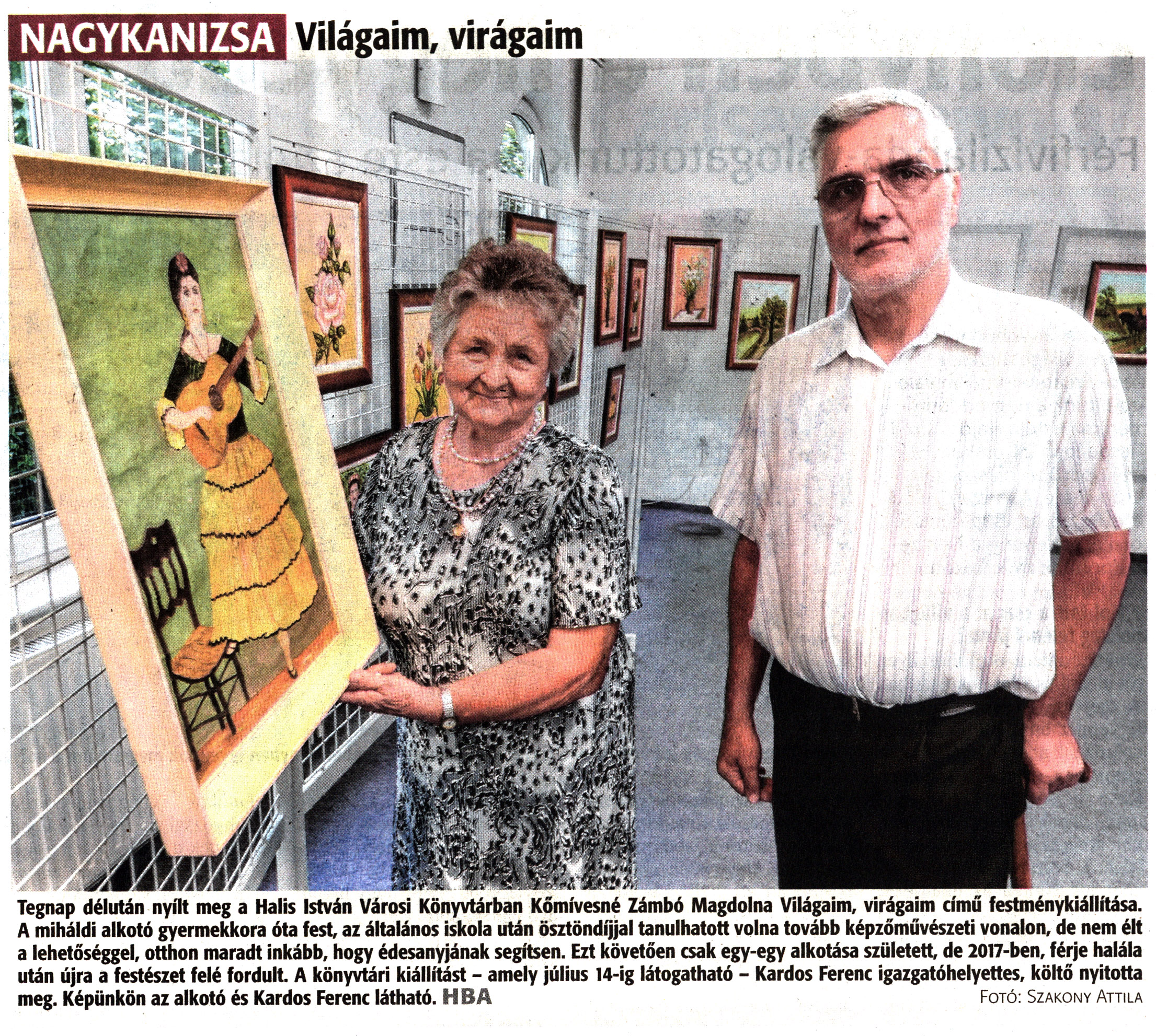 Nyilvános 1226 | 1570 | Zalai Hírlap 2022. június 29. 149. szám 16. oldal | NAGYKANIZSA Világaim, virágaim Tegnap délután nyílt meg a Halis István Városi Könyvtárban Kőmívesné Zámbó Magdolna Világaim, virágaim című festménykiállítása. A miháldi alkotó gyermekkora óta fest, az általános iskola után ösztöndíjjal tanulhatott volna tovább képzőművészeti vonalon, de nem élt a lehetőséggel, otthon maradt inkább, hogy édesanyjának segítsen. Ezt követően csak egy-egy alkotása született, de 2017-ben, férje halála után újra a festészet felé fordult. A könyvtári kiállítást - amely július 14-ig látogatható - Kardos Ferenc igazgatóhelyettes, költő nyitotta meg. Képünkön az alkotó és Kardos Ferenc látható. HBA Fotó: Szakony Attila |
