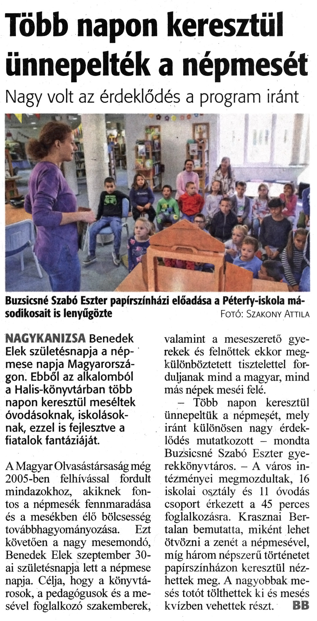 Nyilvános 1143 | 1352 | Zalai Hírlap 2022. október 6. 233. szám 1. oldal | Több napon keresztül ünnepelték a népmesét Nagy volt az érdeklődés a program iránt Buzsicsné Szabó Eszter papírszínházi előadása a Péterfy-iskola másodikosait is lenyűgözte Fotó: Szakony Attila NAGYKANIZSA Benedek Elek születésnapja a népmese napja Magyarországon. Ebből az alkalomból a Halis-könyvtárban több napon keresztül meséltek óvodásoknak, iskolásoknak, ezzel is fejlesztve a fiatalok fantáziáját. A Magyar Olvasástársaság még 2005-ben felhívással fordult mindazokhoz, akiknek fontos a népmesék fennmaradása és a mesékben élő bölcsesség továbbhagyományozása. Ezt követően a nagy mesemondó, Benedek Elek szeptember 30-ai születésnapja lett a népmese napja. Célja, hogy a könyvtárosok, a pedagógusok és a mesével foglalkozó szakemberek, valamint a meseszerető gyerekek és felnőttek ekkor megkülönböztetett tisztelettel forduljanak mind a magyar, mind más népek meséi felé. - Több napon keresztül ünnepeltük a népmesét, mely iránt különösen nagy érdeklődés mutatkozott - mondta Buzsicsné Szabó Eszter gyerekkönyvtáros. - A város intézményei megmozdultak, 16 iskolai osztály és 11 óvodás csoport érkezett a 45 perces foglalkozásra. Krasznai Bertalan bemutatta, miként lehet ötvözni a zenét a népmesével, míg három népszerű történetet papírszínházon keresztül nézhettek meg. A nagyobbak mesés totót tölthettek ki és mesés kvízben vehettek részt. BB |