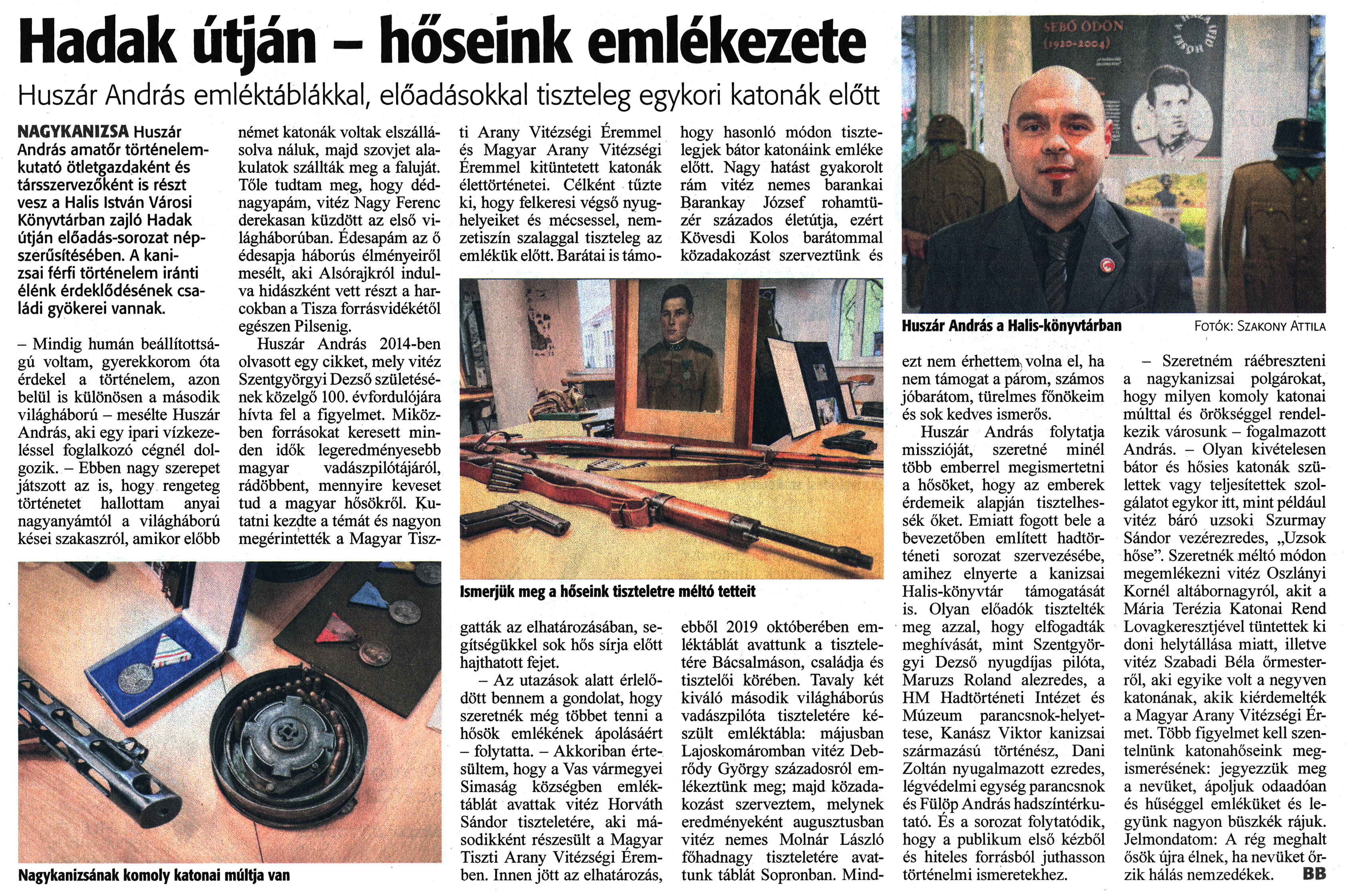 Nyilvános 1205 | 1612 | Zalai Hírlap 2023. február 8. 33. szám 4. oldal | Hadak útján - hőseink emlékezete Huszár András emléktáblákkal, előadásokkal tiszteleg egykori katonák előtt NAGYKANIZSA Huszár András amatőr történelemkutató ötletgazdaként és társszervezőként is részt vesz a Halis István Városi Könyvtárban zajló Hadak útján előadás-sorozat népszerűsítésében. A kanizsai férfi történelem iránti élénk érdeklődésének családi gyökerei vannak. - Mindig humán beállítottságú voltam, gyerekkorom óta érdekel a történelem, azon belül is különösen a második világháború - mesélte Huszár András, aki egy ipari vízkezeléssel foglalkozó cégnél dolgozik. - Ebben nagy szerepet játszott az is, hogy rengeteg történetet hallottam anyai nagyanyámtól a világháború kései szakaszról, amikor előbb német katonák voltak elszállásolva náluk, majd szovjet alakulatok szállták meg a faluját. Tőle tudtam meg, hogy dédnagyapám, vitéz Nagy Ferenc derekasan küzdött az első világháborúban. Édesapám az ő édesapja háborús élményeiről mesélt, aki Alsórajkról indulva hidászként vett részt a harcokban a Tisza forrásvidékétől egészen Pilsenig. Huszár András 2014-ben olvasott egy cikket, mely vitéz Szentgyörgyi Dezső születésének közelgő 100. évfordulójára hívta fel a figyelmet. Miközben forrásokat keresett minden idők legeredményesebb magyar vadászpilótájáról, rádöbbent, mennyire keveset tud a magyar hősökről. Kutatni kezdte a témát és nagyon megérintették a Magyar Tiszti Arany Vitézségi Éremmel és Magyar Arany Vitézségi Éremmel kitüntetett katonák élettörténetei. Célként tűzte ki, hogy felkeresi végső nyughelyeiket és mécsessel, nemzetiszín szalaggal tiszteleg az emlékük előtt. Barátai is támogatták az elhatározásában, segítségükkel sok hős sírja előtt hajthatott fejet. - Az utazások alatt érlelődött bennem a gondolat, hogy szeretnék még többet tenni a hősök emlékének ápolásáért - folytatta. - Akkoriban értesültem, hogy a Vas vármegyei Simaság községben emléktáblát avattak vitéz Horváth Sándor tiszteletére, aki másodikként részesült a Magyar Tiszti Arany Vitézségi Éremben. Innen jött az elhatározás, hogy hasonló módon tisztelegjek bátor katonáink emléke előtt. Nagy hatást gyakorolt rám vitéz nemes barankai Barankay József rohamtüzér százados életútja, ezért Kövesdi Kolos barátommal közadakozást szerveztünk és ebből 2019 októberében emléktáblát avattunk a tiszteletére Bácsalmáson, családja és tisztelői körében. Tavaly két kiváló második világháborús vadászpilóta tiszteletére készült emléktábla: májusban Lajoskomáromban vitéz Debrődy György századosról emlékeztünk meg; majd közadakozást szerveztem, melynek eredményeként augusztusban vitéz nemes Molnár László főhadnagy tiszteletére avattunk táblát Sopronban. Mindezt nem érhettem, volna el, ha nem támogat a párom, számos jóbarátom, türelmes főnökeim és sok kedves ismerős. Huszár András folytatja misszióját, szeretné minél több emberrel megismertetni a hősöket, hogy az emberek érdemeik alapján tisztelhessék őket. Emiatt fogott bele a bevezetőben említett hadtörténeti sorozat szervezésébe, amihez elnyerte a kanizsai Halis-könyvtár támogatását is. Olyan előadók tisztelték meg azzal, hogy elfogadták meghívását, mint Szentgyörgyi Dezső nyugdíjas pilóta, Maruzs Roland alezredes, a HM Hadtörténeti Intézet és Múzeum parancsnok-helyet-tese, Kanász Viktor kanizsai származású történész, Dani Zoltán nyugalmazott ezredes, légvédelmi egység parancsnok és Fülöp András hadszíntérkutató. És a sorozat folytatódik, hogy a publikum első kézből és hiteles forrásból juthasson történelmi ismeretekhez. Fotók: Szakony Attila - Szeretném ráébreszteni a nagykanizsai polgárokat, hogy milyen komoly katonai múlttal és örökséggel rendelkezik városunk - fogalmazott András. - Olyan kivételesen bátor és hősies katonák születtek vagy teljesítettek szolgálatot egykor itt, mint például vitéz báró uzsoki Szurmay Sándor vezérezredes, „Uzsok hőse". Szeretnék méltó módon megemlékezni vitéz Oszlányi Kornél altábornagyról, akit a Mária Terézia Katonai Rend Lovagkeresztjével tüntettek ki doni helytállása miatt, illetve vitéz Szabadi Béla őrmesterről, aki egyike volt a negyven katonának, akik kiérdemelték a Magyar Arany Vitézségi Érmet. Több figyelmet kell szentelnünk katonahőseink megismerésének: jegyezzük meg a nevüket, ápoljuk odaadóan és hűséggel emléküket és legyünk nagyon büszkék rájuk. Jelmondatom: A rég meghalt ősök újra élnek, ha nevüket őrzik hálás nemzedékek. BB Nagykanizsának komoly katonai múltja van Ismerjük meg a hőseink tiszteletre méltó tetteit |